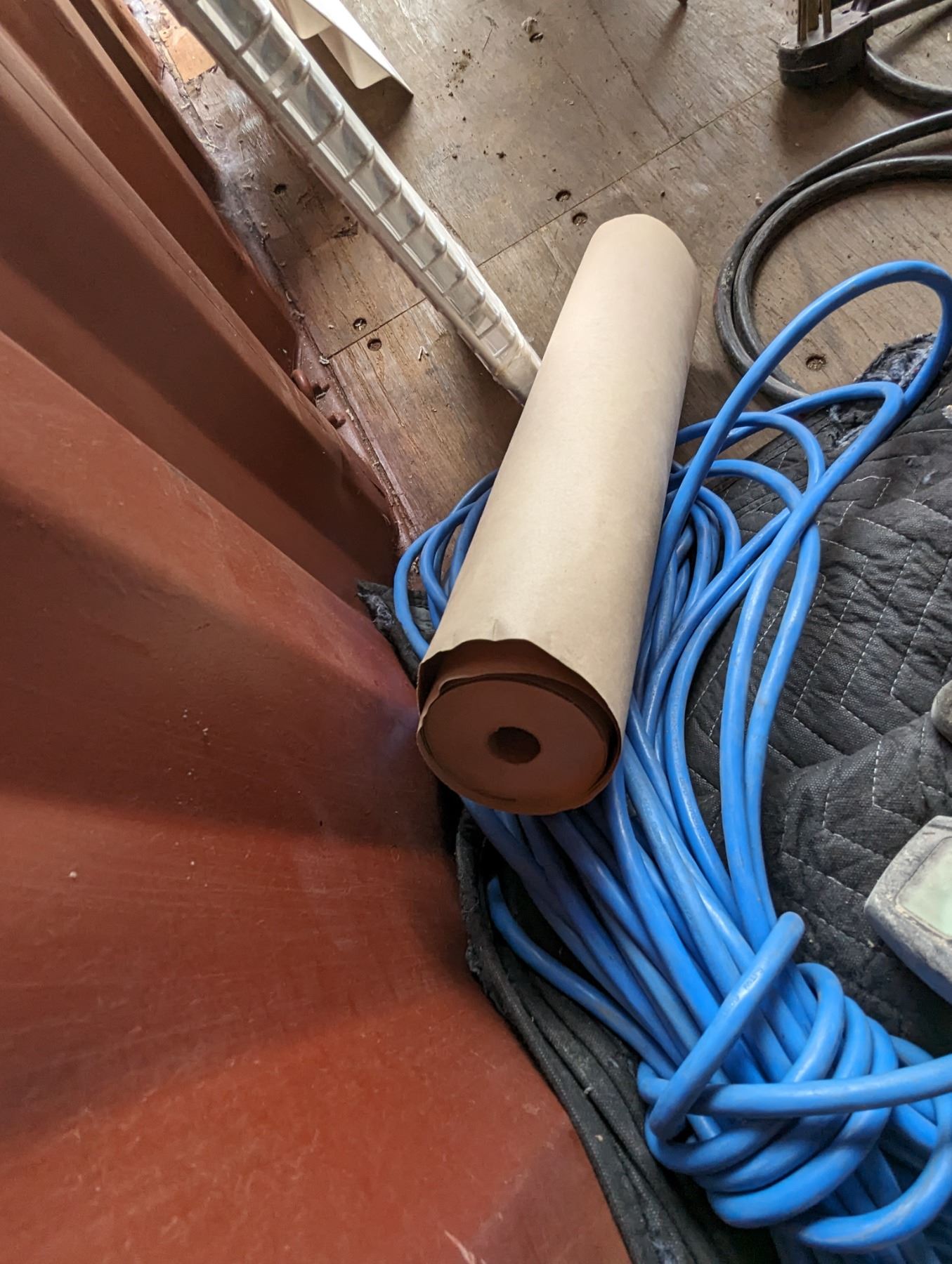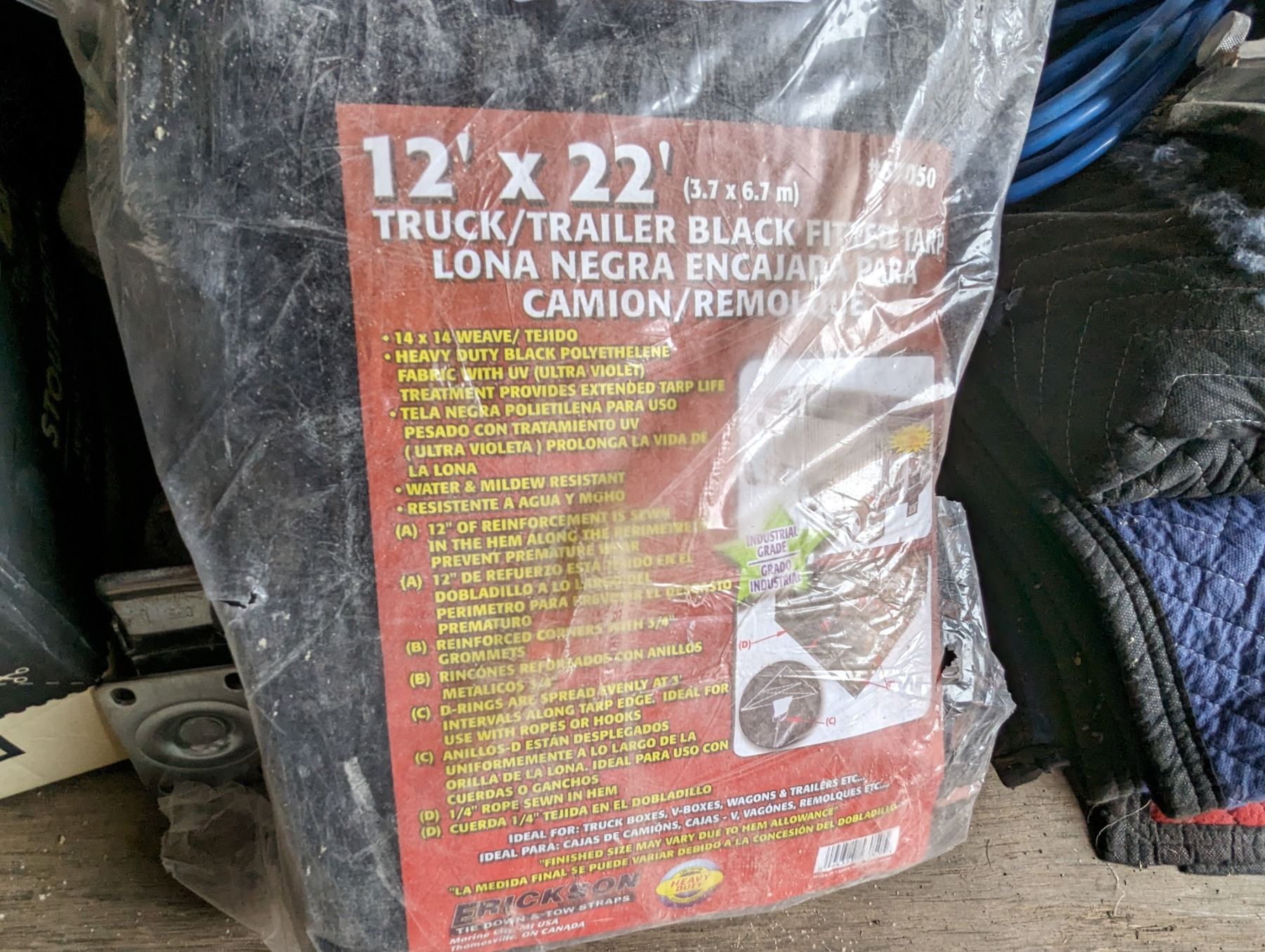 GROUP LOT 12' X 22' FITTED TRAILER TARPS, 3 MOVING PADS, 2' CRAFT PAPER ROLL, 100' BLUE EXTENSION