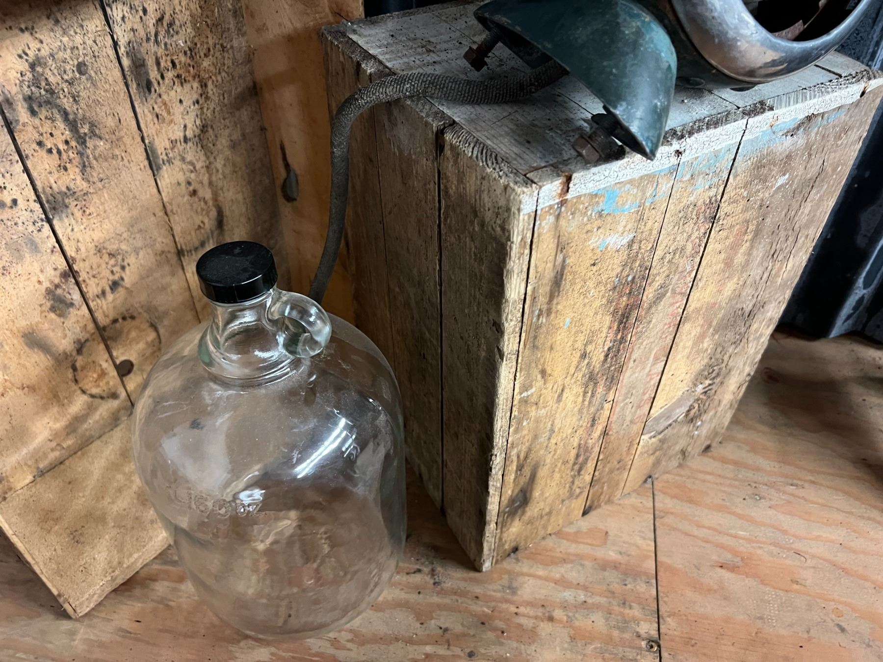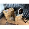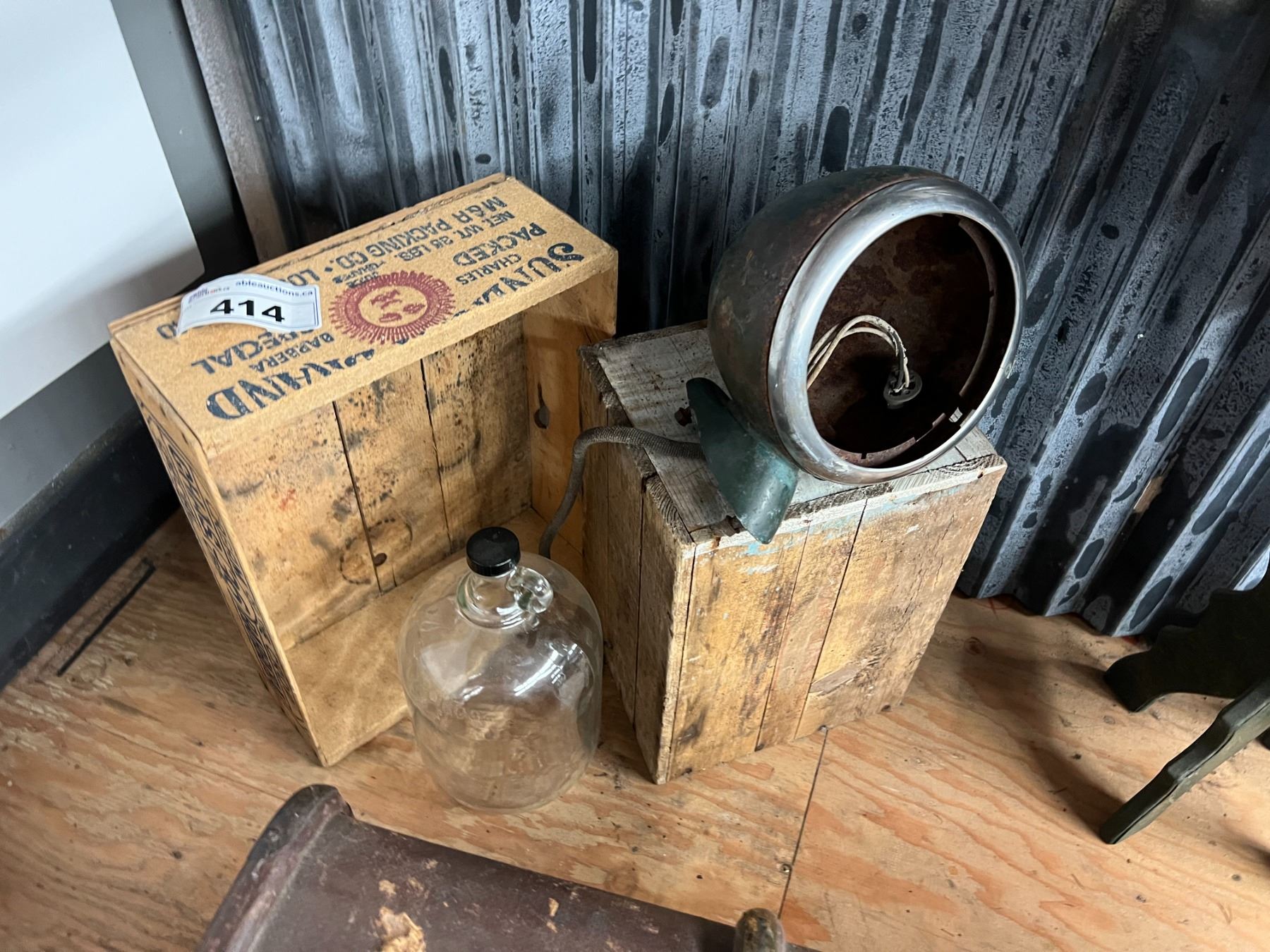 GROUP LOT - 2 ANTIQUE BOXES, HEAD LAMP & JUG