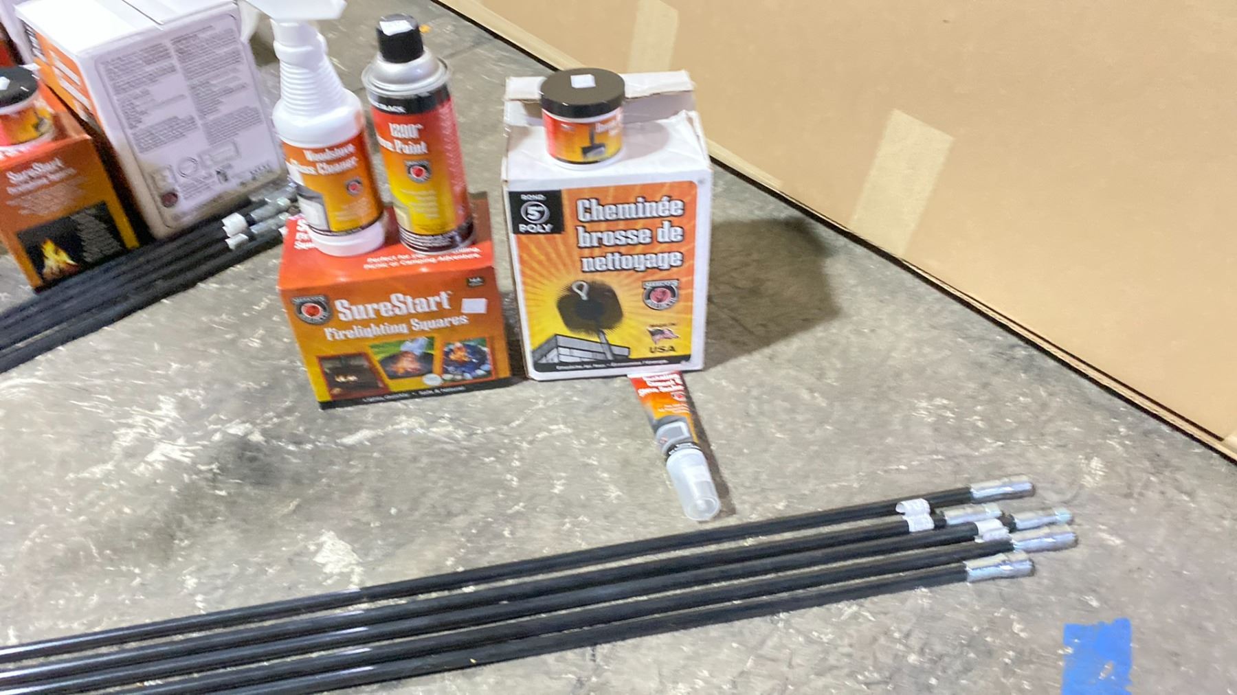 GROUP LOT 5" CHIMNEY CLEANING BRUSH WITH 20' OF POLES, SURESTART FIRELIGHTING SQUARES, WOOD STOVE GLASS CLEANER, BLACK STOVE PAINT, BLACK STOVE POLISH, STOVE SEALER GASKET CEMENT