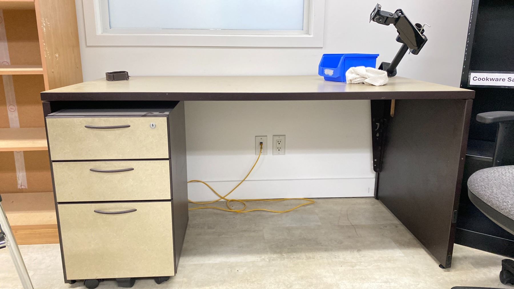 GROUP LOT 60X30" DESK WITH MOBILE PEDESTAL, 2 X 3'X6'H BOOKSHELVES, WOODEN BOOKSHELF AND 3 CHAIRS