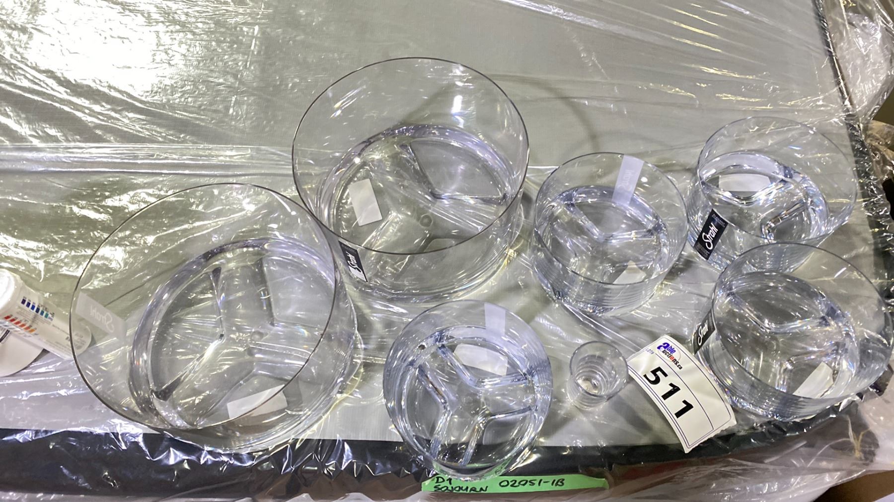 GROUP LOT ACRYLIC BOWLS. 2 LARGE AND 4 SMALL PLUS SHOT GLASS