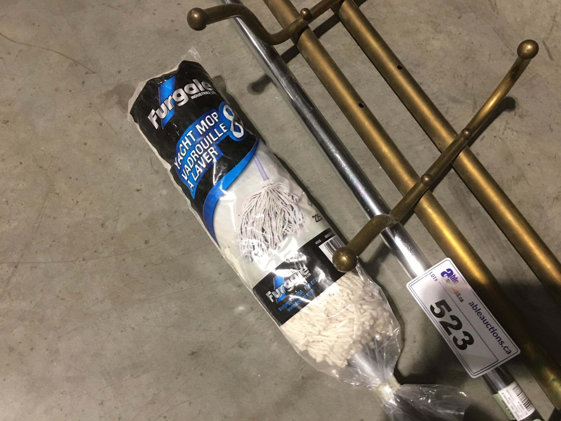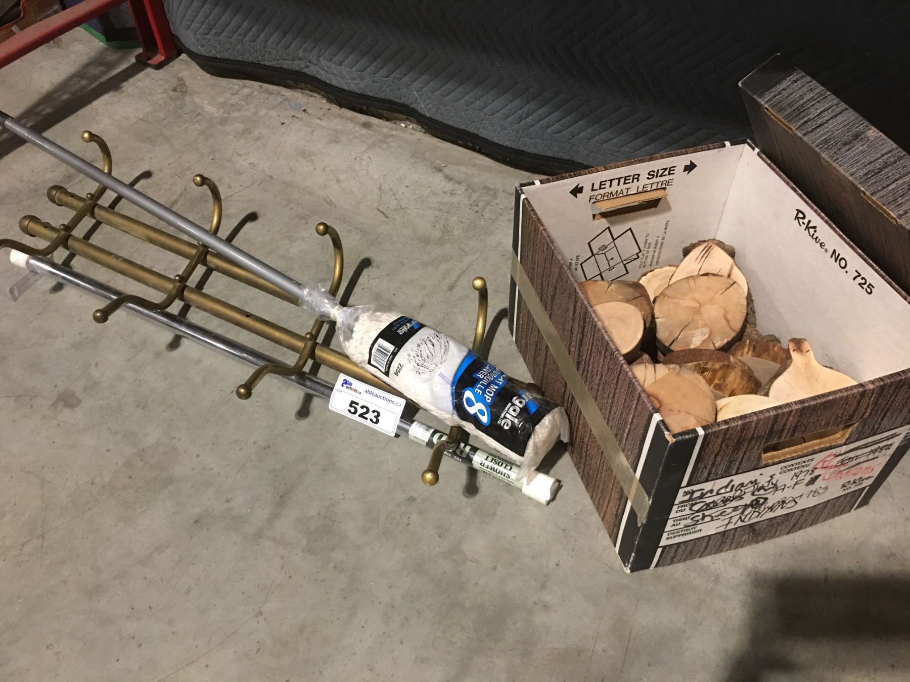 GROUP LOT - ANTIQUE BRASS COAT HOOK SET/SHOWER/CLOSET TENSION ROD/YACHT MOP/BOX OF WOOD PIECES