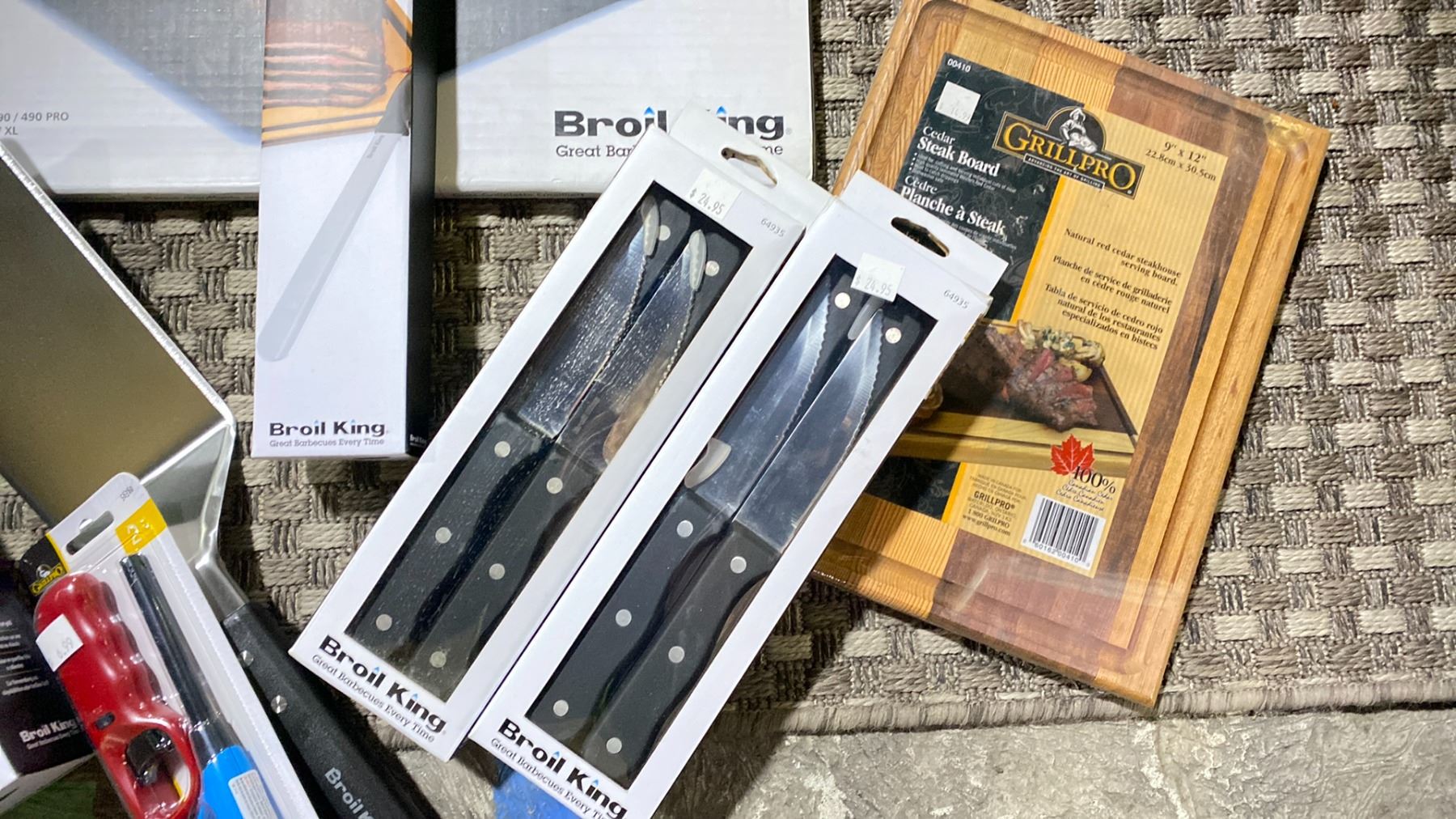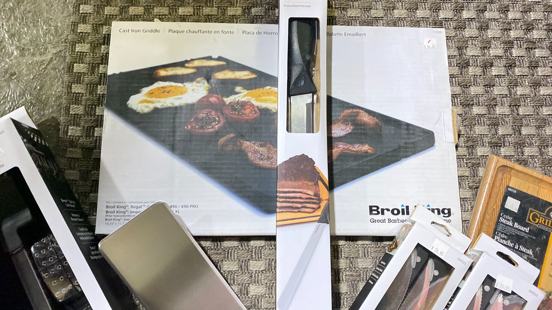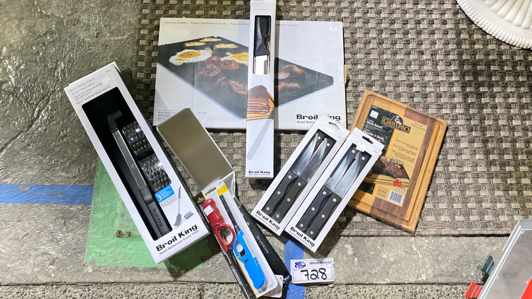 GROUP LOT CAST IRON GRIDDLE, STEAK KNIVES, CARVING KNIFE, CEDAR STEAK BOARD, LARGE SPATULA, BBQ LIGHTERS, CLEANING BRUSH