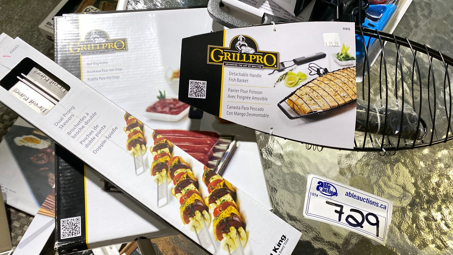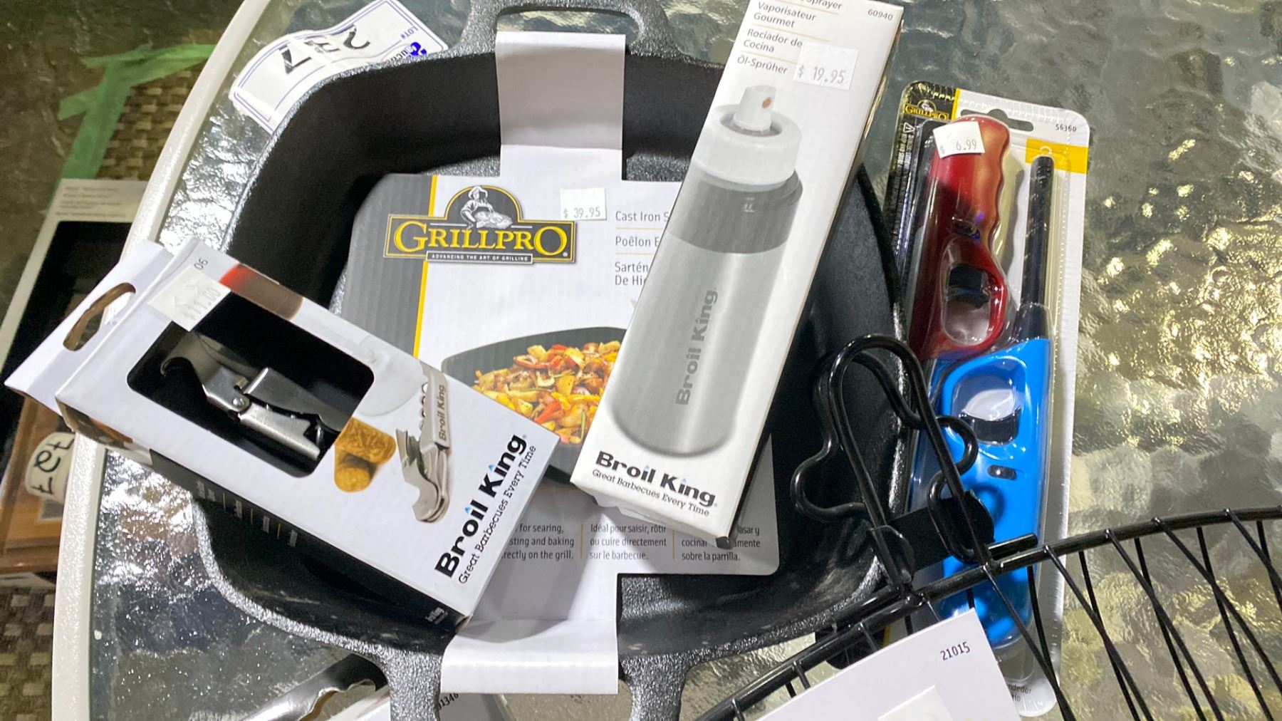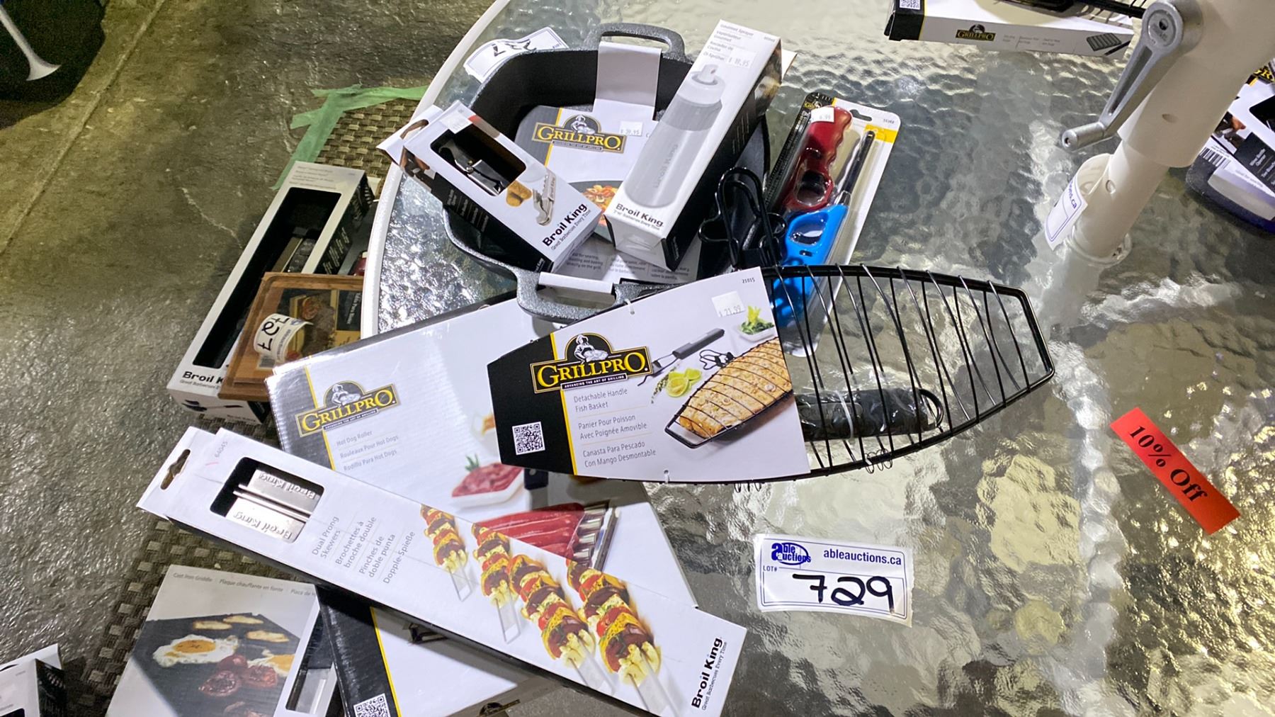 GROUP LOT CAST IRON SKILLET, FISH BASKET, DUAL PRONG SKEWERS, HOT DOG ROLLER, BBQ LIGHTERS, GOURMET SPRAYER, CORKSCREW