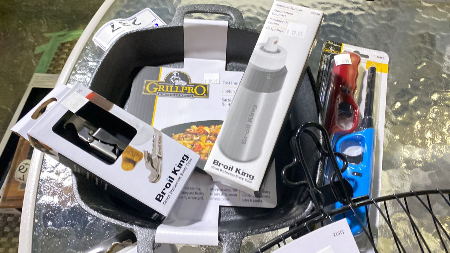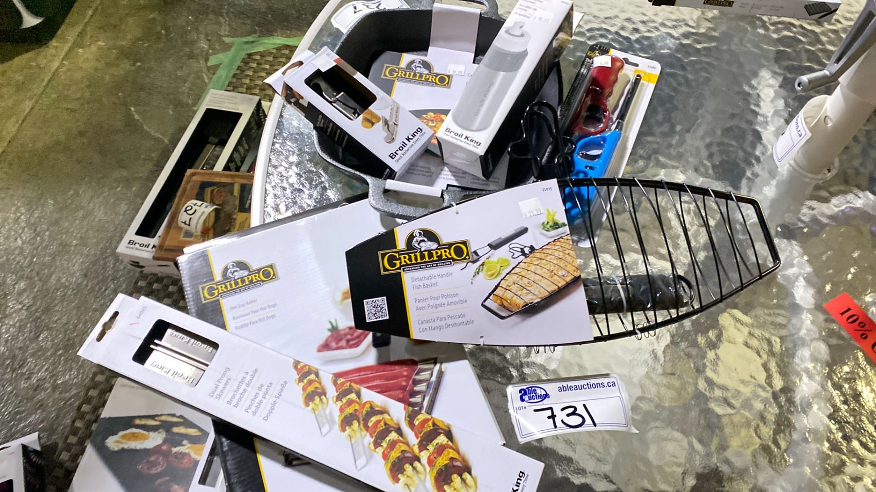 GROUP LOT CAST IRON SKILLET, FISH BASKET, DUAL PRONG SKEWERS, HOT DOG ROLLER, BBQ LIGHTERS, GOURMET SPRAYER, CORKSCREW