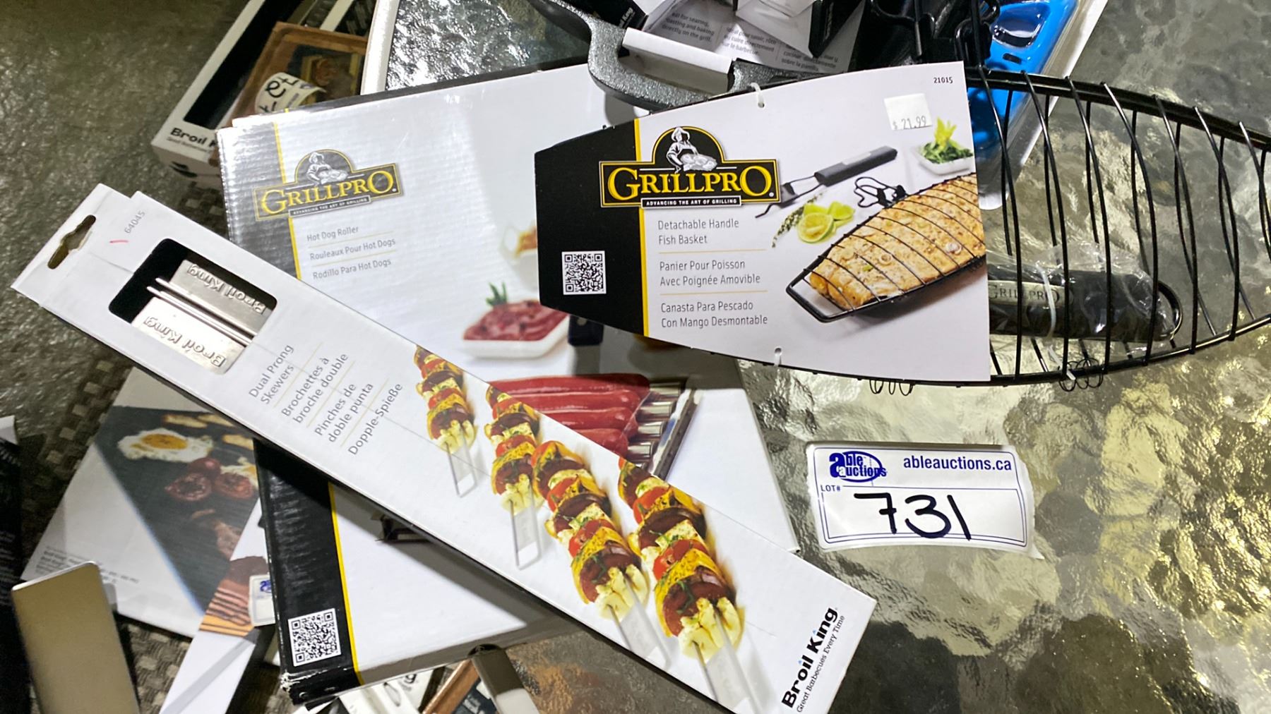 GROUP LOT CAST IRON SKILLET, FISH BASKET, DUAL PRONG SKEWERS, HOT DOG ROLLER, BBQ LIGHTERS, GOURMET