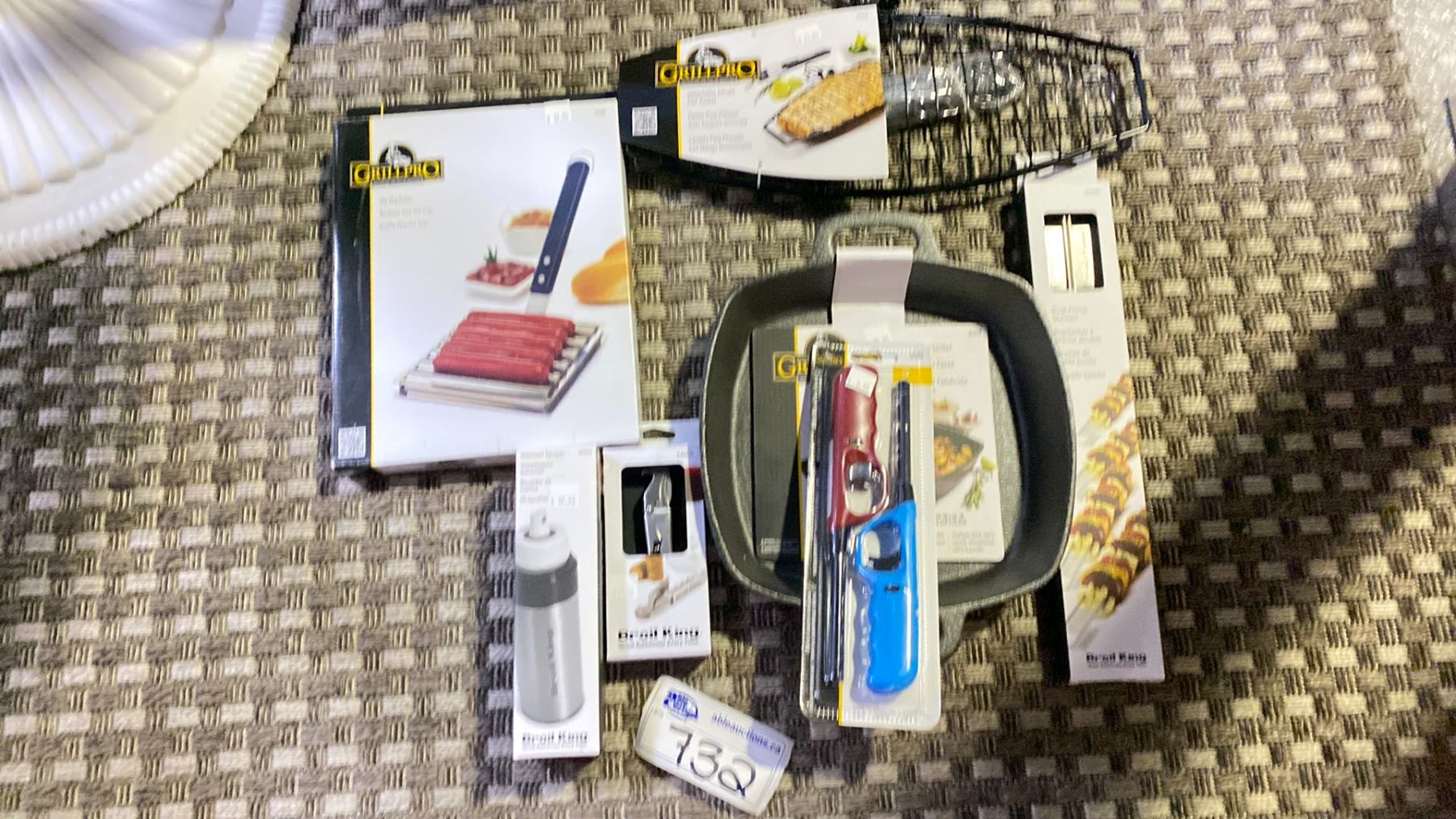 GROUP LOT CAST IRON SKILLET, FISH BASKET, DUAL PRONG SKEWERS, HOT DOG ROLLER, BBQ LIGHTERS, GOURMET SPRAYER, CORKSCREW