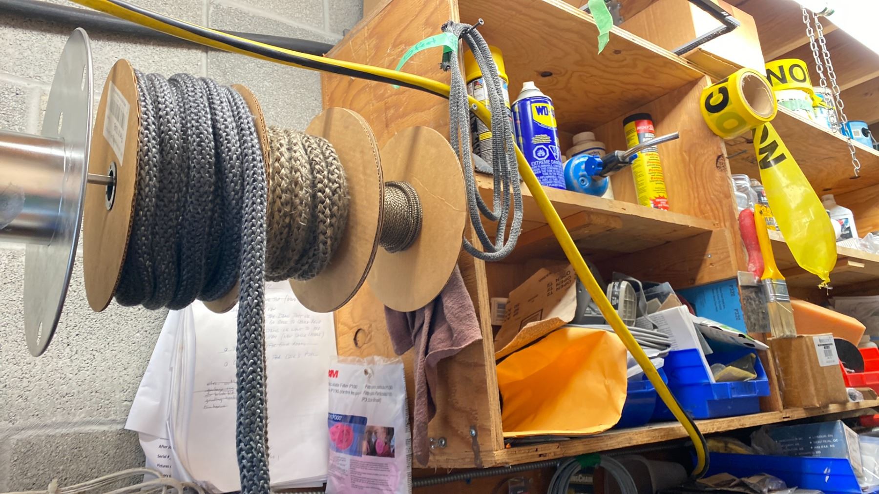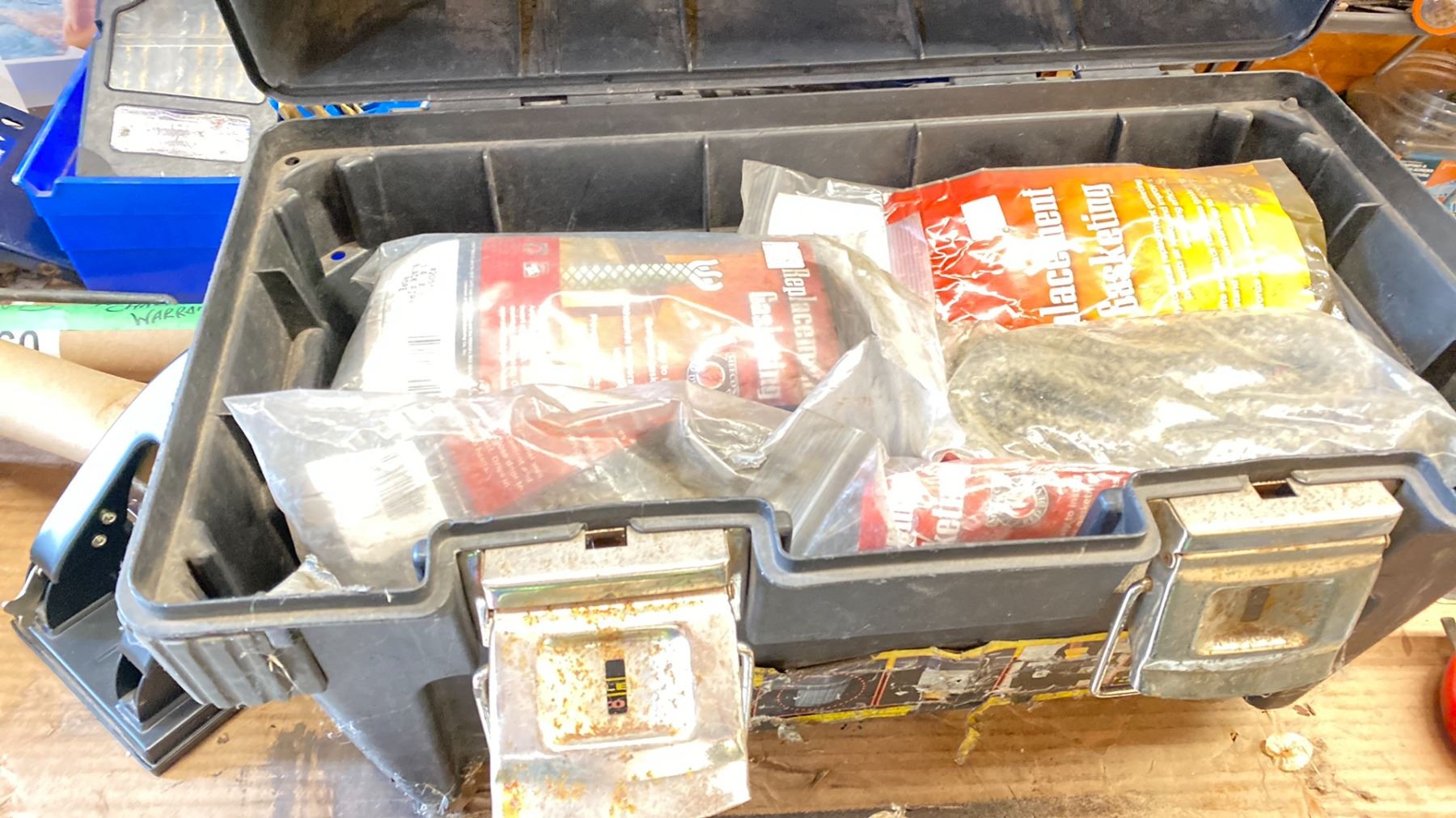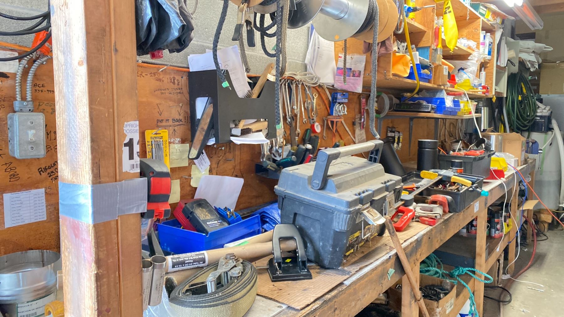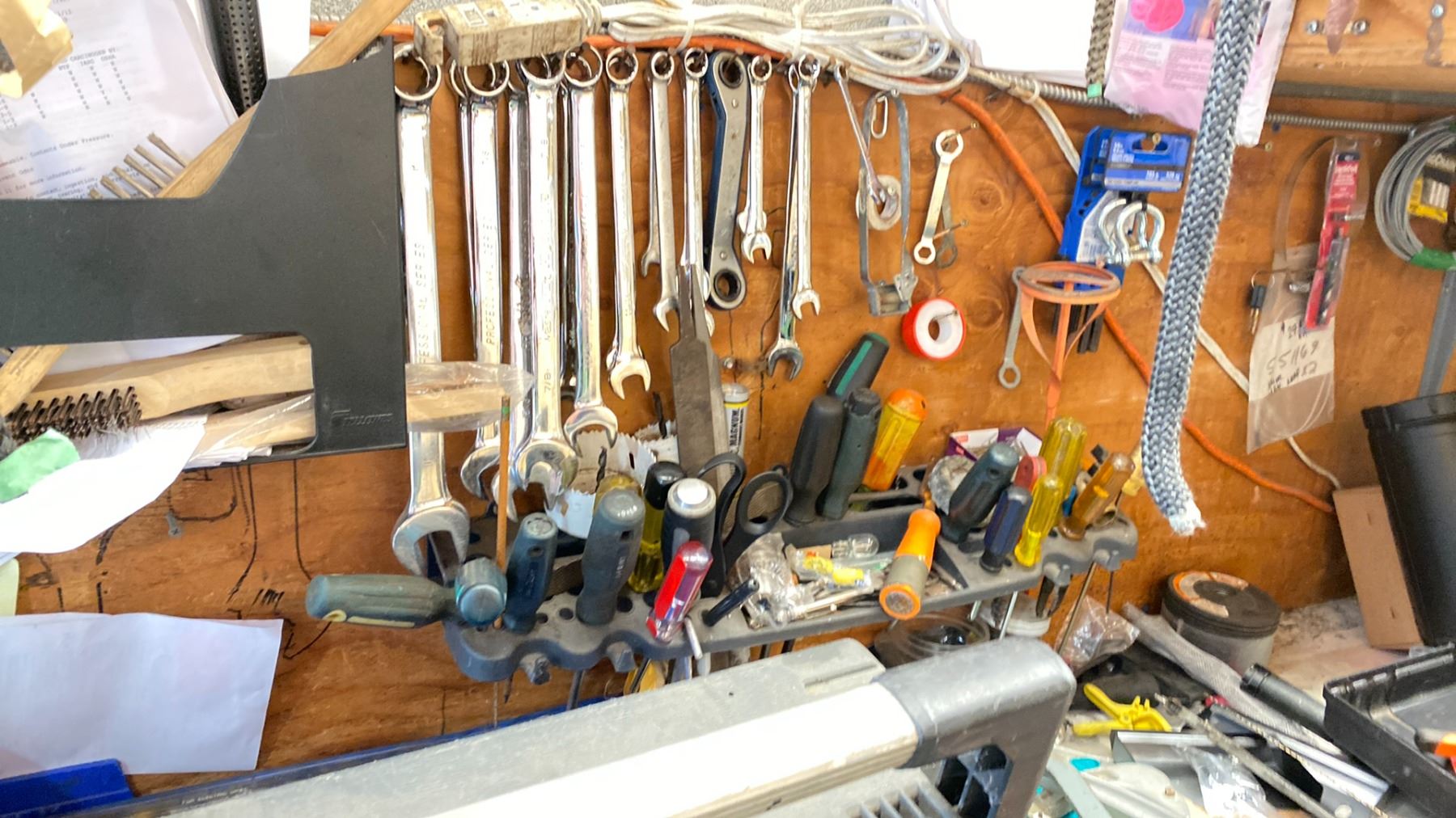 GROUP LOT- CONTENTS OF TOOL BENCH ON WEST WALL. INC PAINTS, COMBINATION WRENCHES, SCREWDRIVERS, DRILL INDEXES, HACKSAWS, 2 FULL TOOLBOXES, RIVET GUNS, PROPANE TORCH, PARTS AND PIECES, AND 6" VICE (BRING TOOL TO REMOVE FROM BENCH). BRING YOUR BOXES