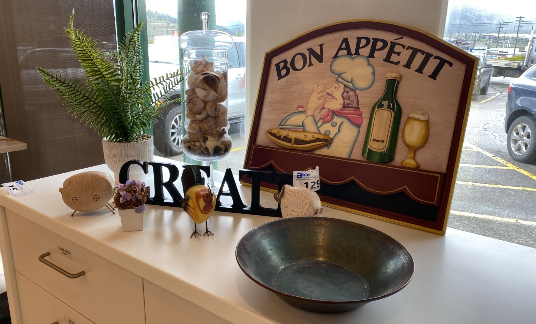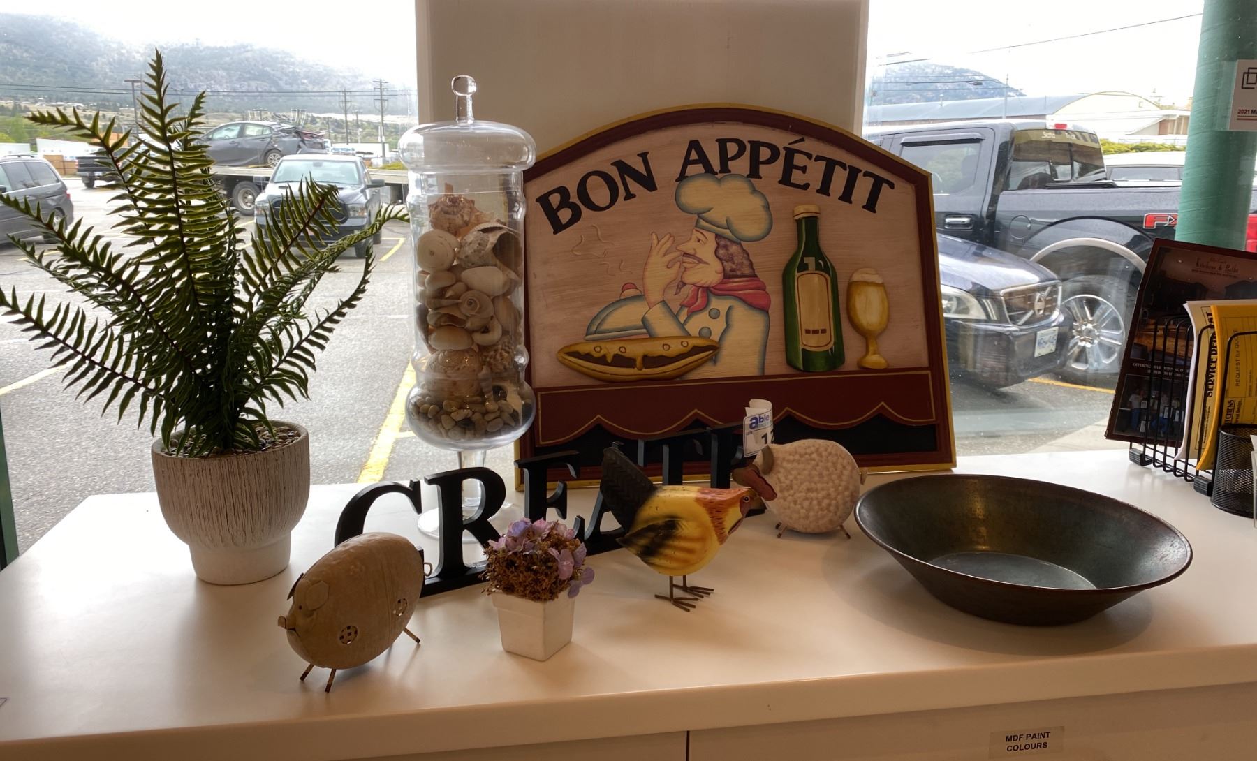 GROUP LOT DECOR. GLASS CONTAINER WITH SHELLS, FERN, SIGN, ASST METAL ANIMALS, SMALL FLOWER, BARKERVILLE KEEPSAKE PAN, BON APPETIT SIGN