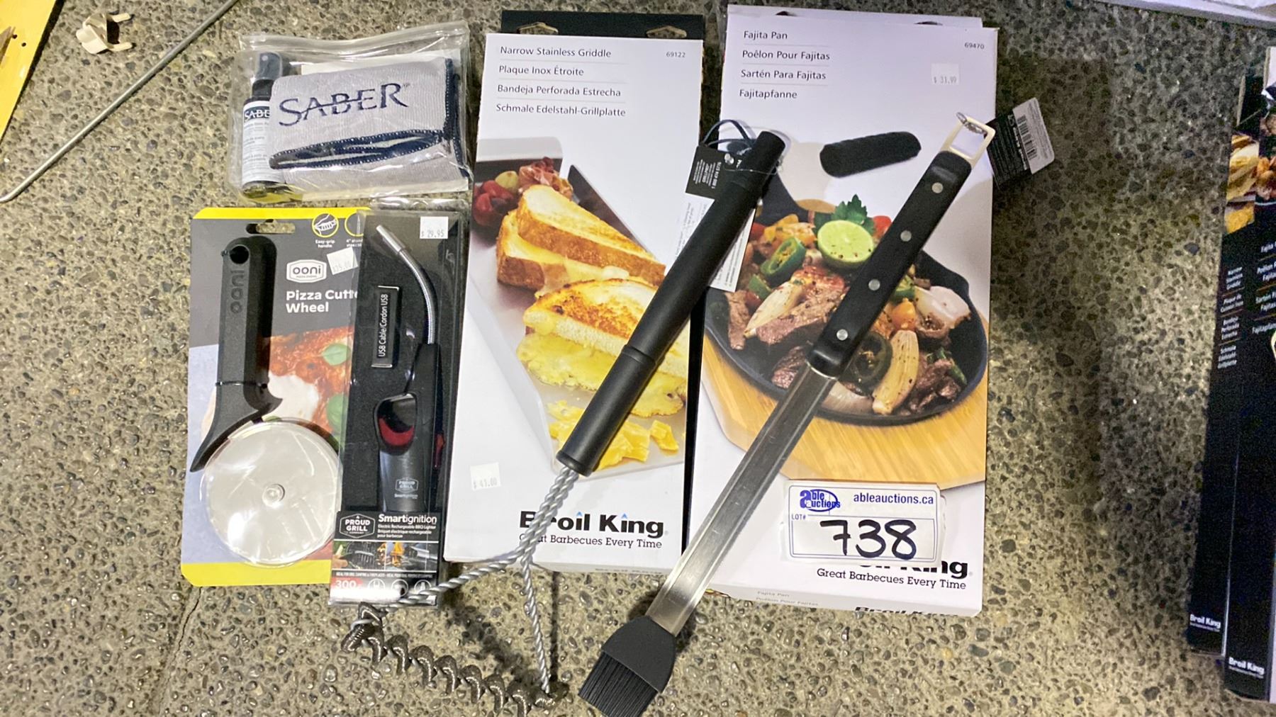 GROUP LOT FAJITA PAN, STAINLESS GRIDDLE, STAINLESS POLISH KIT, PIZZA WHEEL, BBQ LIGHTER, CLEANING BRUSH, LONG BASTER