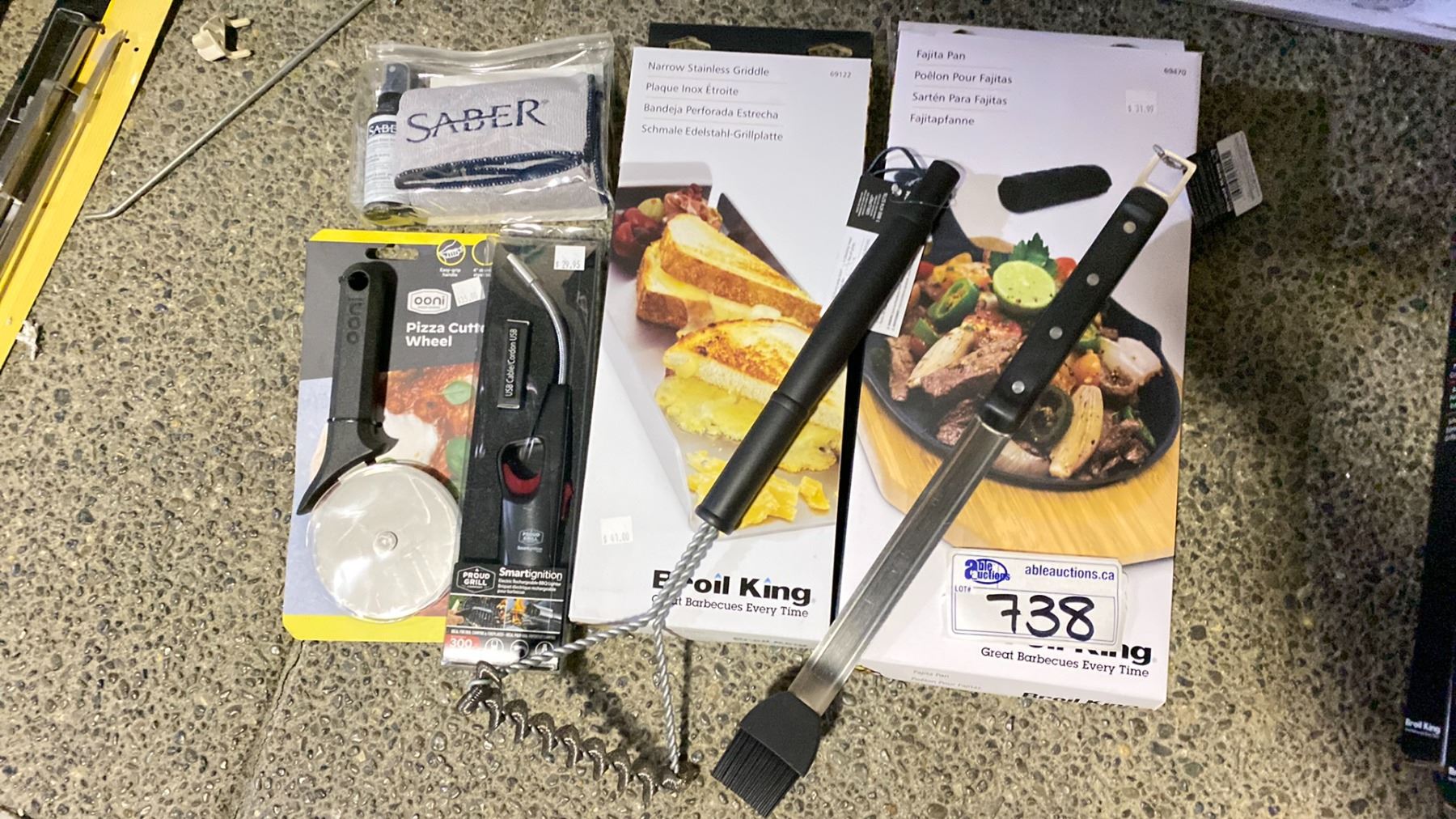 GROUP LOT FAJITA PAN, STAINLESS GRIDDLE, STAINLESS POLISH KIT, PIZZA WHEEL, BBQ LIGHTER, CLEANING BRUSH, LONG BASTER