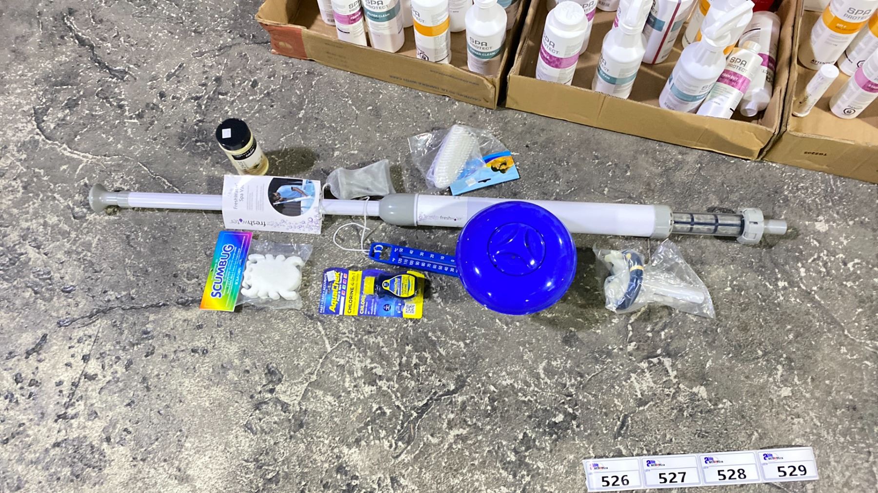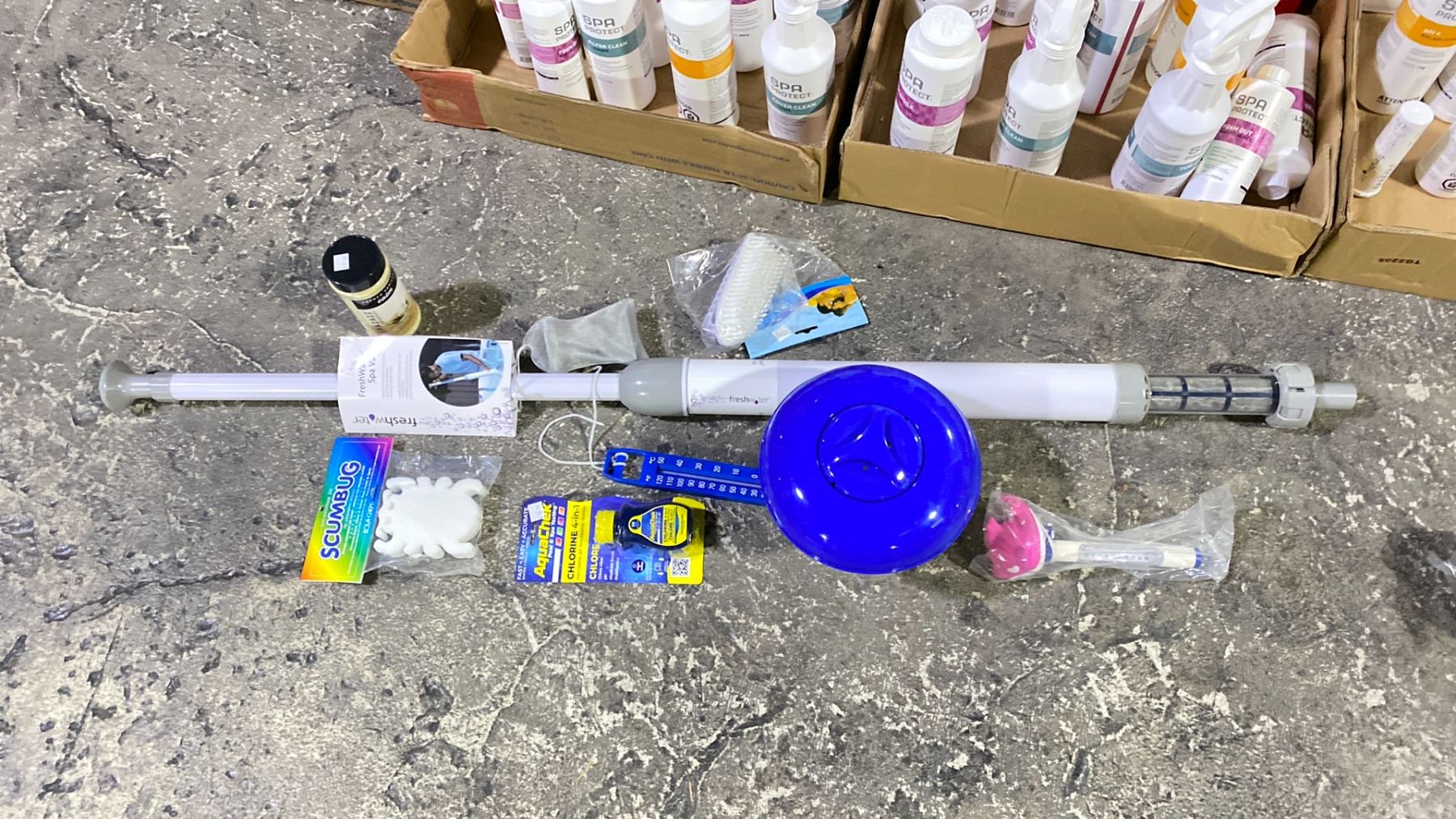GROUP LOT FRESHWATER SPA VAC, FLOATING CHEMICAL DISPENSER, FLOATING THERMOMETER, HANGING THERMOMETER SCUMBUG, BOTTLE OF SCENT, TEST STRIPS, SCRUB BRUSH