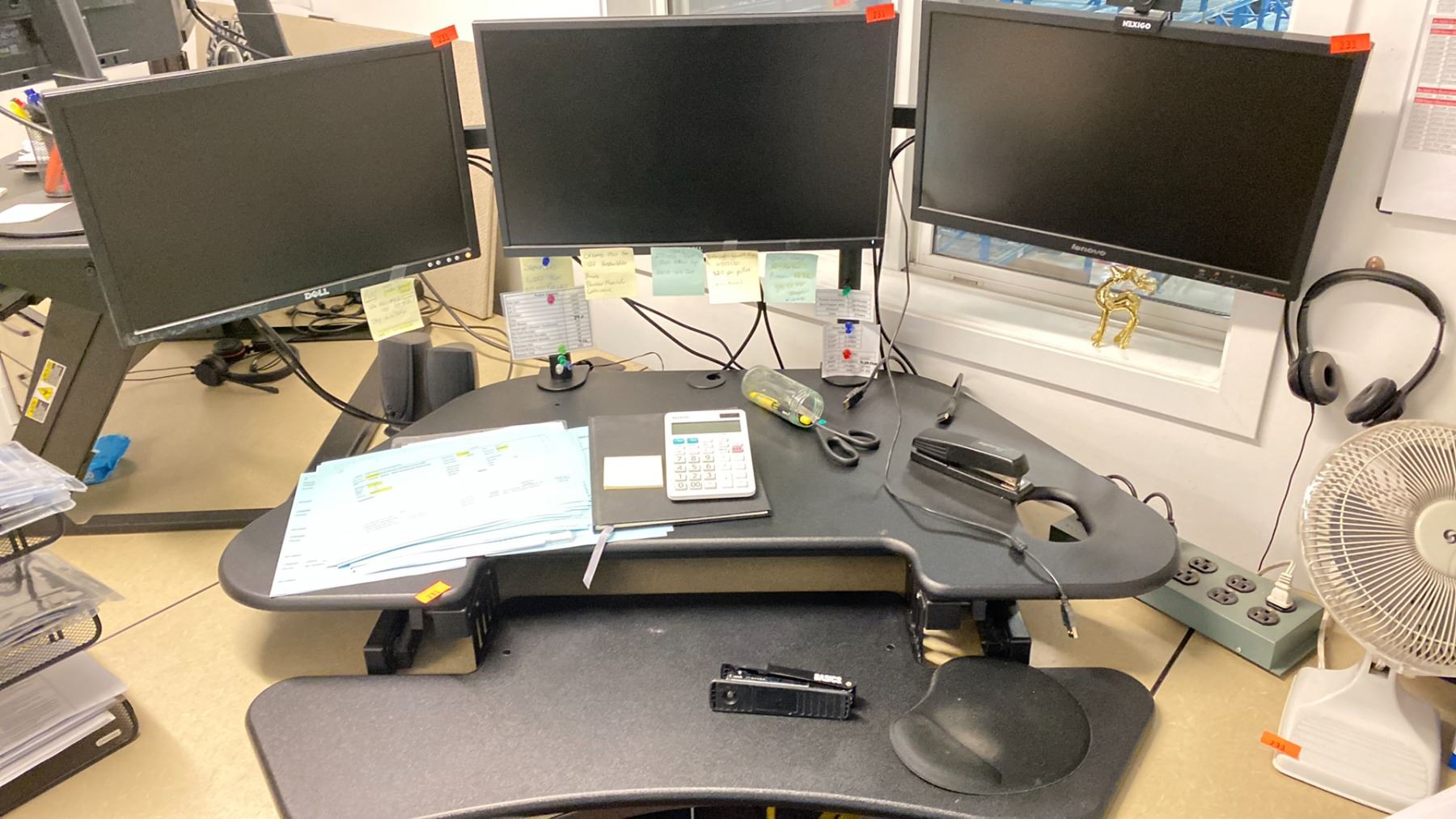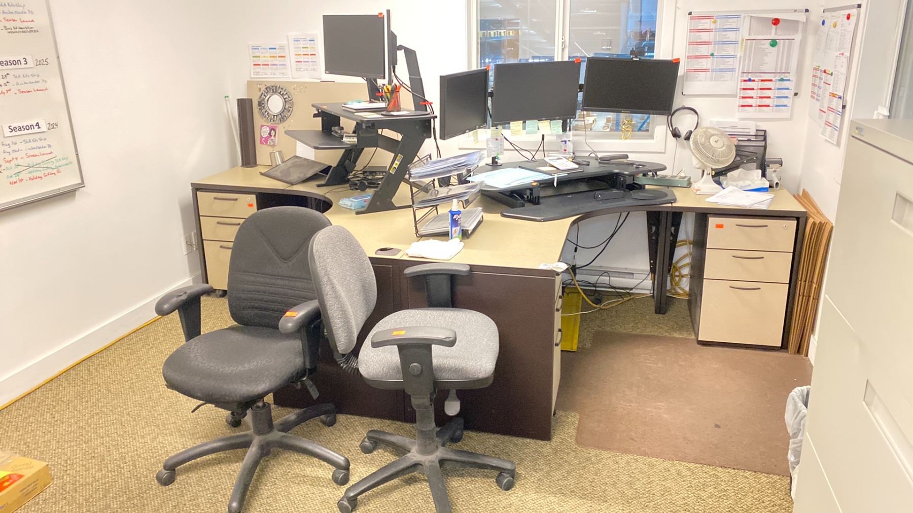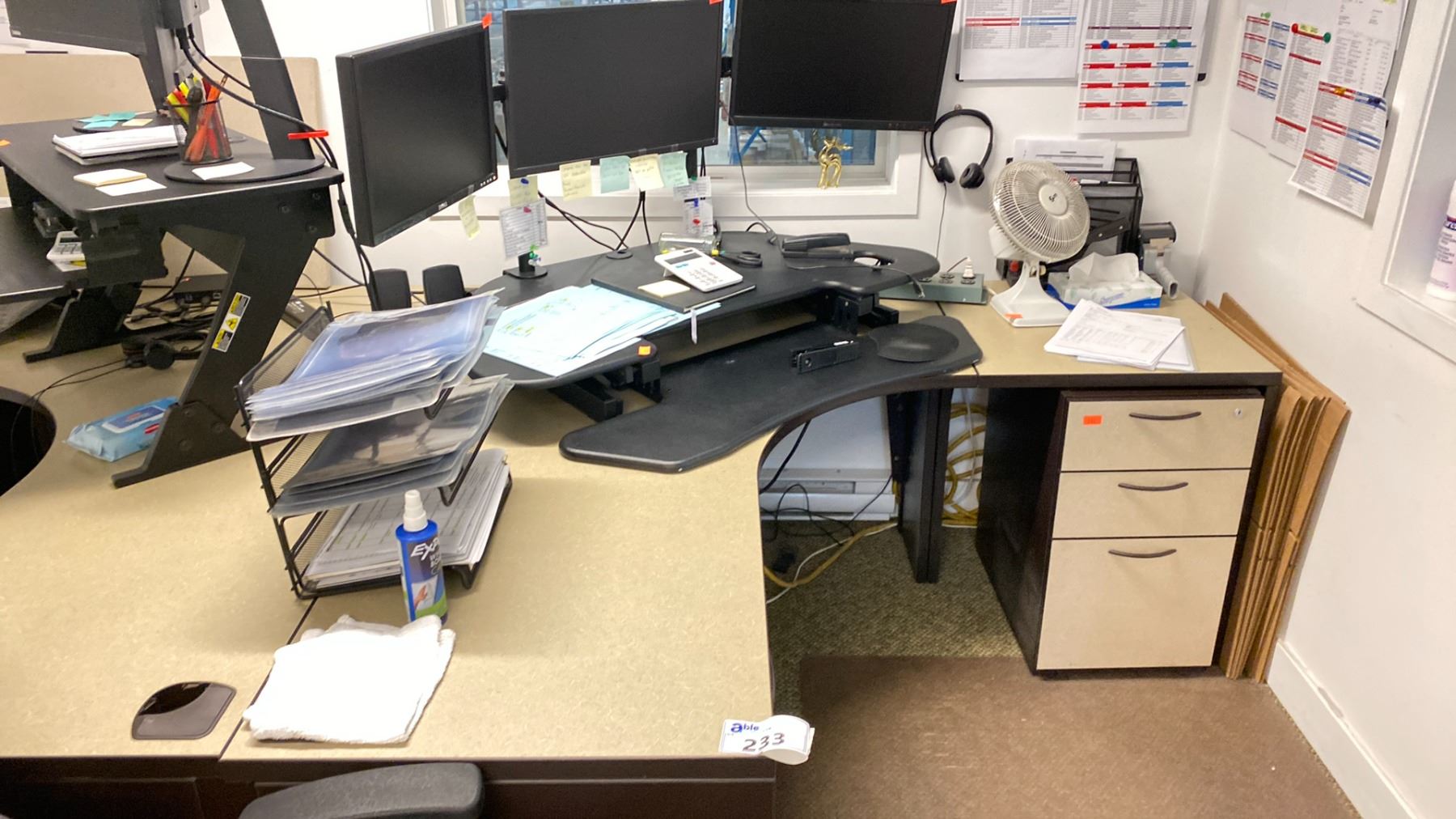 GROUP LOT IN OFFICE A 204. 90" CORNER DESK WITH MOBILE CARTS, POTTED TREE, 2X 66" CORNER DESKS WITH ROLLING CARTS, 5 MONITORS-20",21",23", 2X 24", RISERS, HEADSETS, SPEAKERS, POWER BARS, SIT STAND RISER, SOME OFFICE SUPPLIES, CALCULATORS, STAPLERS, 2 OFFICE CHAIRS