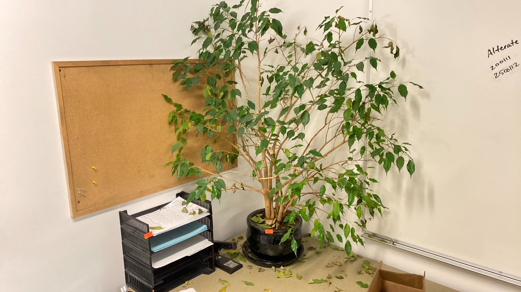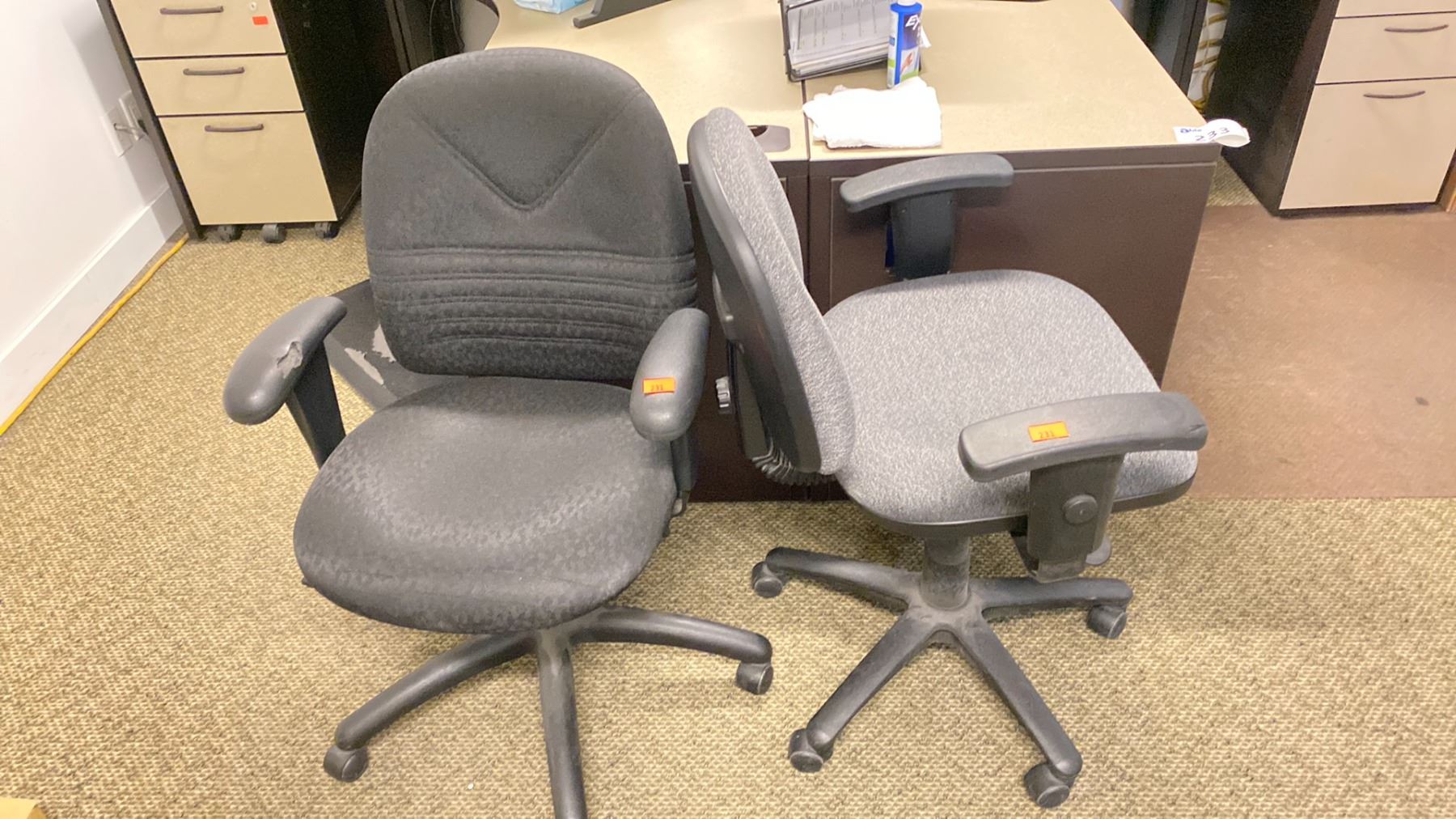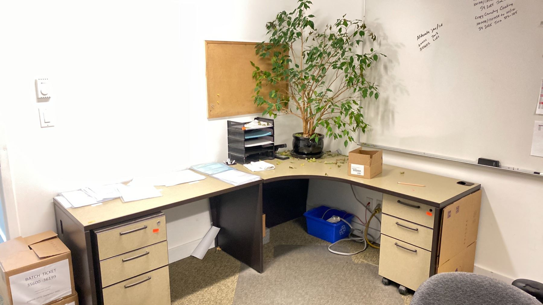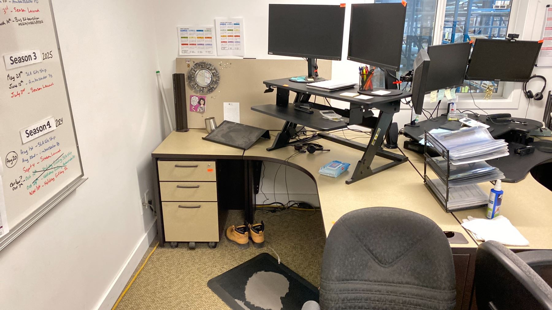 GROUP LOT IN OFFICE A 204. 90" CORNER DESK WITH MOBILE CARTS, POTTED TREE, 2X 66" CORNER DESKS WITH ROLLING CARTS, 5 MONITORS-20",21",23", 2X 24", RISERS, HEADSETS, SPEAKERS, POWER BARS, SIT STAND RISER, SOME OFFICE SUPPLIES, CALCULATORS, STAPLERS, 2 OFFICE CHAIRS