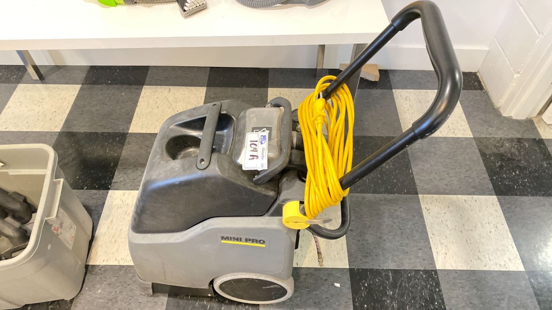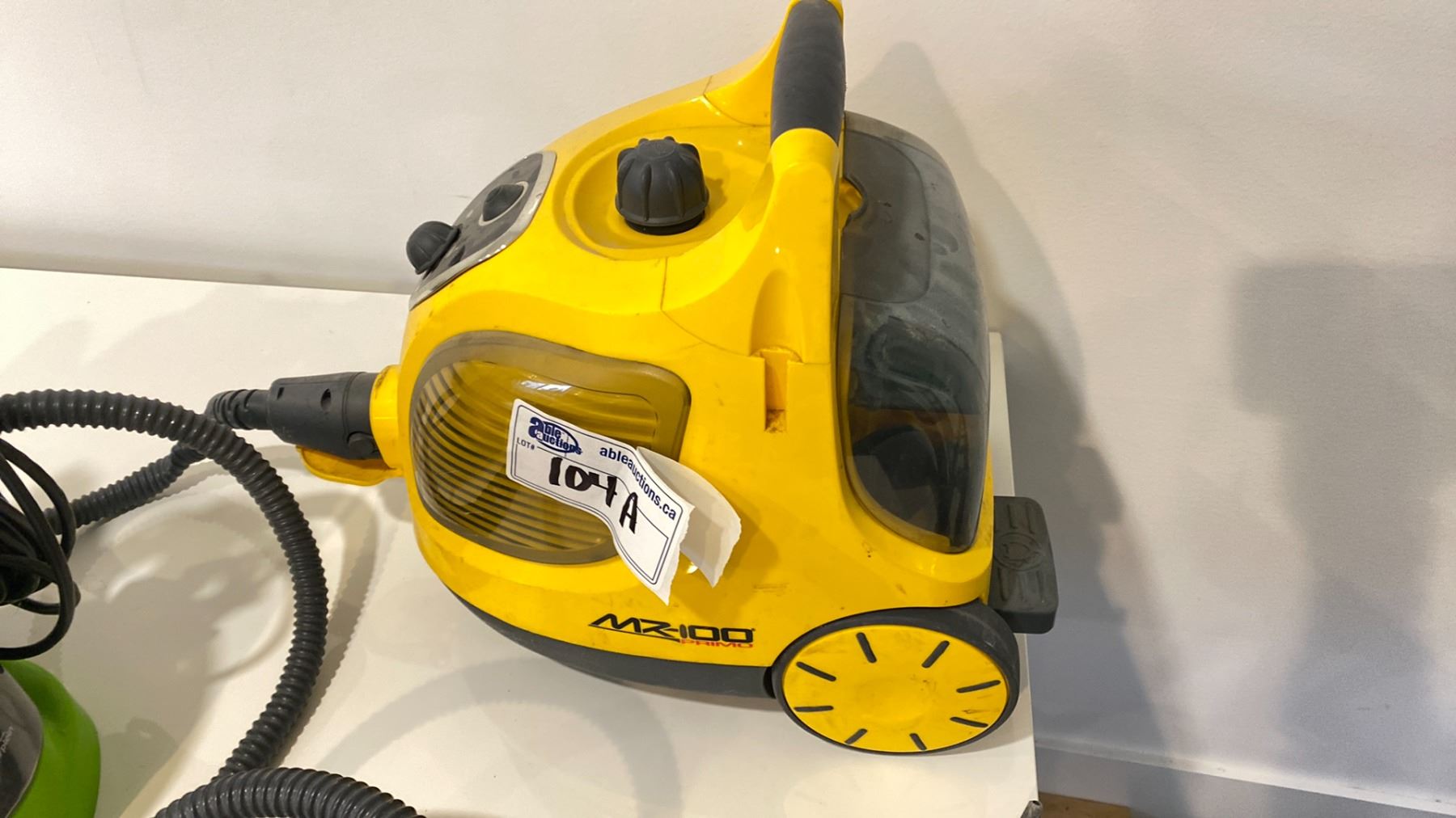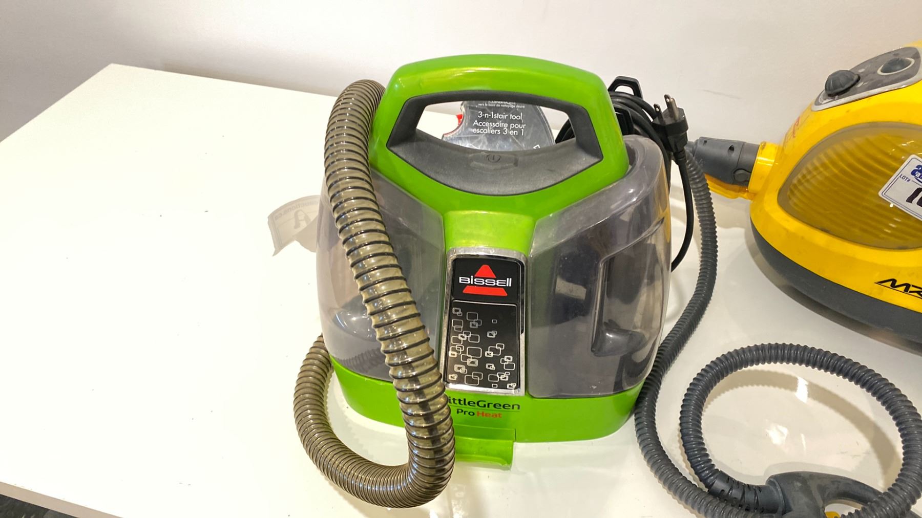 GROUP LOT INC MIELE STEAM CLEANER, MINI PRO 1008-0390 INTERTECH FLOOR CLEANER, LITTLE GREEN MACHINE CLEANER, BIN WITH SOME ATTACHMENTS AND PARTS AND PEDESTAL FAN