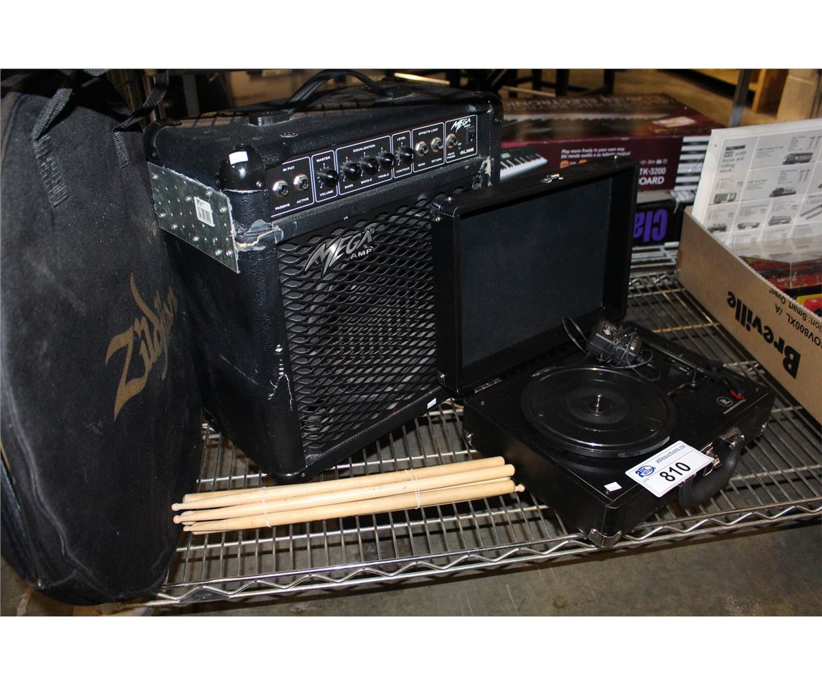 GROUP LOT INCLUDING GUITAR AMP, DRUM SKINS, DRUM STICKS AND IT PORTABLE TURN TABLE