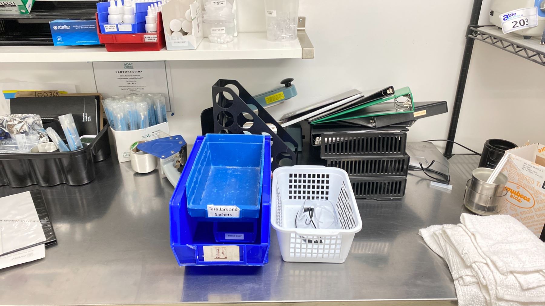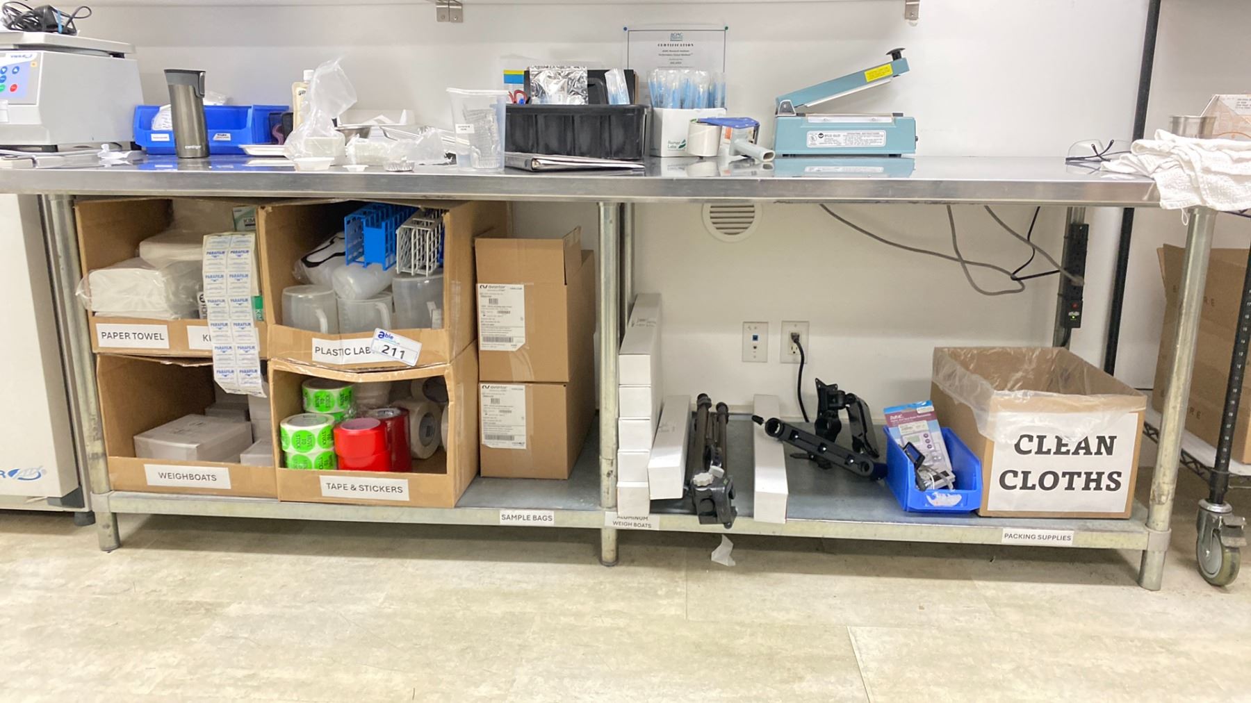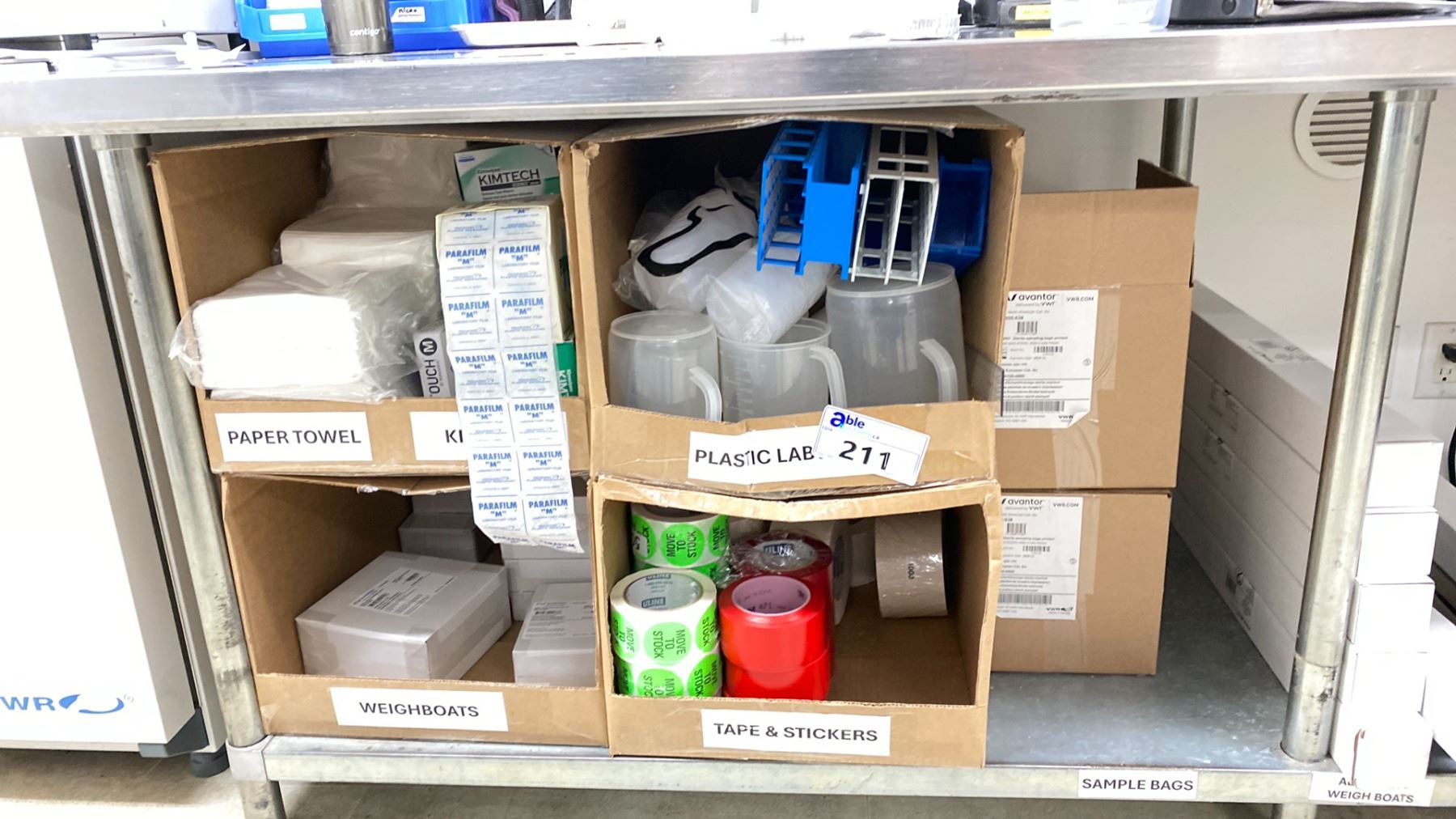 GROUP LOT LAB SUPPLIES. MEASURING CONTAINERS, KIMTECH DELICATE TASK WIPERS, LAB FILM, TAPES AND STICKERS, PAPER TOWELS, VWR WEIGH BOATS, STERILE BAGS, THERMOMETERS, CAMERA TRIPOD, VWR ALUMINUM SCALE WEIGH BOATS FOR OVEN, PESTLES AND MORTARS, TABLE NOT INCLUDED