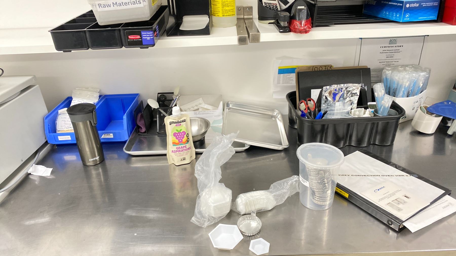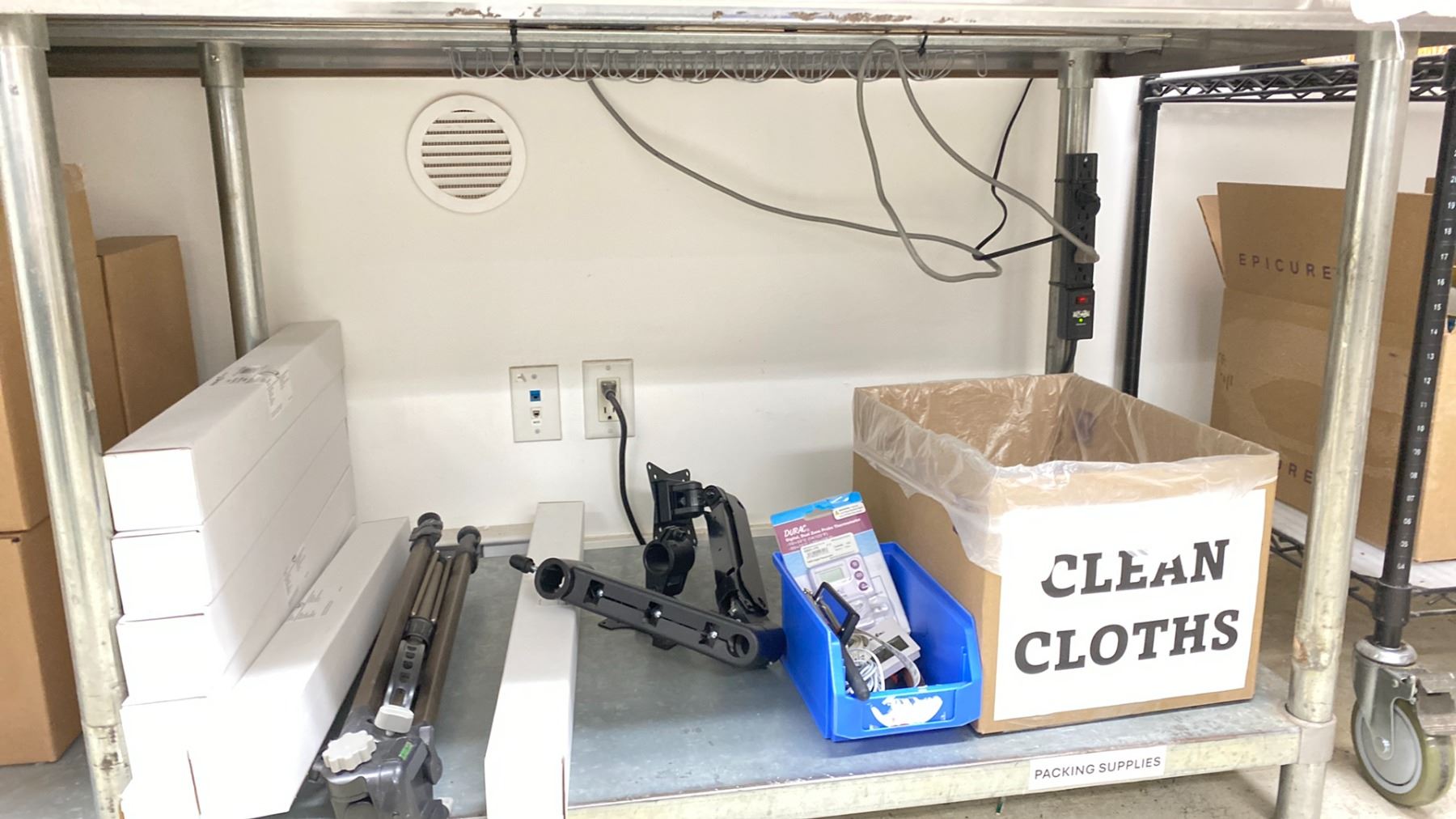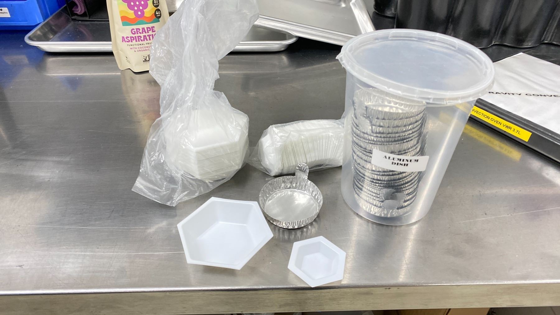 GROUP LOT LAB SUPPLIES. MEASURING CONTAINERS, KIMTECH DELICATE TASK WIPERS, LAB FILM, TAPES AND STICKERS, PAPER TOWELS, VWR WEIGH BOATS, STERILE BAGS, THERMOMETERS, CAMERA TRIPOD, VWR ALUMINUM SCALE WEIGH BOATS FOR OVEN, PESTLES AND MORTARS, TABLE NOT INCLUDED