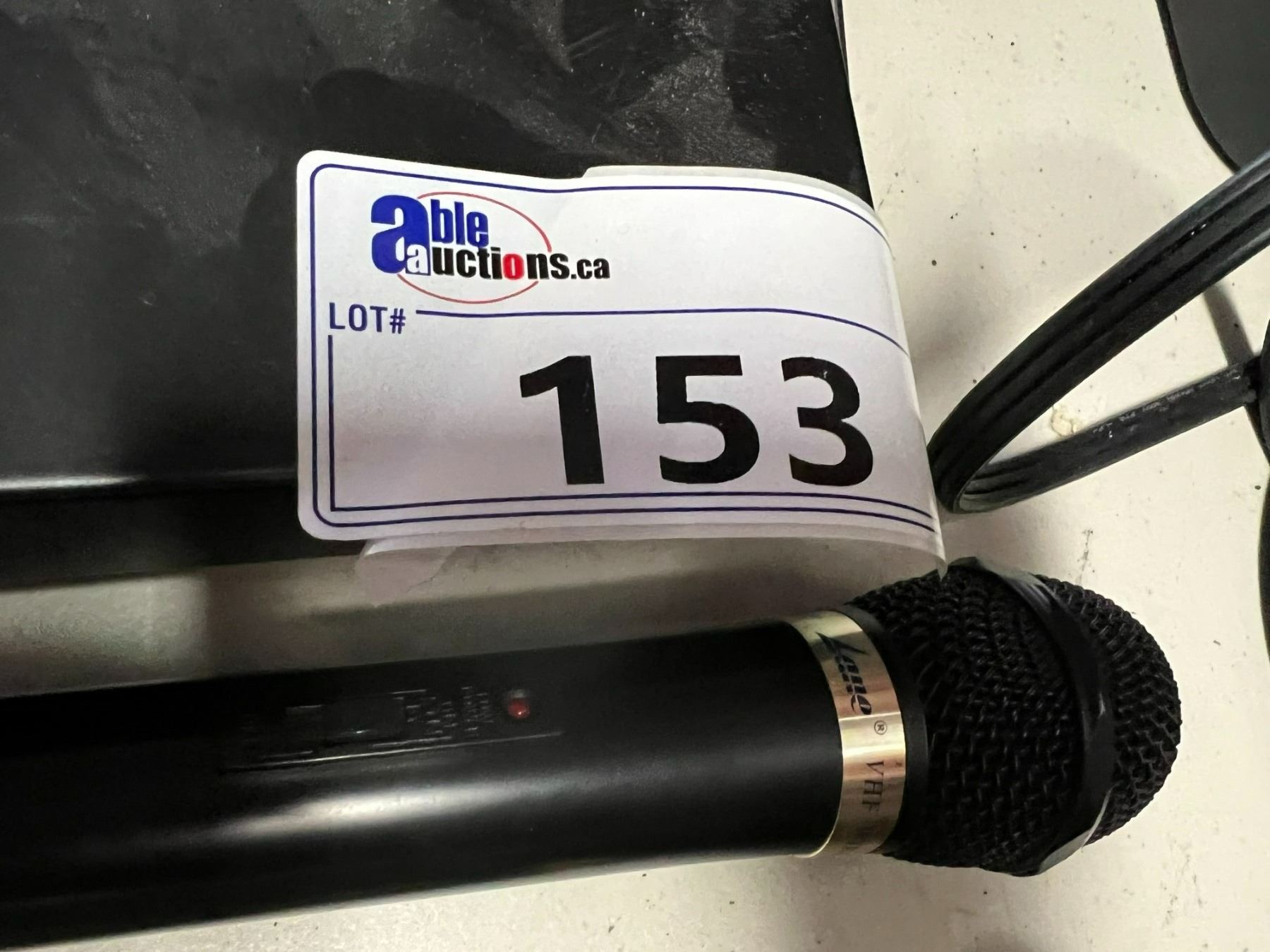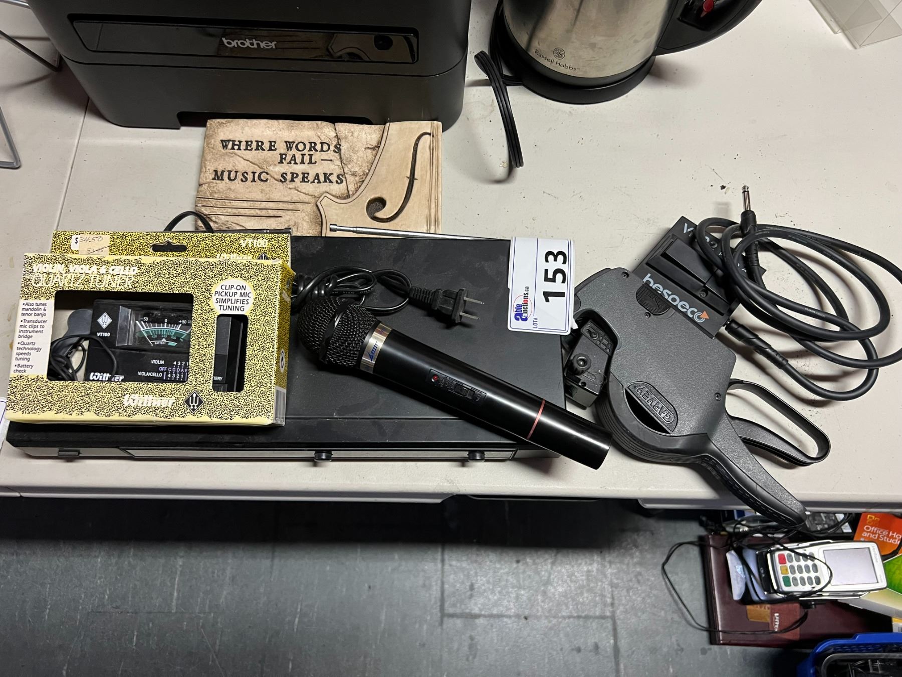 GROUP LOT (LANE WIRELESS MICROPHONE RECEIVER WITH 1 MICROPHONE, VM22 PEDAL, QUARTZ TUNER PRICING GUN & WALL PLAQUE)