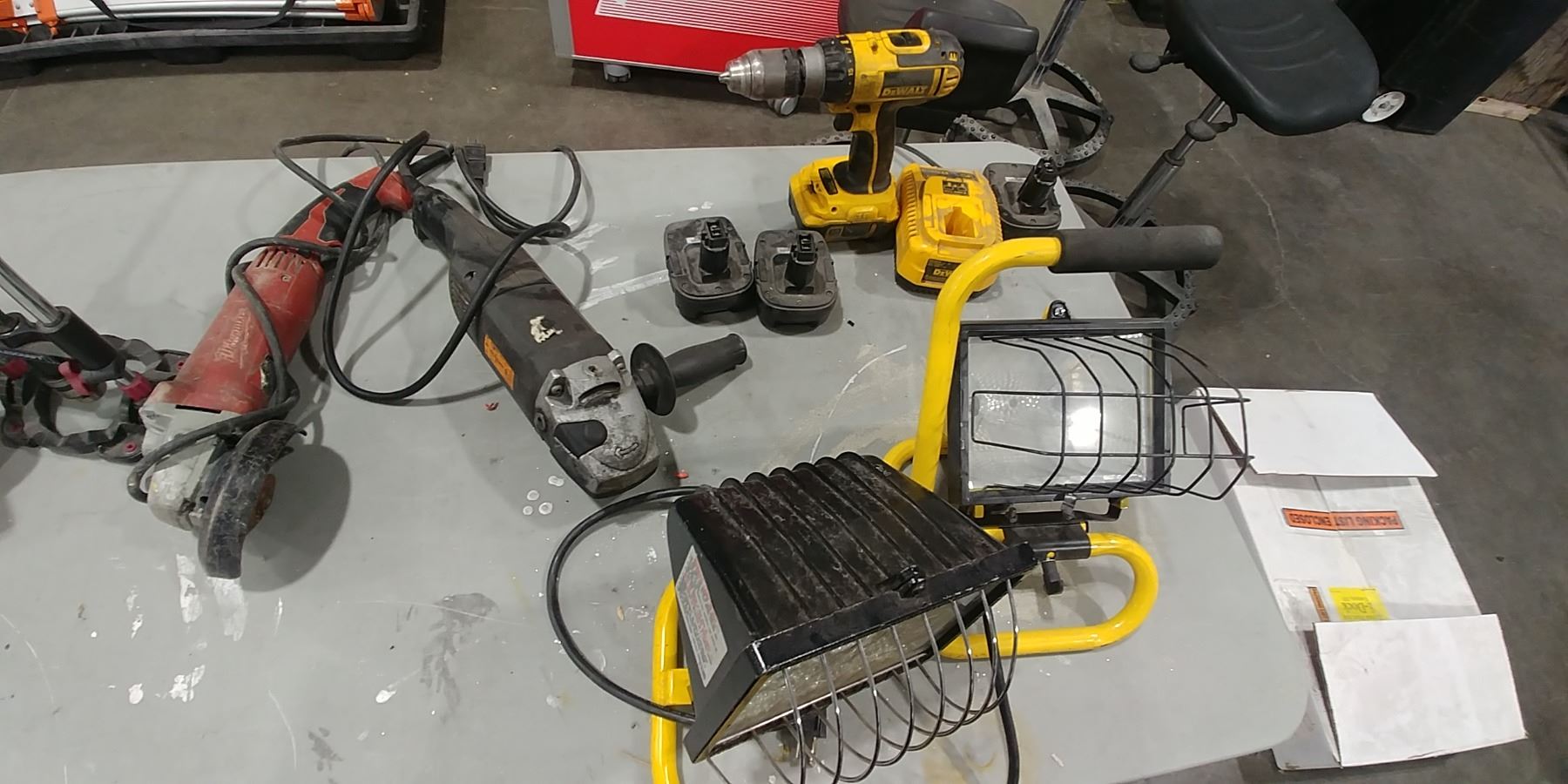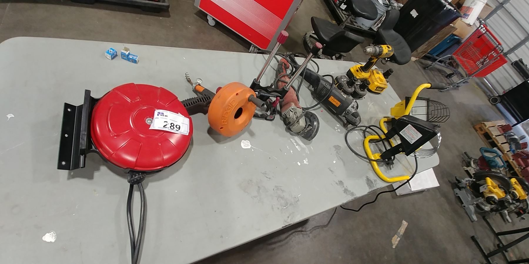 GROUP LOT NEW CORD REEL, RIDGID TOILET AUGER, MILWAUKEE 4.5" GRINDER, DEWALT DRILL, 2 WORK LIGHTS
