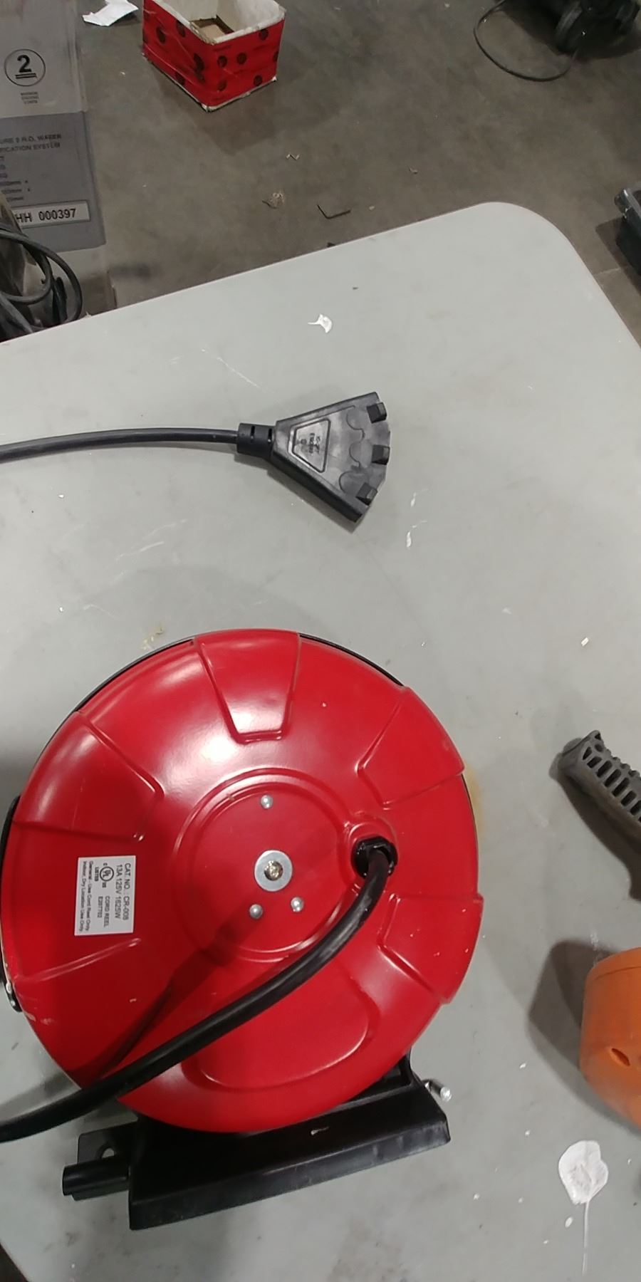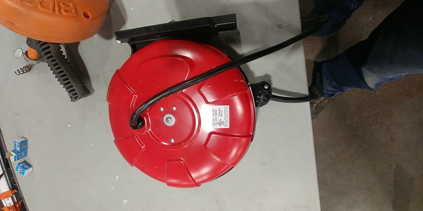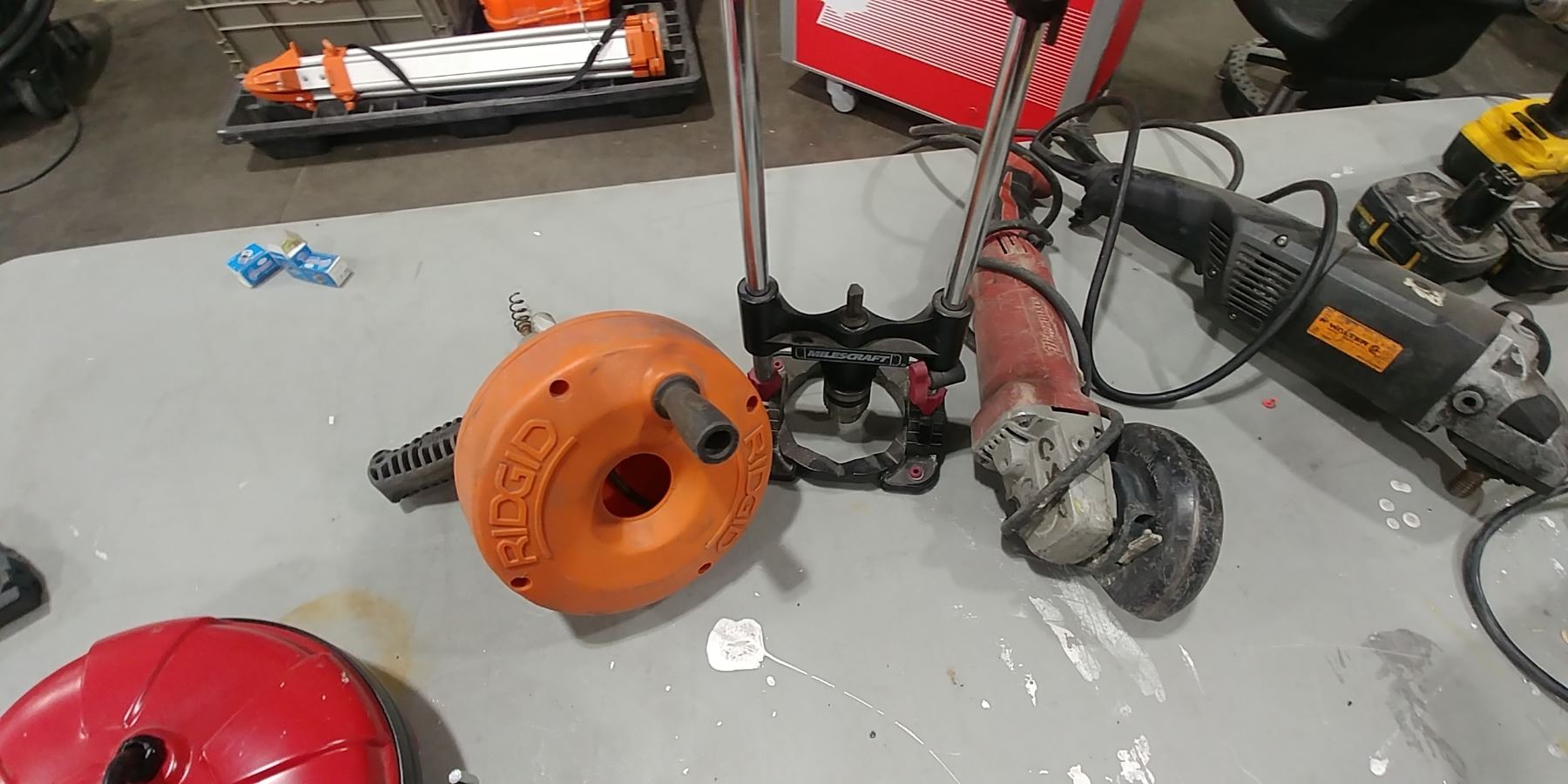 GROUP LOT NEW CORD REEL, RIDGID TOILET AUGER, MILWAUKEE 4.5" GRINDER, DEWALT DRILL, 2 WORK LIGHTS ONE IS MISSING BULB, WALTER GRINDER