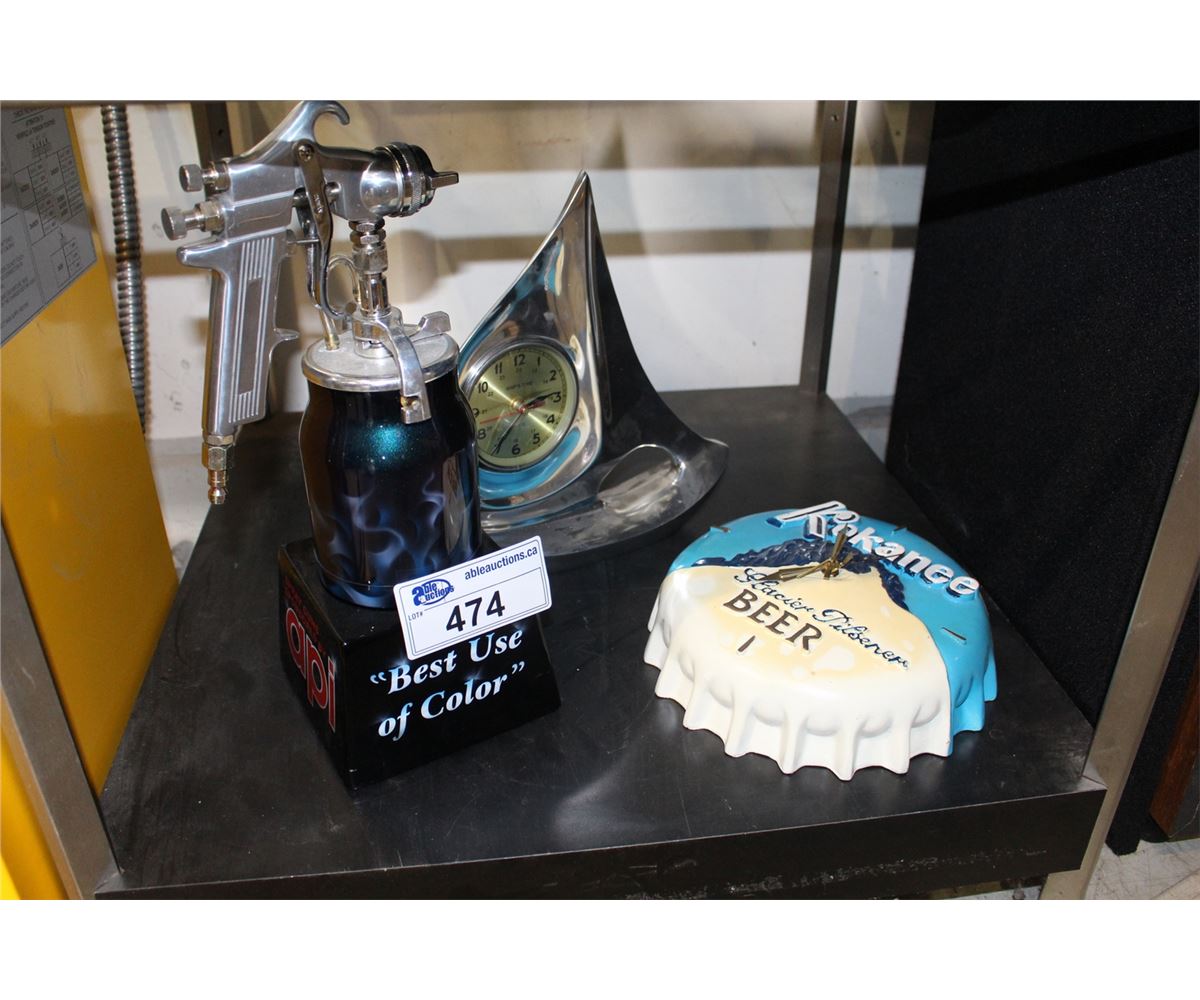 GROUP LOT OF 3 COLLECTABLE ITEMS; BEST USE OF COLOUR PAINT SPRAY POD TROPHY, METAL ART CLOCK AND A KOKANEE BEER CLOCK