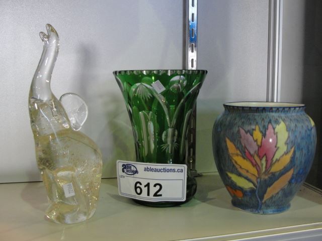 GROUP LOT OF 3 COLLECTABLE PIECES; BOHEMIAN CRYSTAL VASE, GLASS SCULPTED ELEPHANT WITH GOLD FLECK AND CARLTON WARE MID CENTURY MODERN VASE