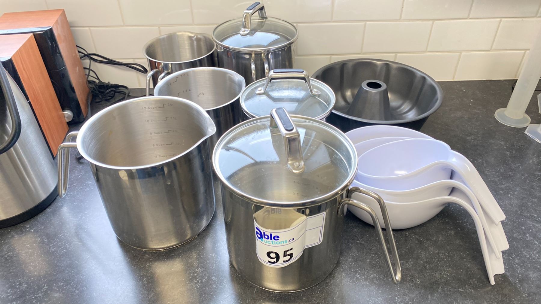 GROUP LOT OF 6 EPICURE MEASURE COOK POTS WITH HEAVY DUTY BOTTOMS, SEVERAL LIDS, COFFEE DISPENSER, NESTING BOWLS, SPEAKERS