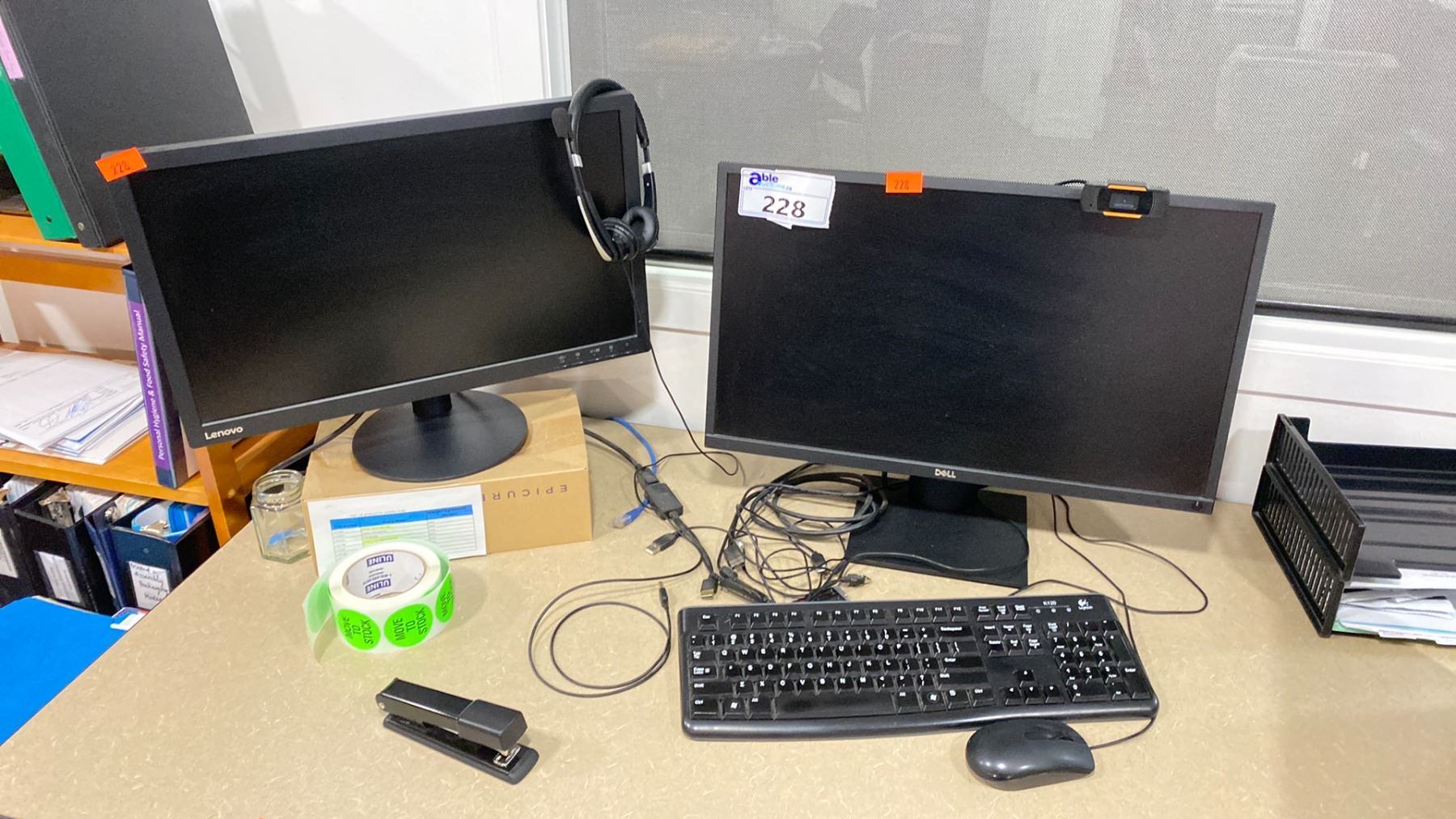 GROUP LOT OF 6 MONITORS. 3X 20" DELL, 24" SAMSUNG, 21" LENOVO, 24" DELL, ASST PHONE HEADSET,