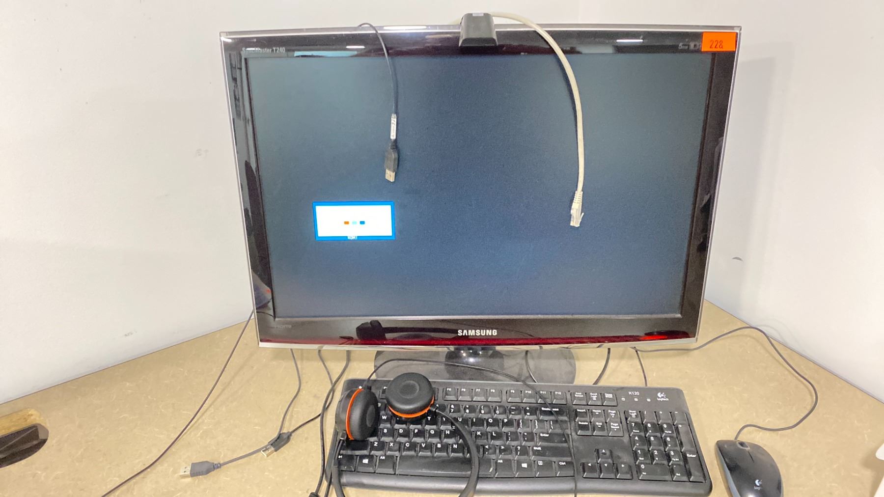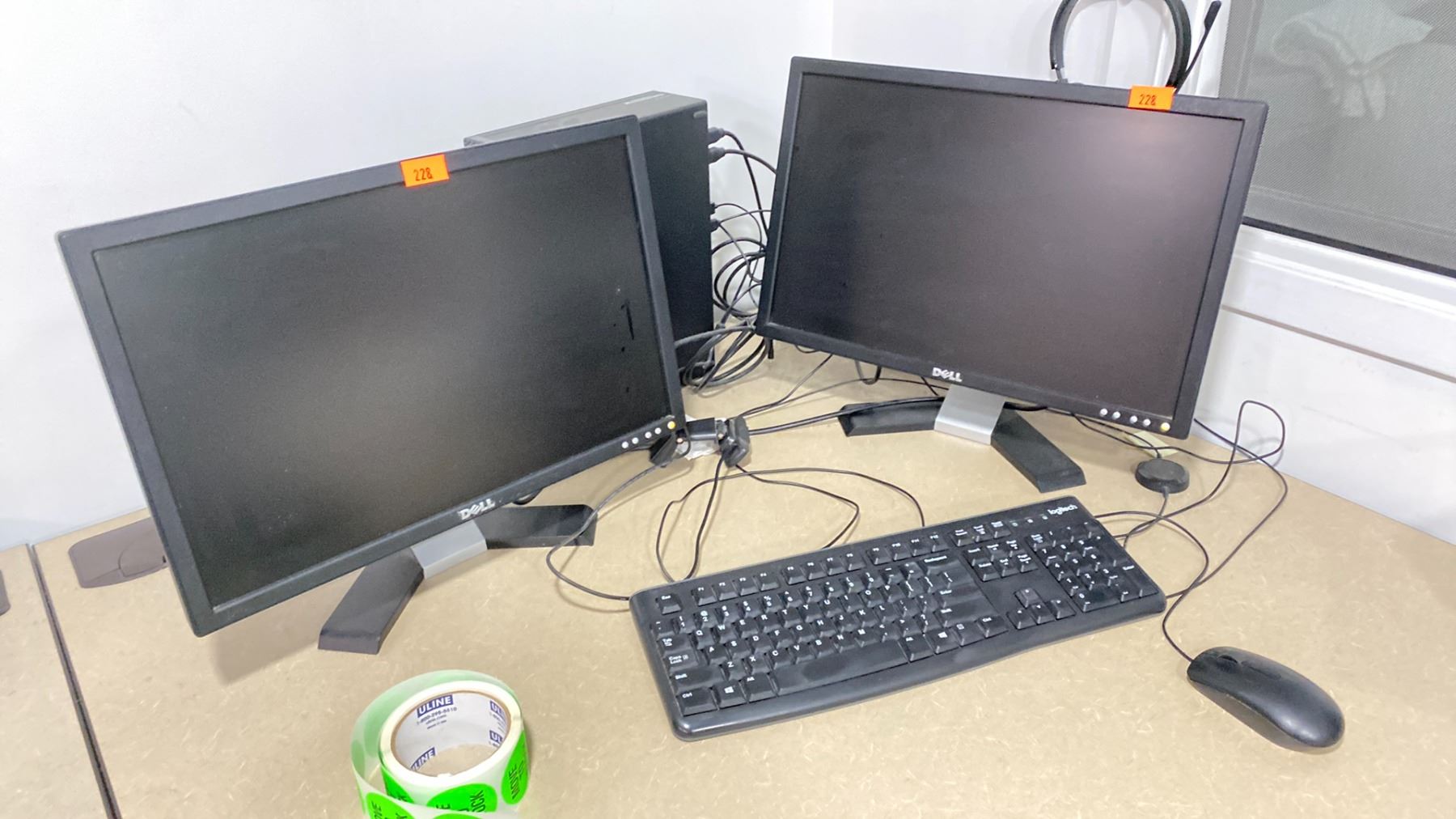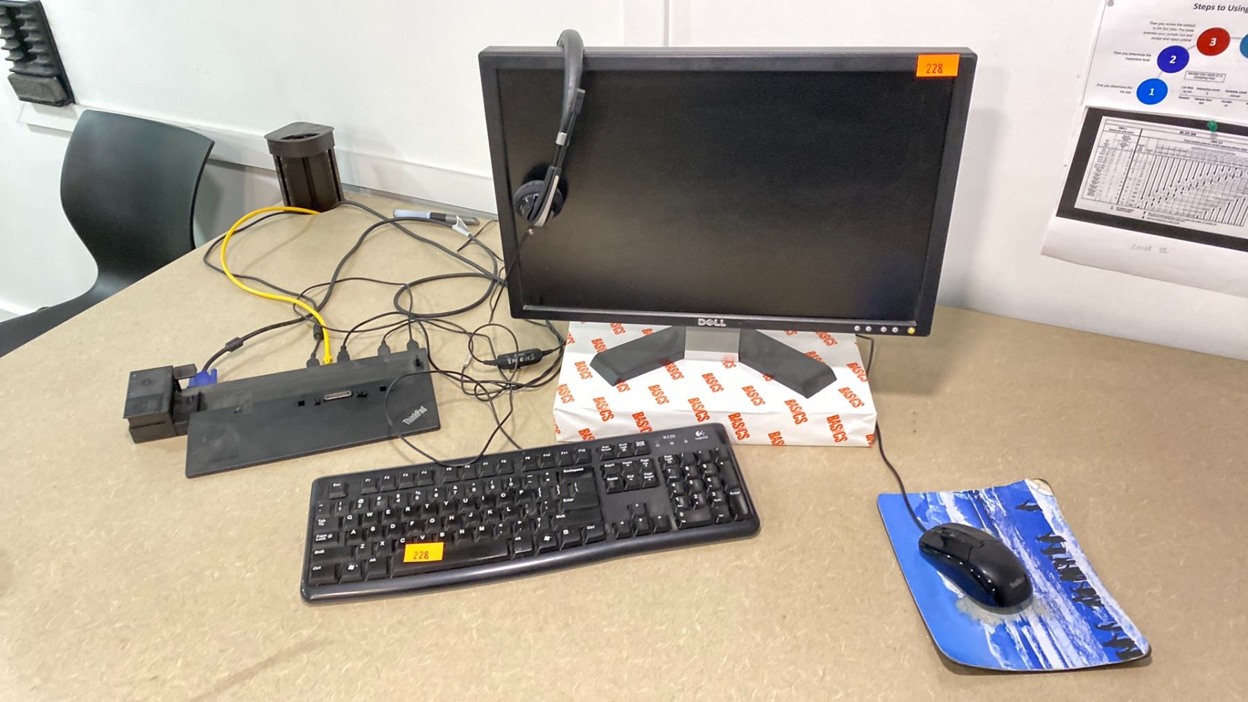 GROUP LOT OF 6 MONITORS. 3X 20" DELL, 24" SAMSUNG, 21" LENOVO, 24" DELL, ASST PHONE HEADSET, MONITORS, MICE, CORDS, DOCKS ETC