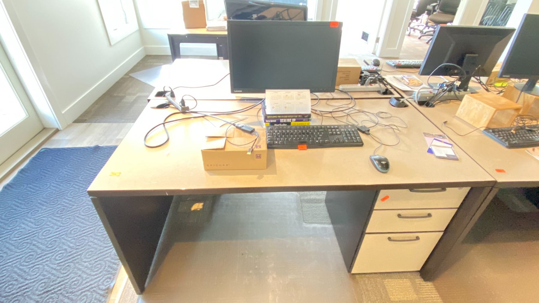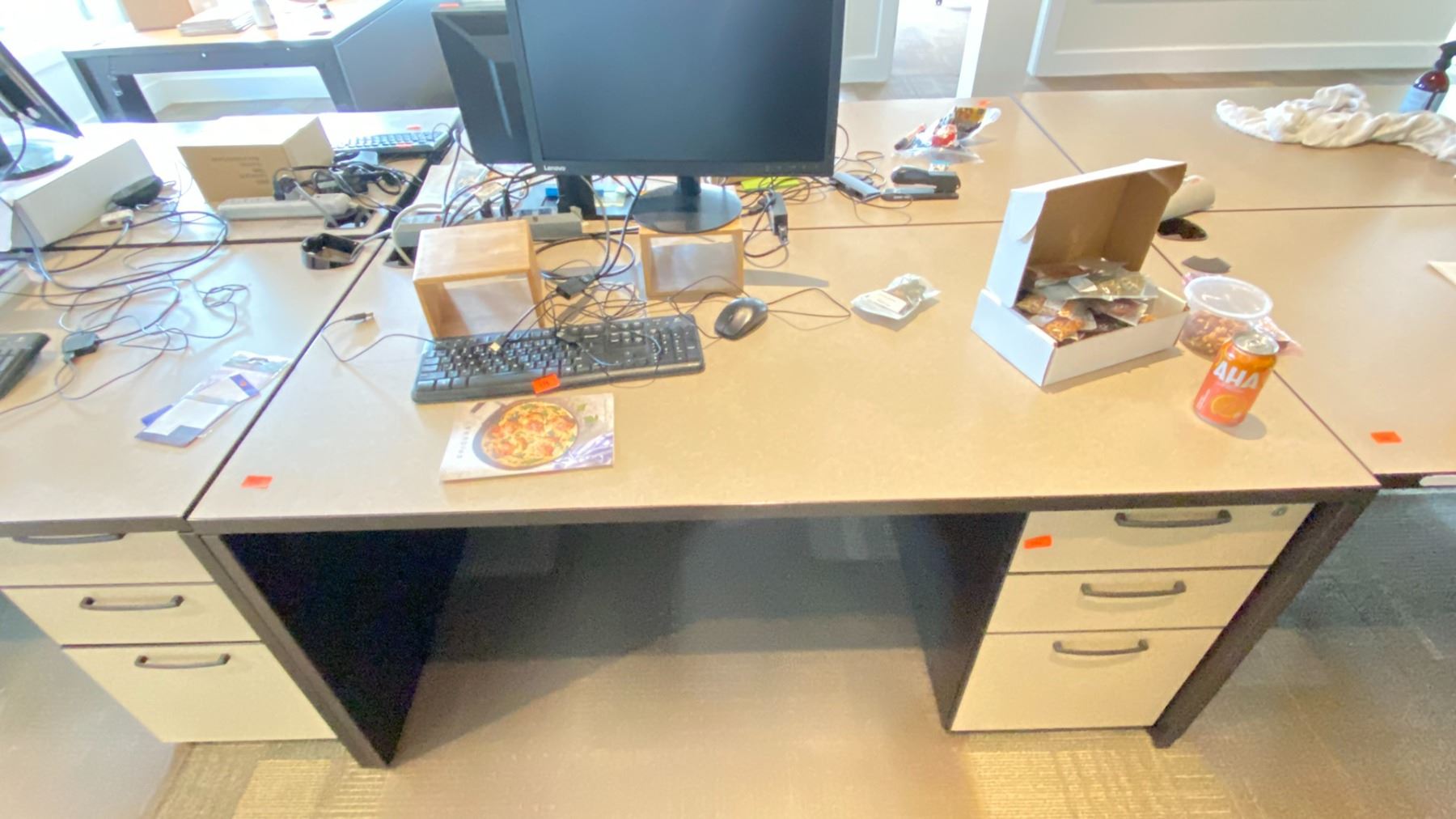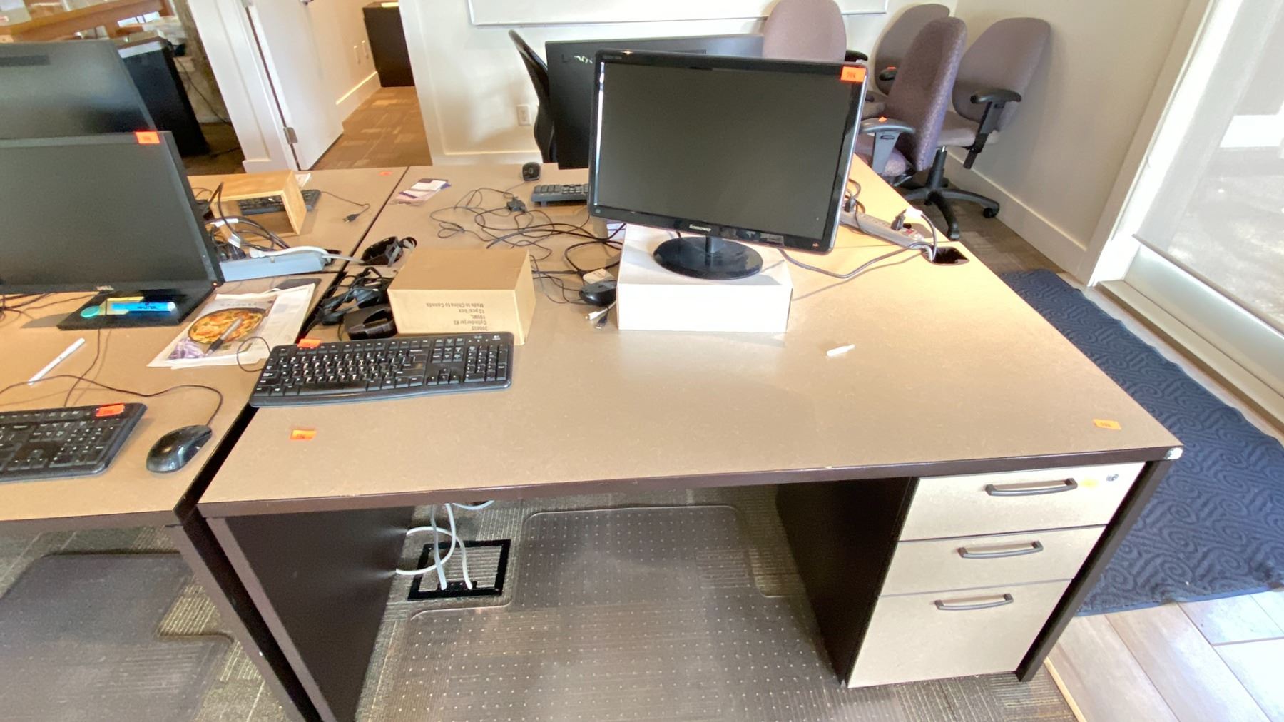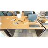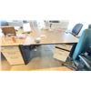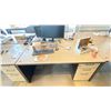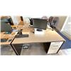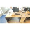 GROUP LOT OF 6 X 60X30" DESKS, 66 X 42" CORNER DESK, 5 DRAWER PEDESTALS, 4 MONITORS-20", 3 X 21", ASST KEYBOARDS, MICE, DOCKING STATION, MULTI MONITOR CONNECTORS, POWER BARS, BOOKS, ETC LOCATED IN HOUSE