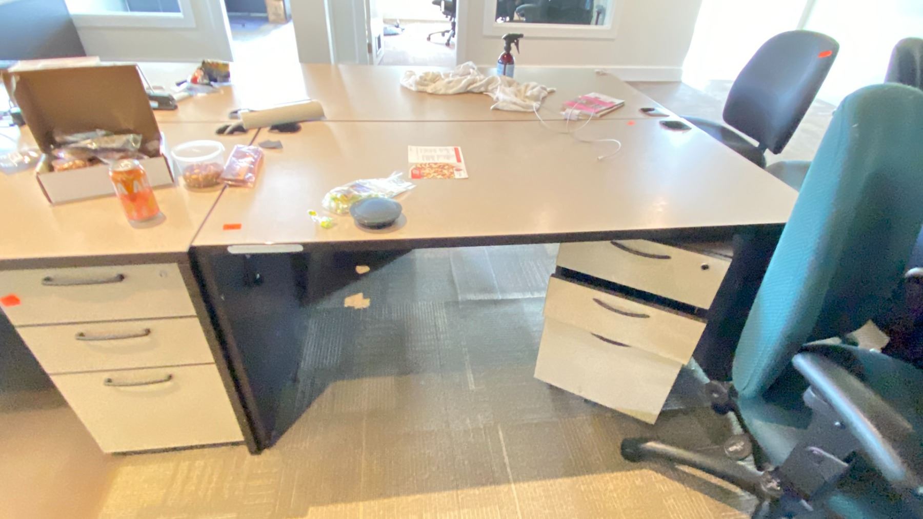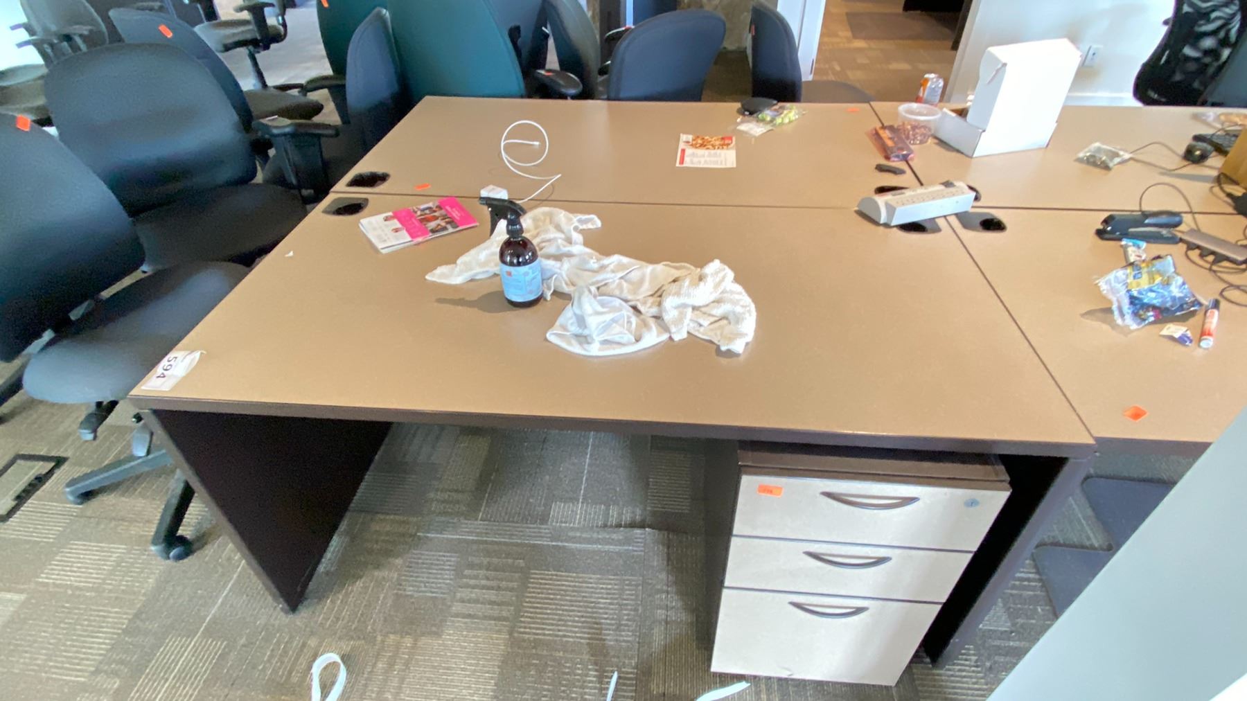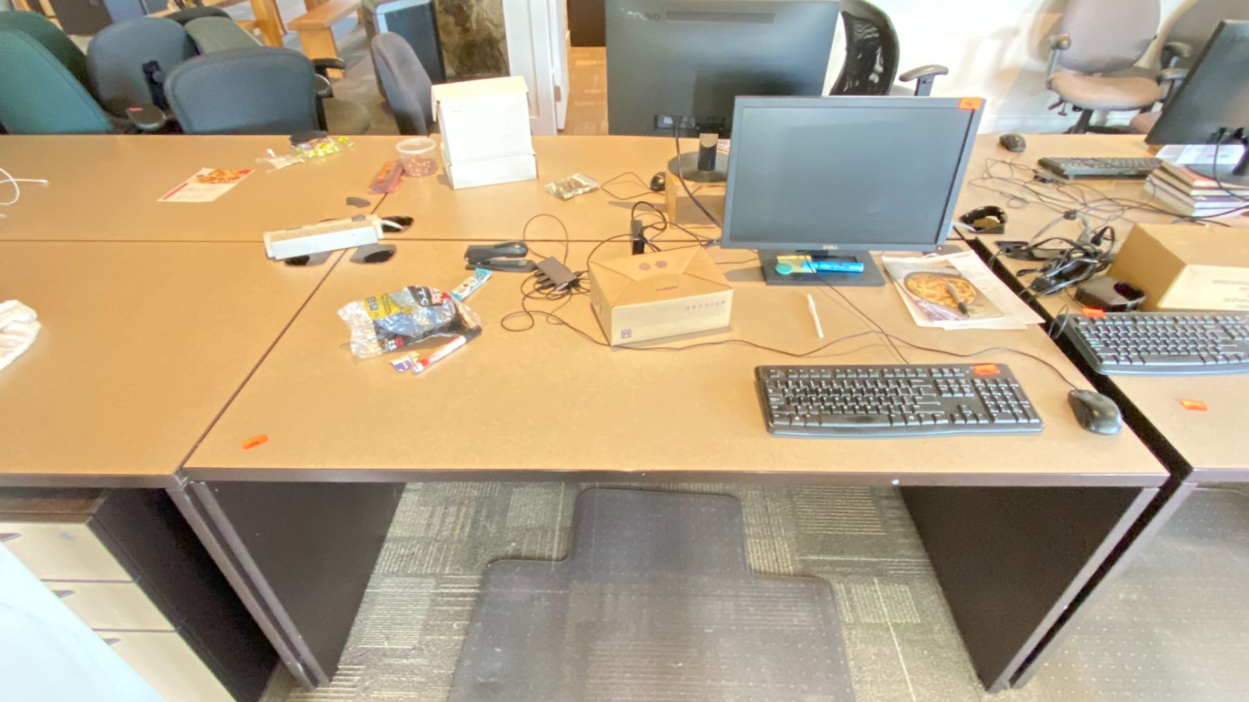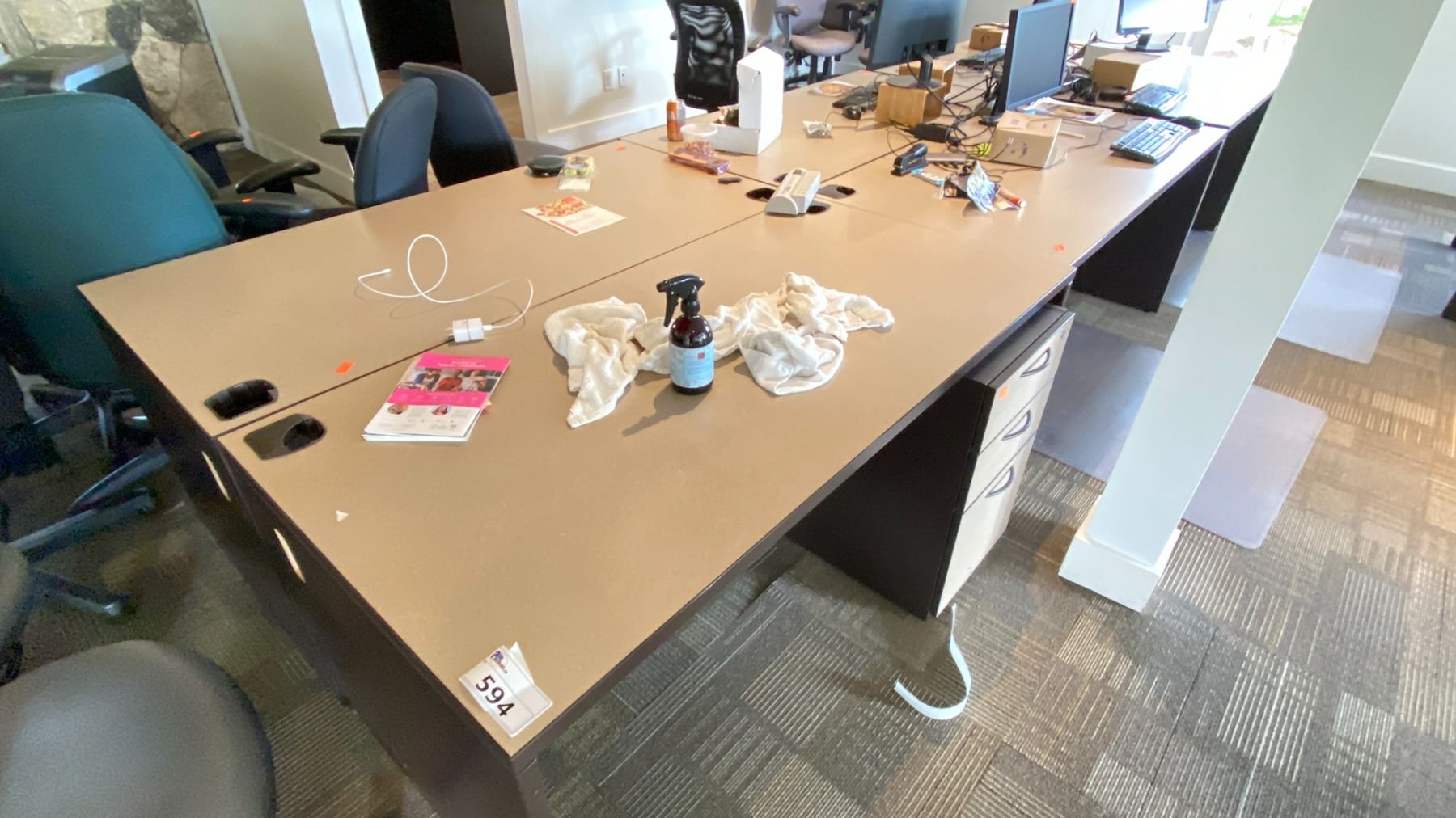 GROUP LOT OF 6 X 60X30" DESKS, 66 X 42" CORNER DESK, 5 DRAWER PEDESTALS, 4 MONITORS-20", 3 X 21", ASST KEYBOARDS, MICE, DOCKING STATION, MULTI MONITOR CONNECTORS, POWER BARS, BOOKS, ETC LOCATED IN HOUSE