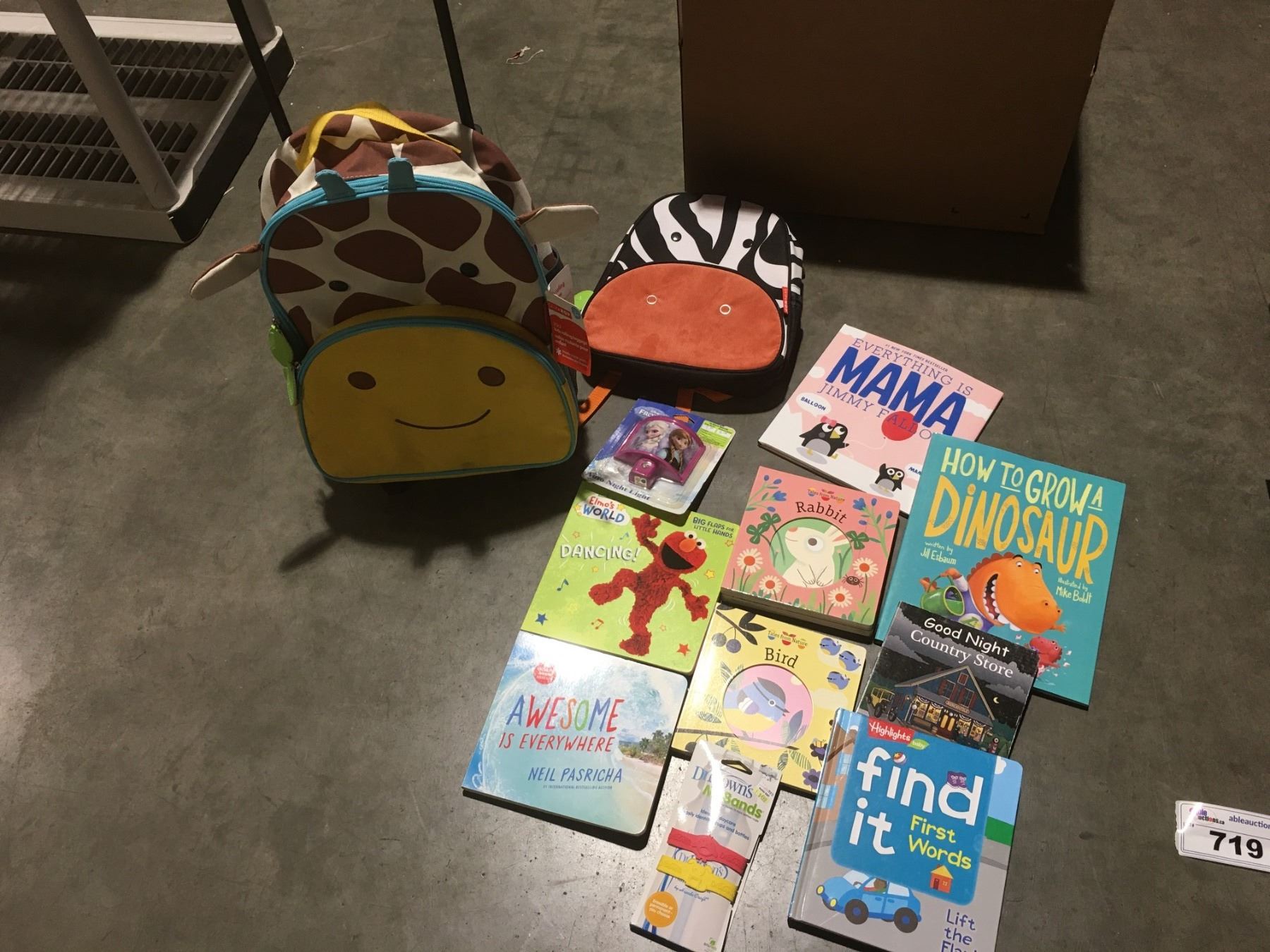 GROUP LOT OF 9 ASSTD BOOKS, FROZEN AUTO NIGHTLIGHT, DR. BROWNS MY BANDS, BACKPACK &  SKIP HOP KIDS ROLLING LUGGAGE - A
