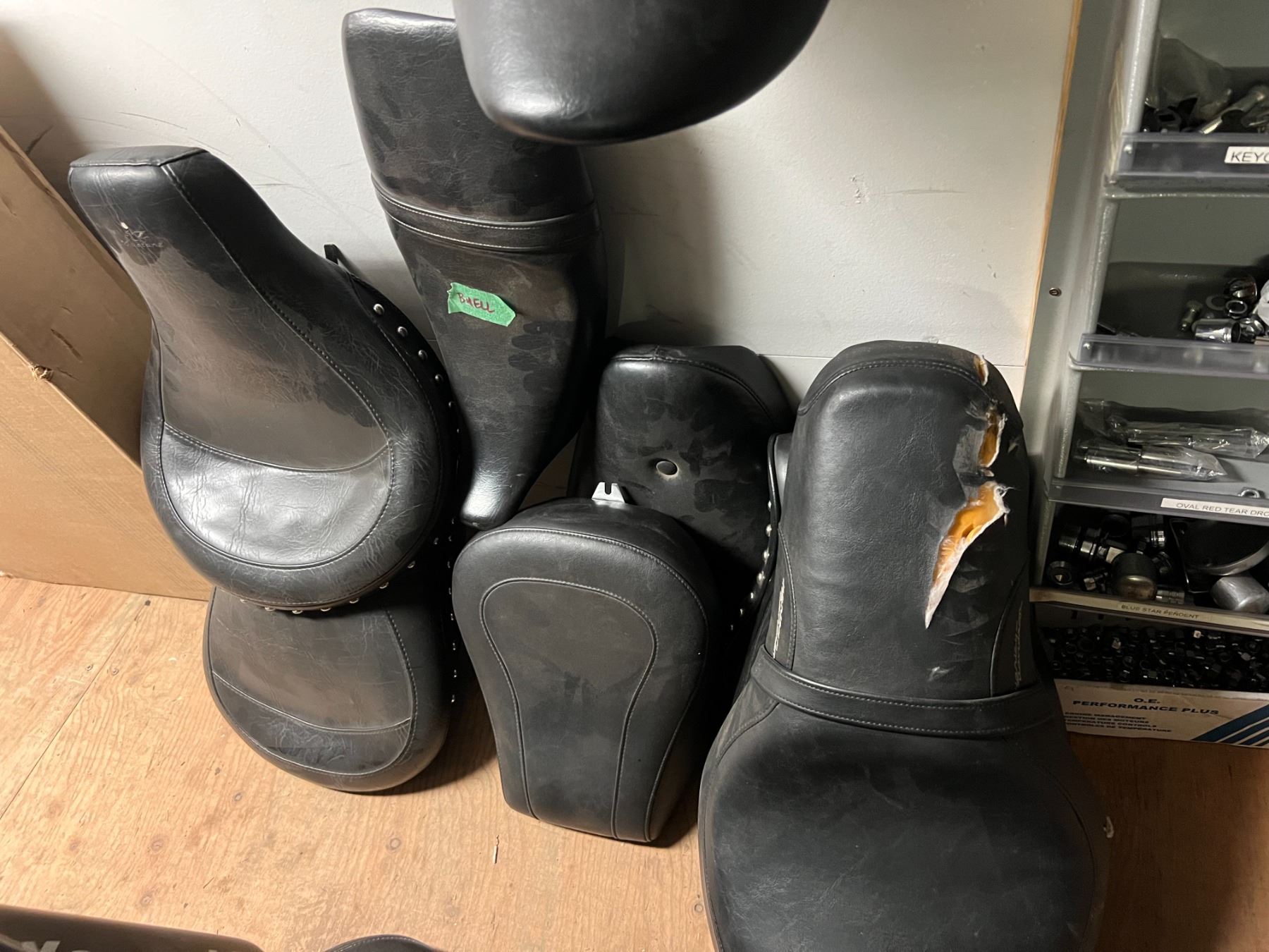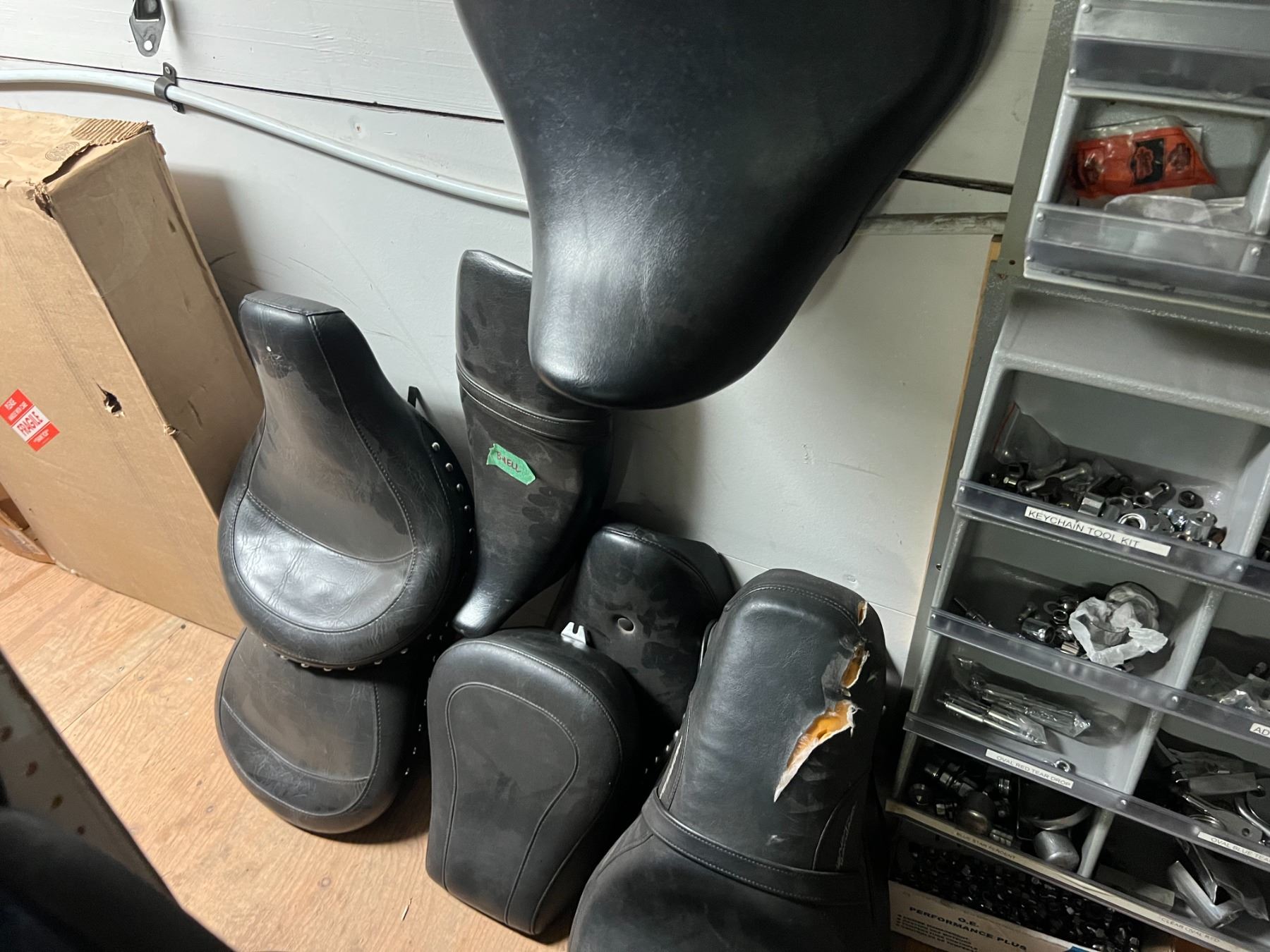 GROUP LOT OF ASSORTED HARLEY-DAVIDSON SEATS IN VARIOUS CONDITIONS (APPROX 12 PIECES) & 1 X KAWASAKI DIRT BIKE SEAT