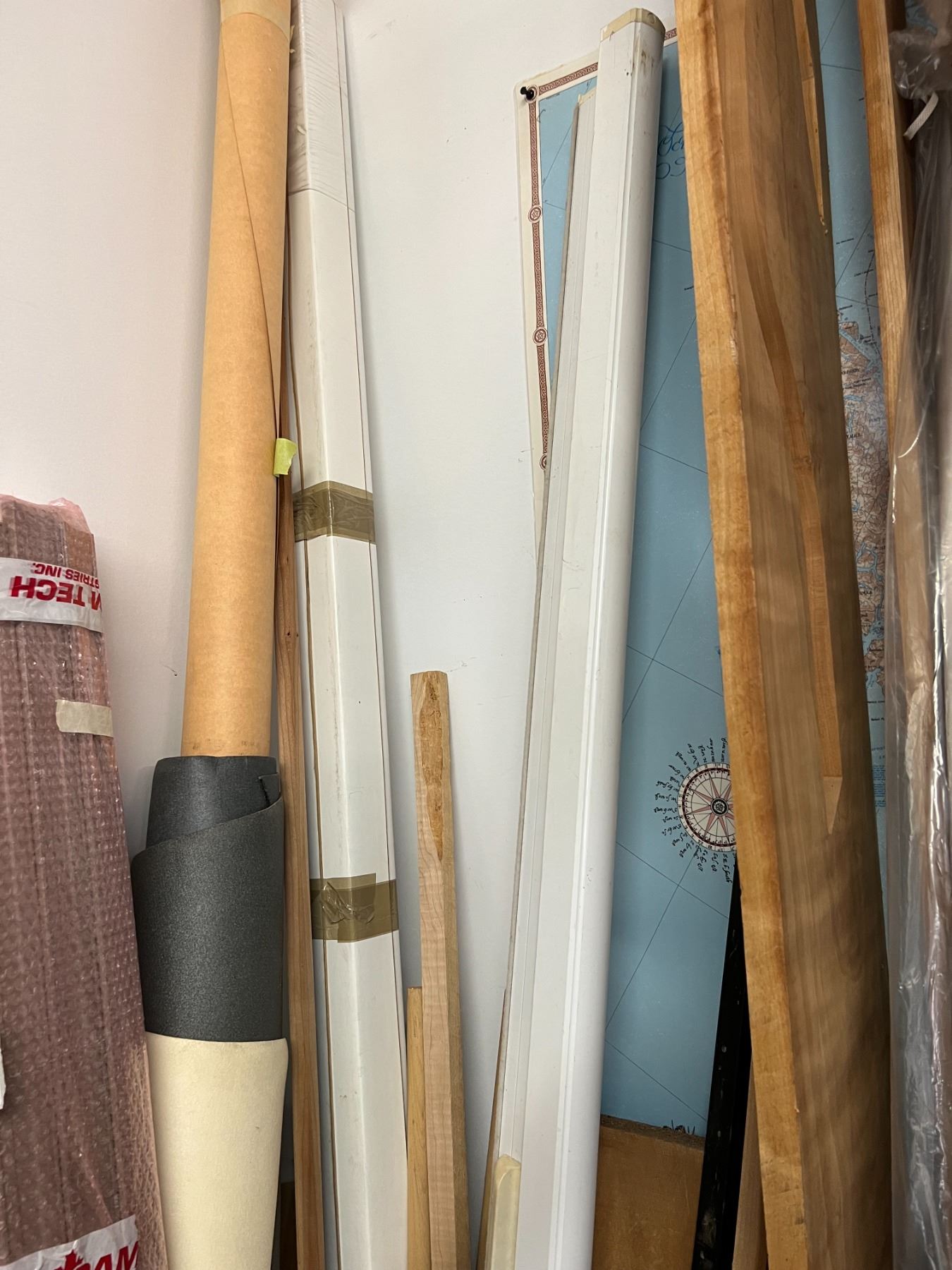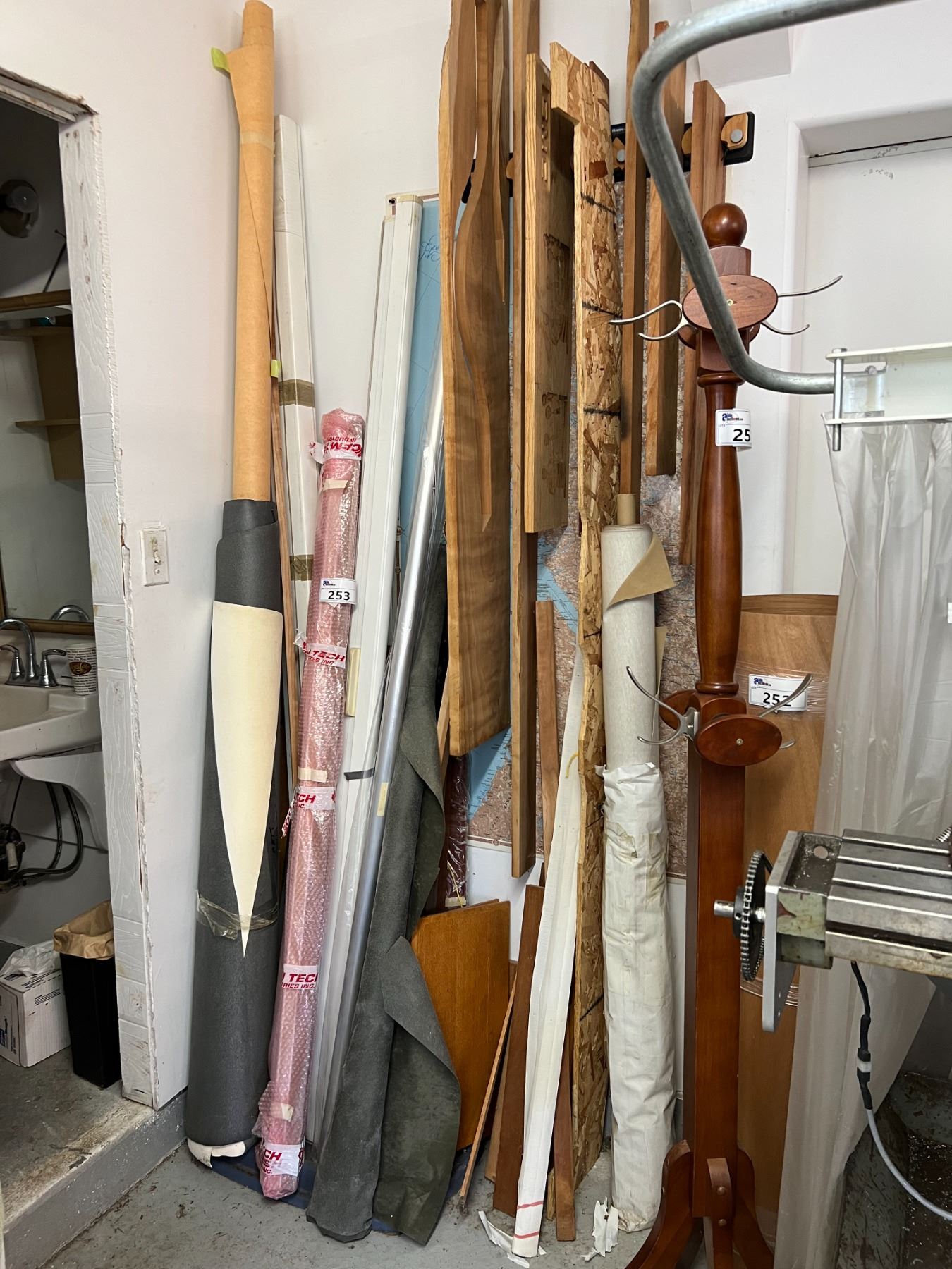 GROUP LOT OF ASSORTED OFFCUTS OF ROLLS OF UPHOLSTERY MATERIAL, METAL ROD, WOOD OFFCUTS, SCREENS ETC.