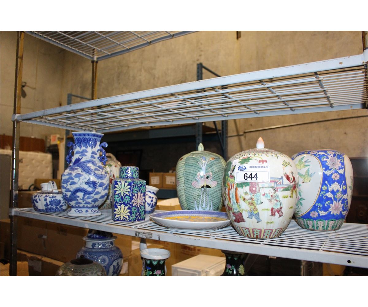 GROUP LOT OF ASSORTED ORIENTAL CERAMICS; UMBRELLA STANDS, PLANTERS, LIDDED JARS, ETC