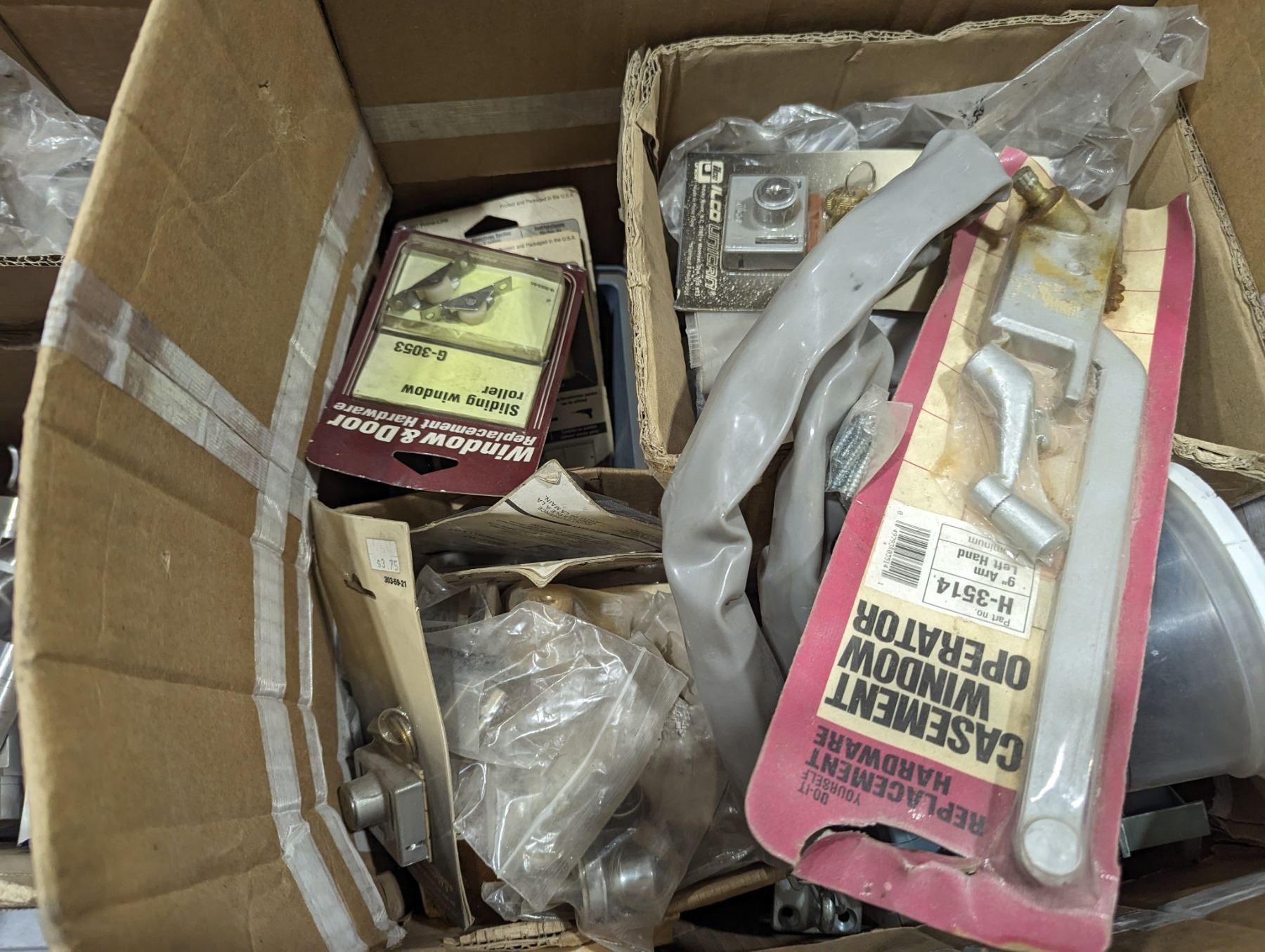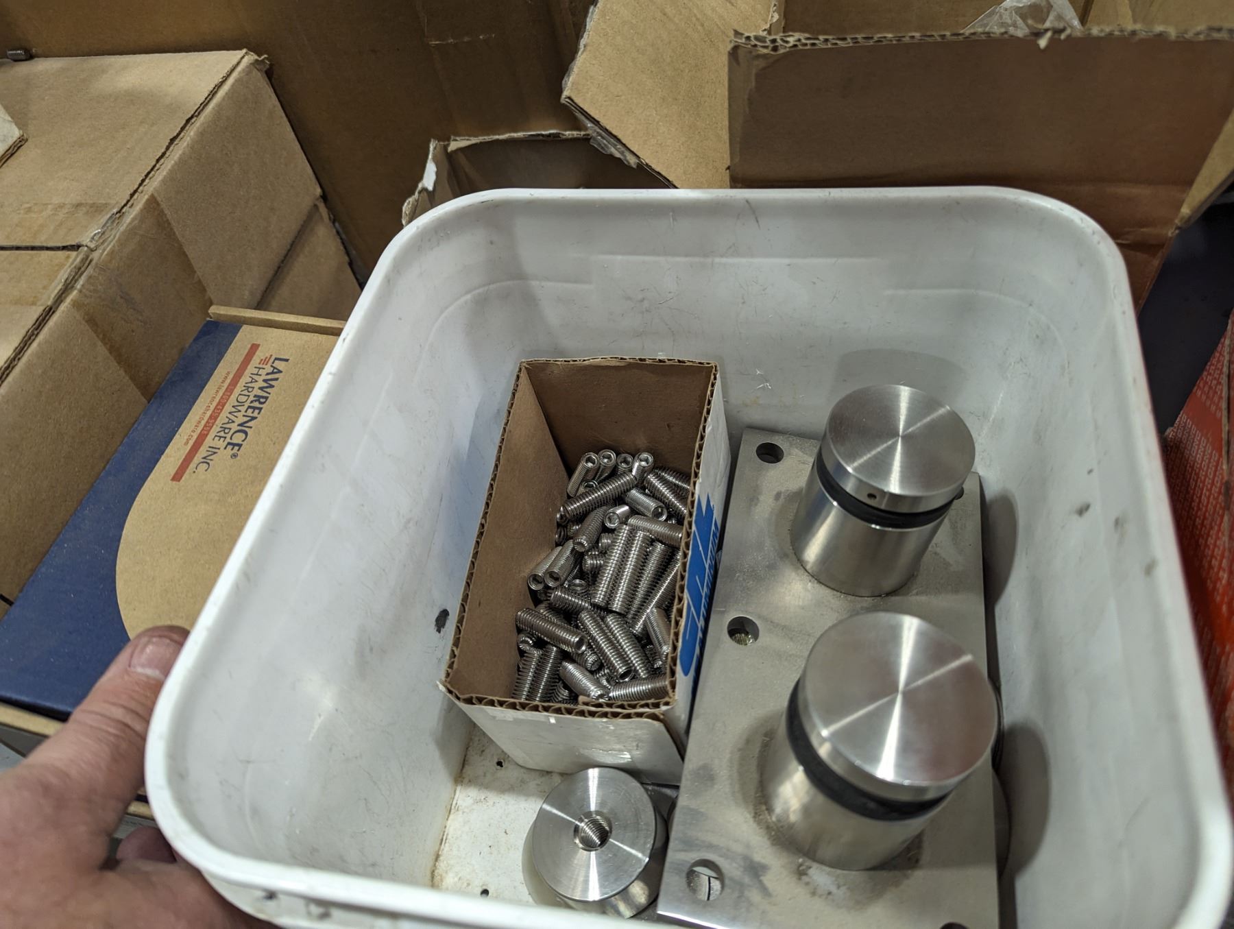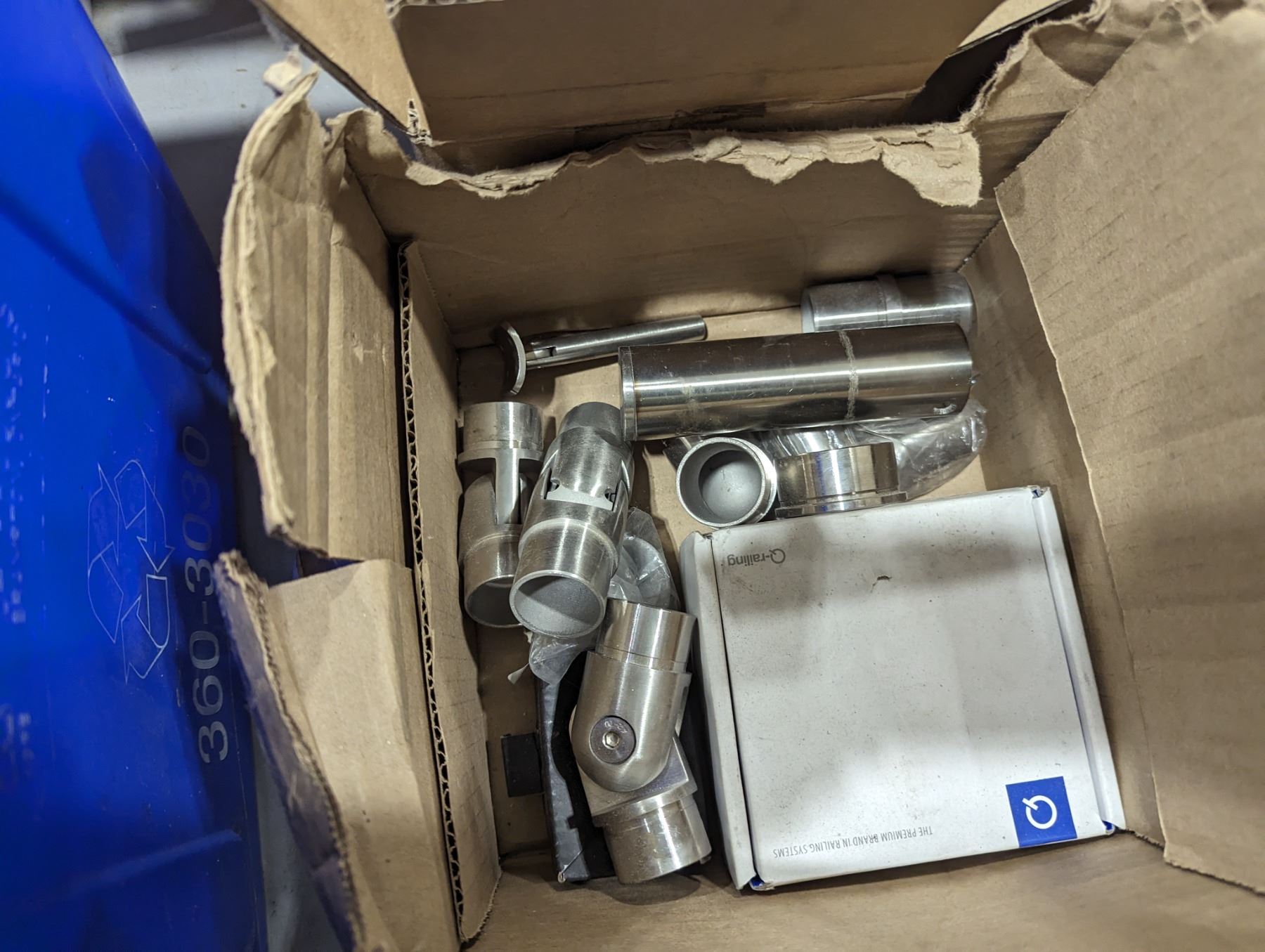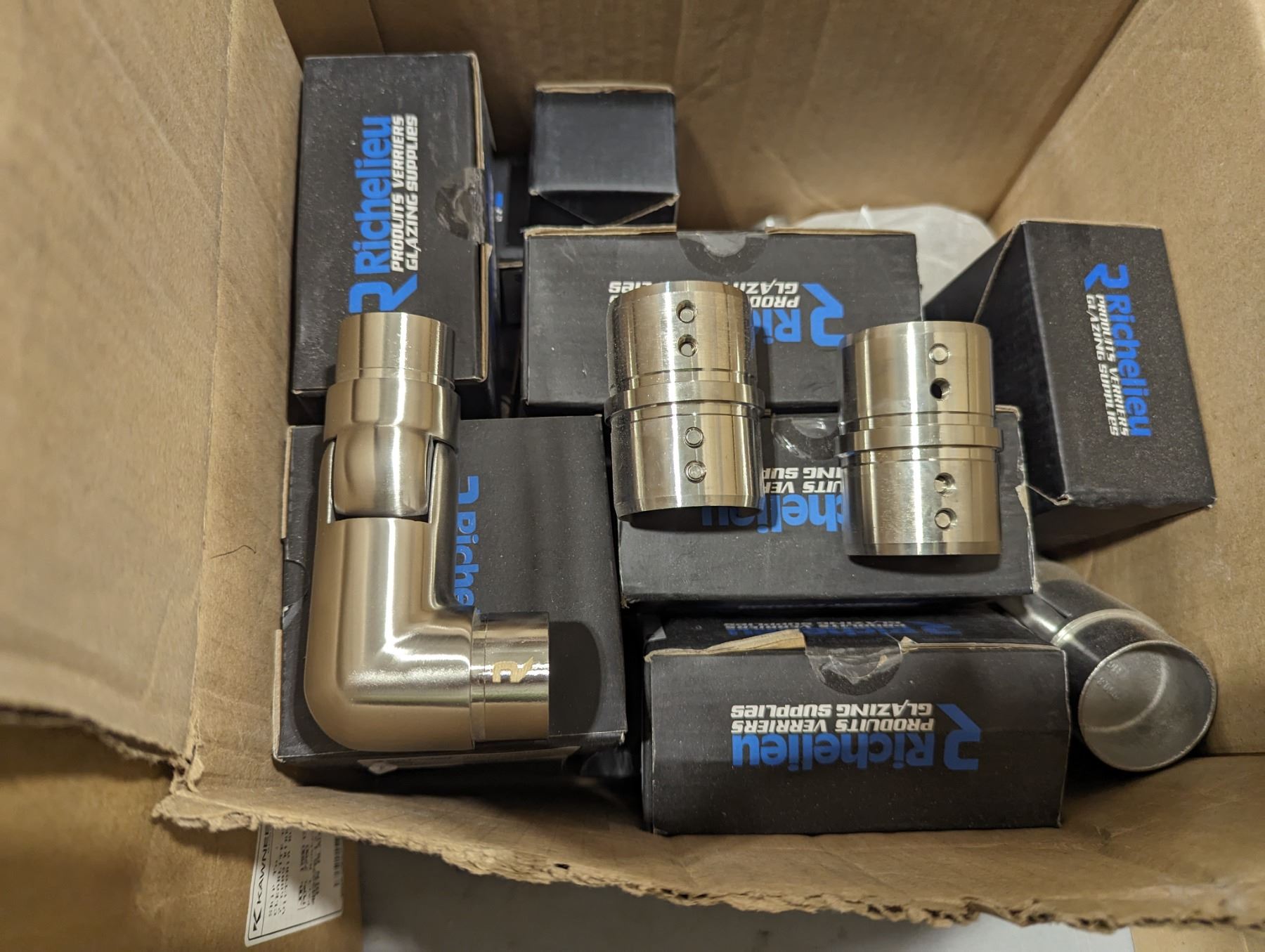 GROUP LOT OF ASST DOOR HARDWARE. REMOTE CONTROL HARDWARE, ASST OF SS RAILING HARDWARE, COUPLERS, ELBOWS, ASST Q-RAILING PARTS (SHIMS, GASKETS), GLASS CLAMPS ETC
