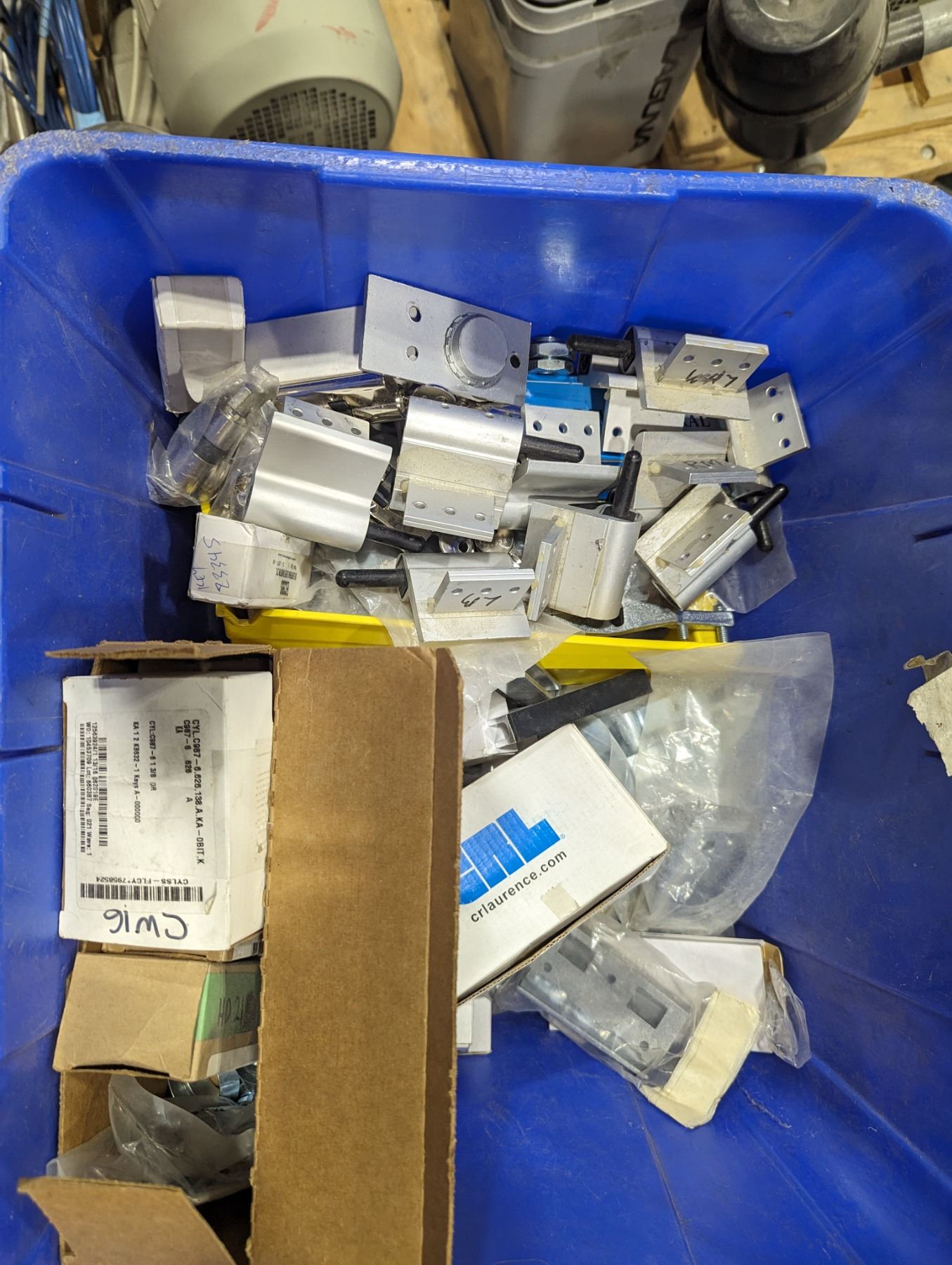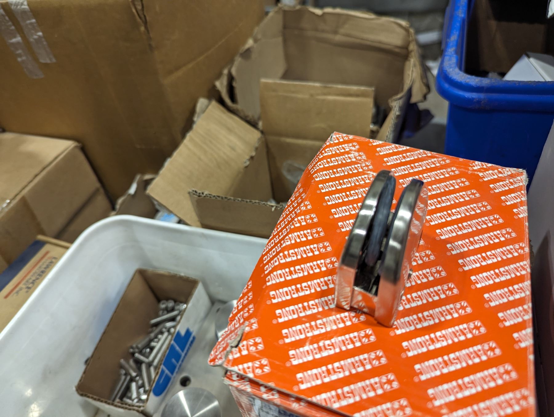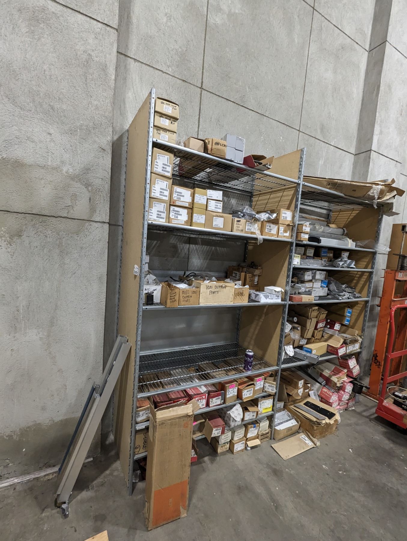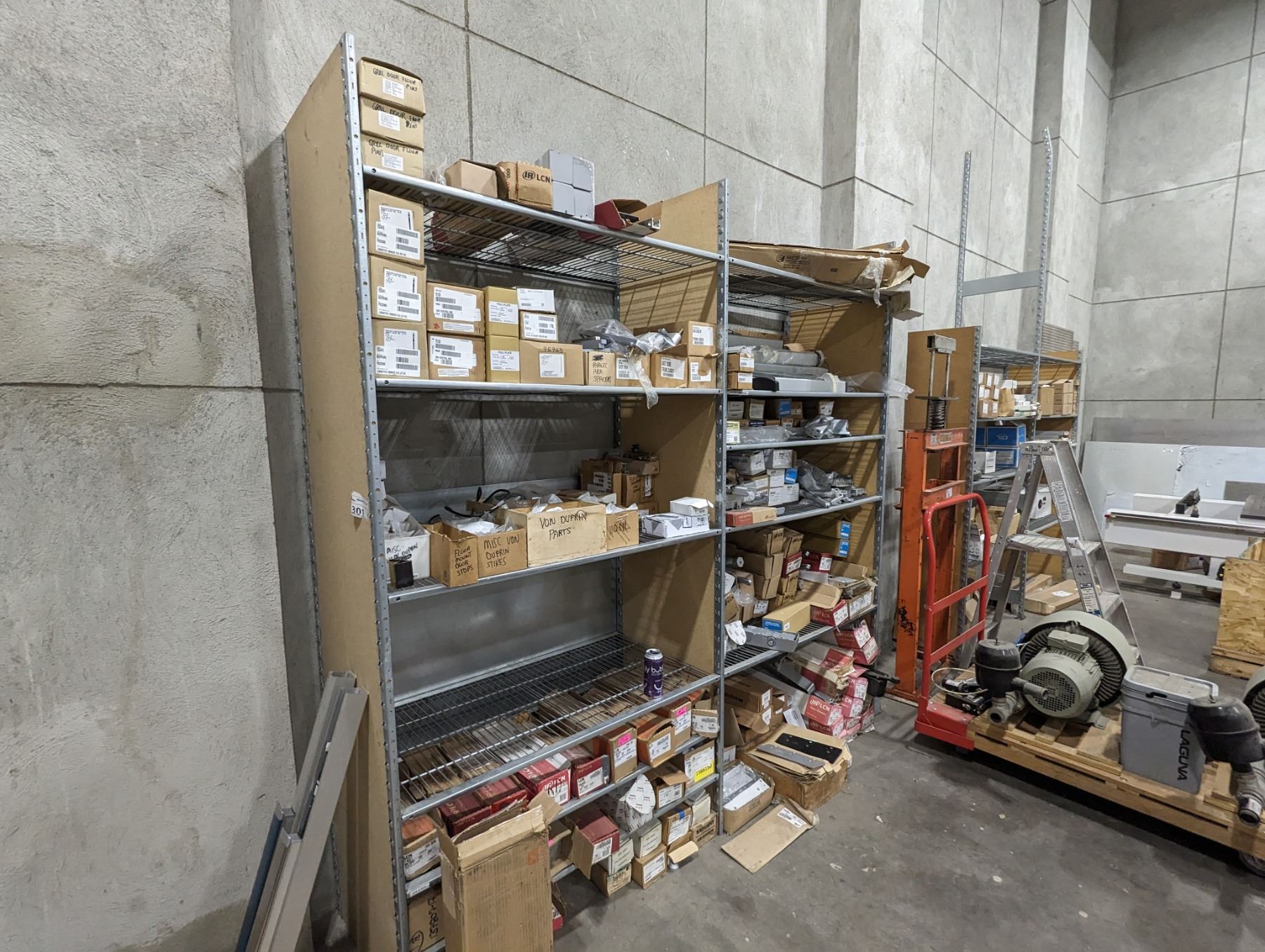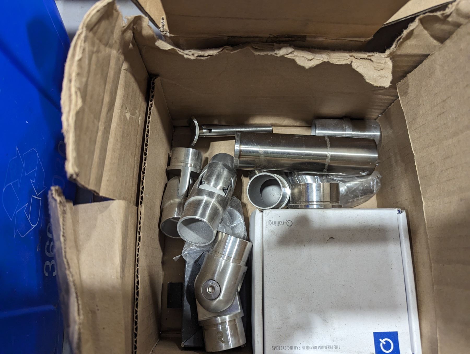 GROUP LOT OF ASST DOOR HARDWARE. REMOTE CONTROL HARDWARE, ASST OF SS RAILING HARDWARE, COUPLERS, ELBOWS, ASST Q-RAILING PARTS (SHIMS, GASKETS), GLASS CLAMPS ETC