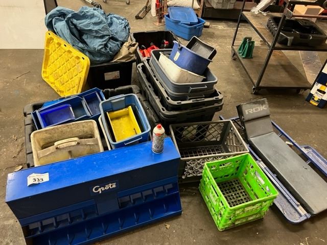 GROUP LOT OF ASST ROK CREEPER, GROTE PRODUCT DISPLAY/SHELF, ASST BINS, BOAT COVERS, FUEL CAN, HAND