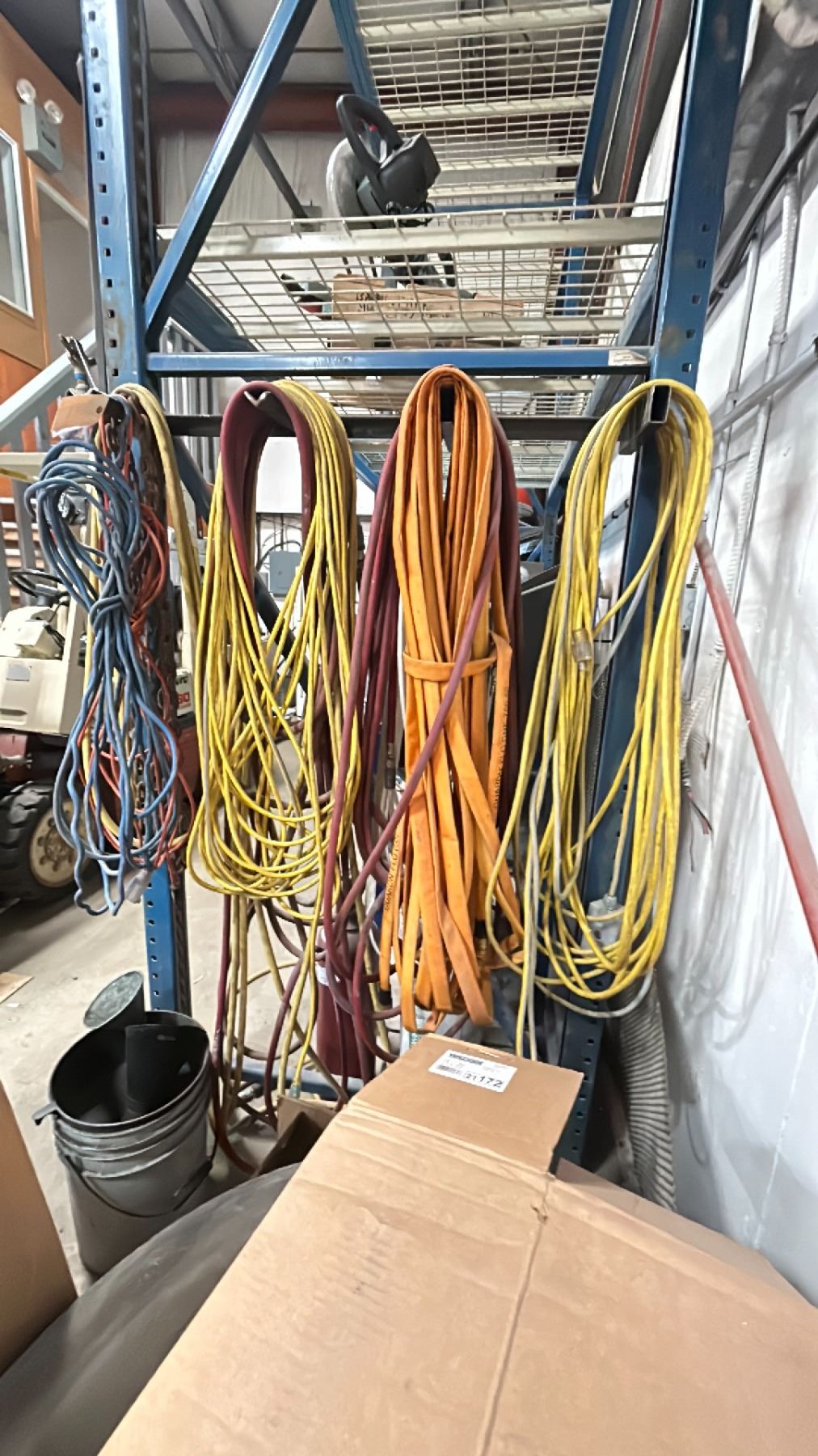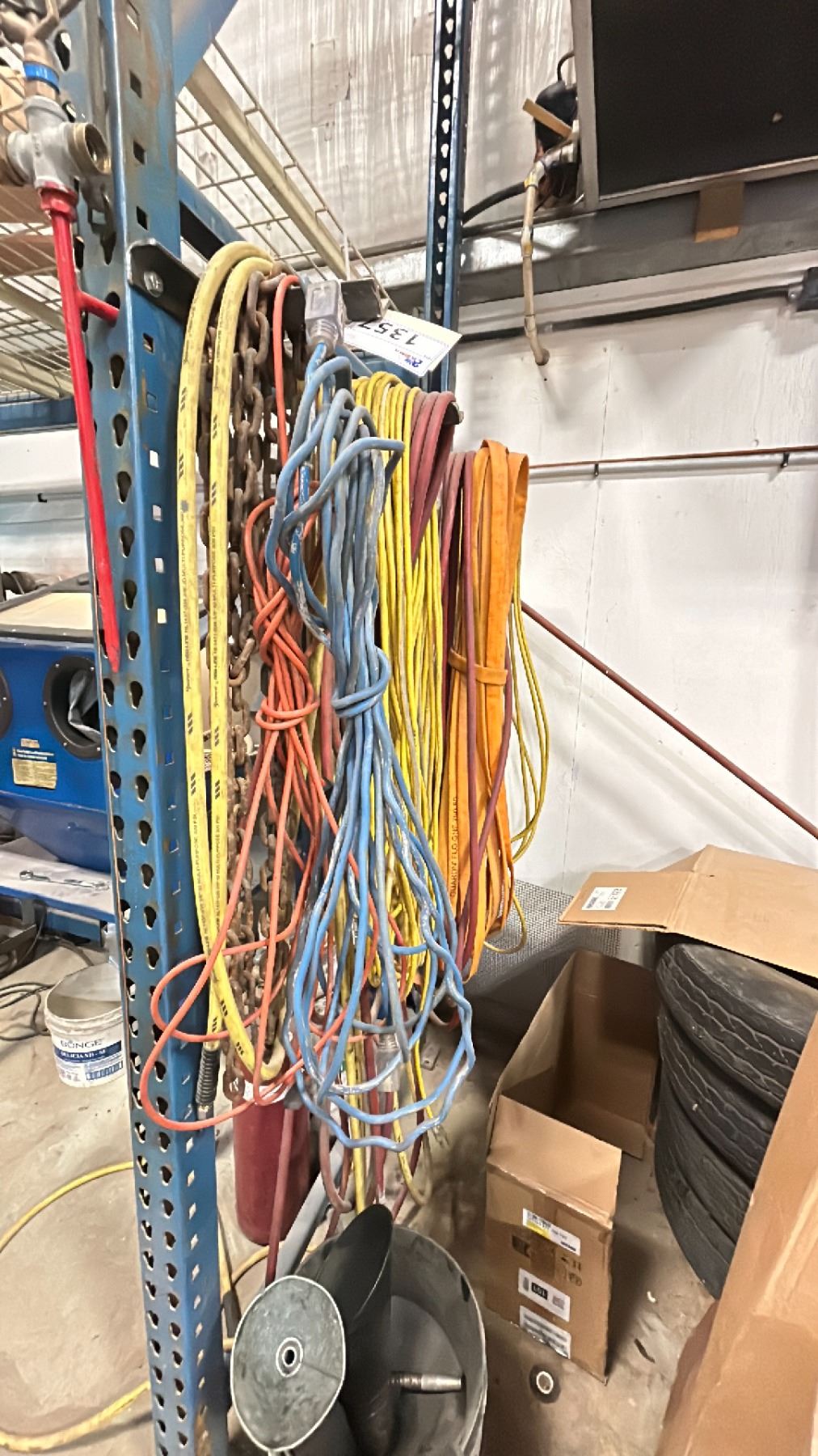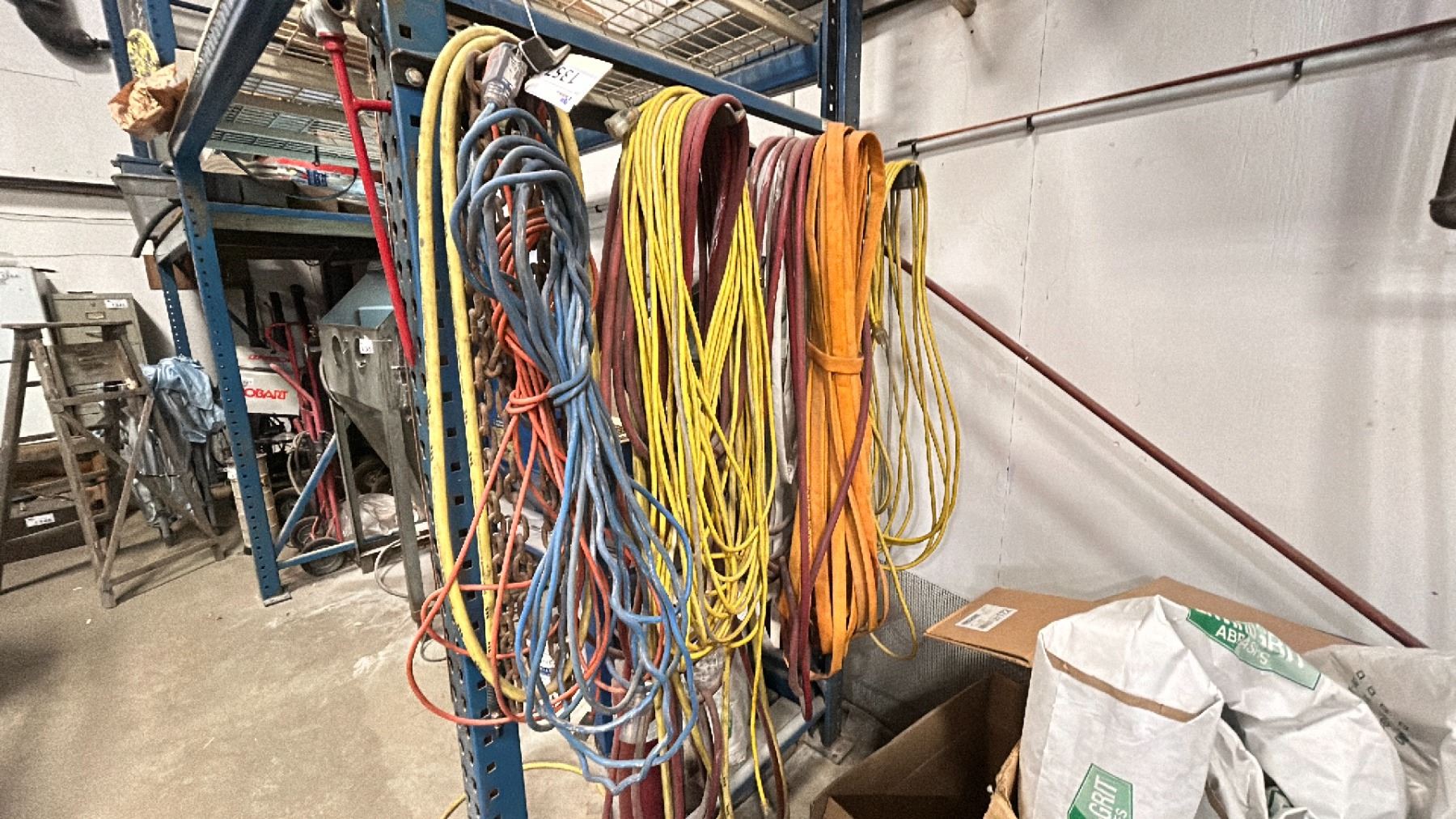 GROUP LOT OF EXTENSION CORDS, HOSES, AIR LINE, CHAIN, SPRINKLER ETC