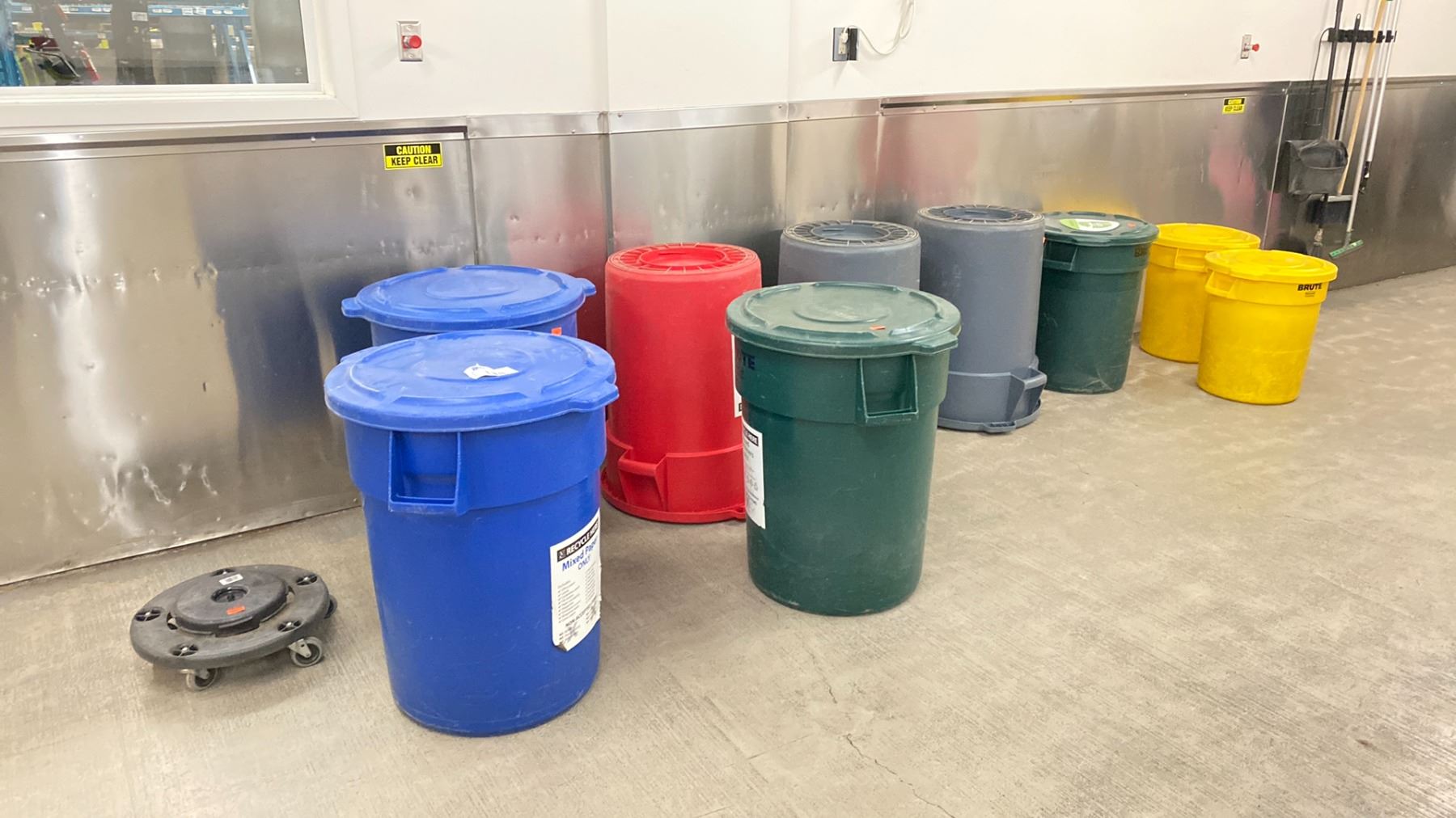 GROUP LOT OF GARBAGE, RECYCLING, GREEN, HAZARDOUS WASTE BINS. GLASS, PAPER, FILM, GARBAGE, ETC. 9 BINS WITH LIDS AND 1 ROLLER. LOCATED IN BOTTLING LINE 1 ROOM.