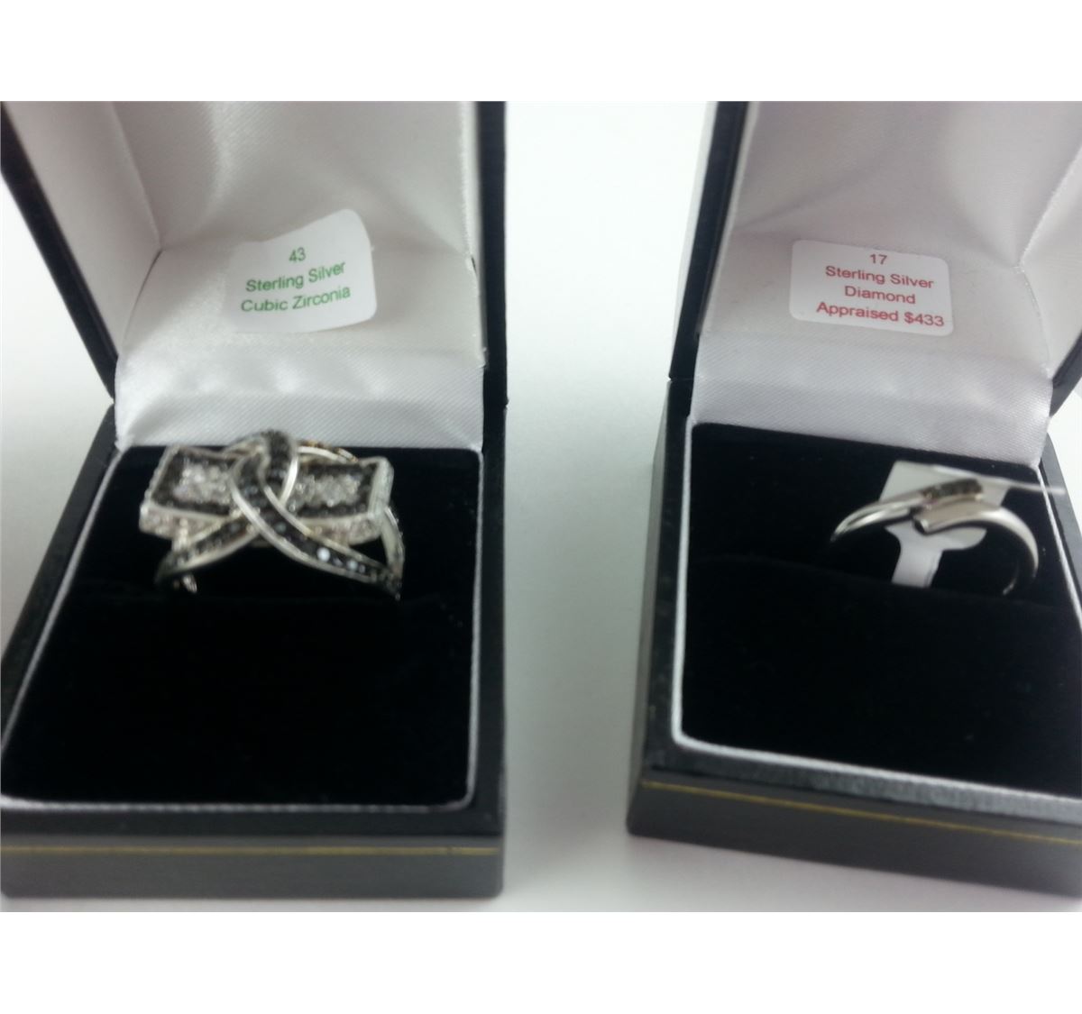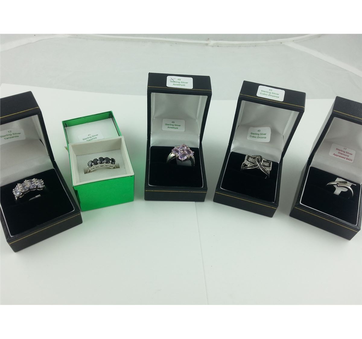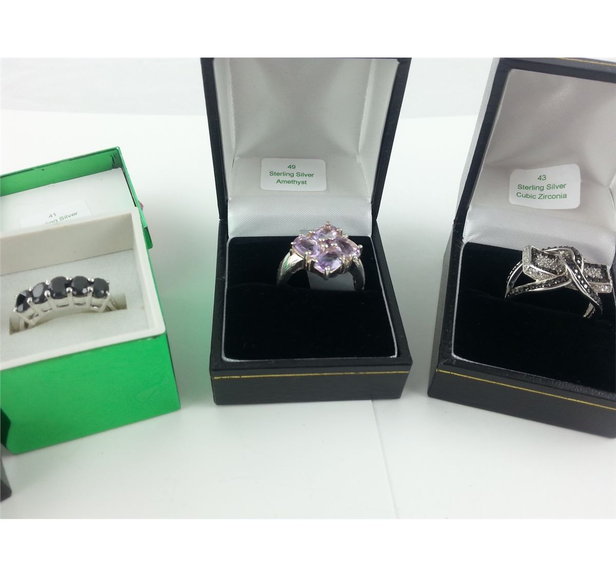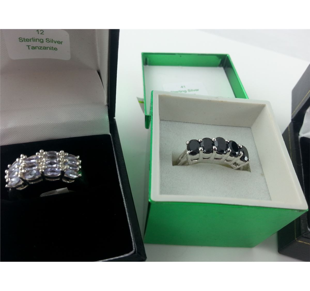 GROUP LOT OF JEWELLERY INCLUDING; STERLING SILVER TAZANITE RING, STERLING SILVER DIAMOND (0.02CARAT) RING, STERLING SILVER SAPPHIRE RING, STERLING SILVER BLACK AND WHITE CUBIC ZIRCONIA RING, AND STERLING SILVER AMETHYST RING