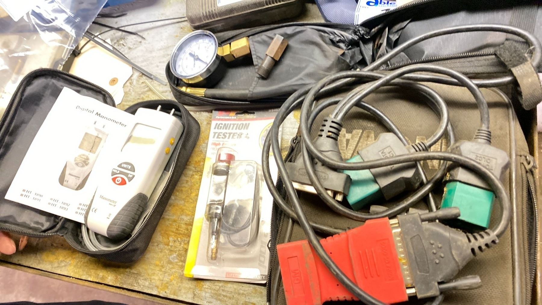 GROUP LOT OF KLEIN COMPRESSION TESTER, DIGITAL NANOMETER, INNOVA ELECTRONIC TEST ADAPTOR CABLES AND PT PERFORMANCE IGNITION TESTER