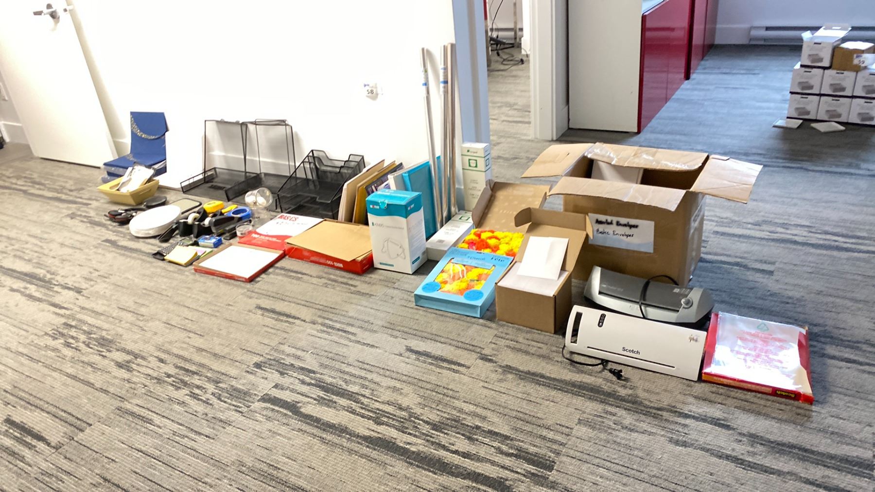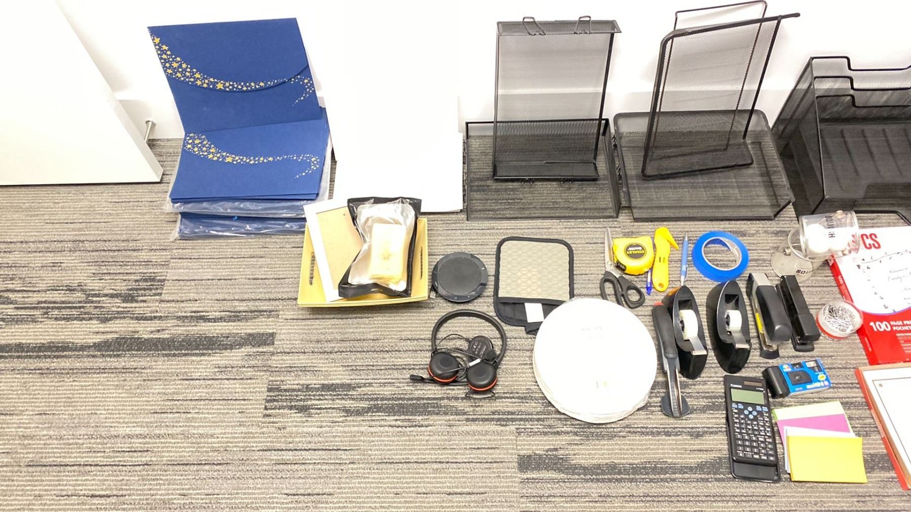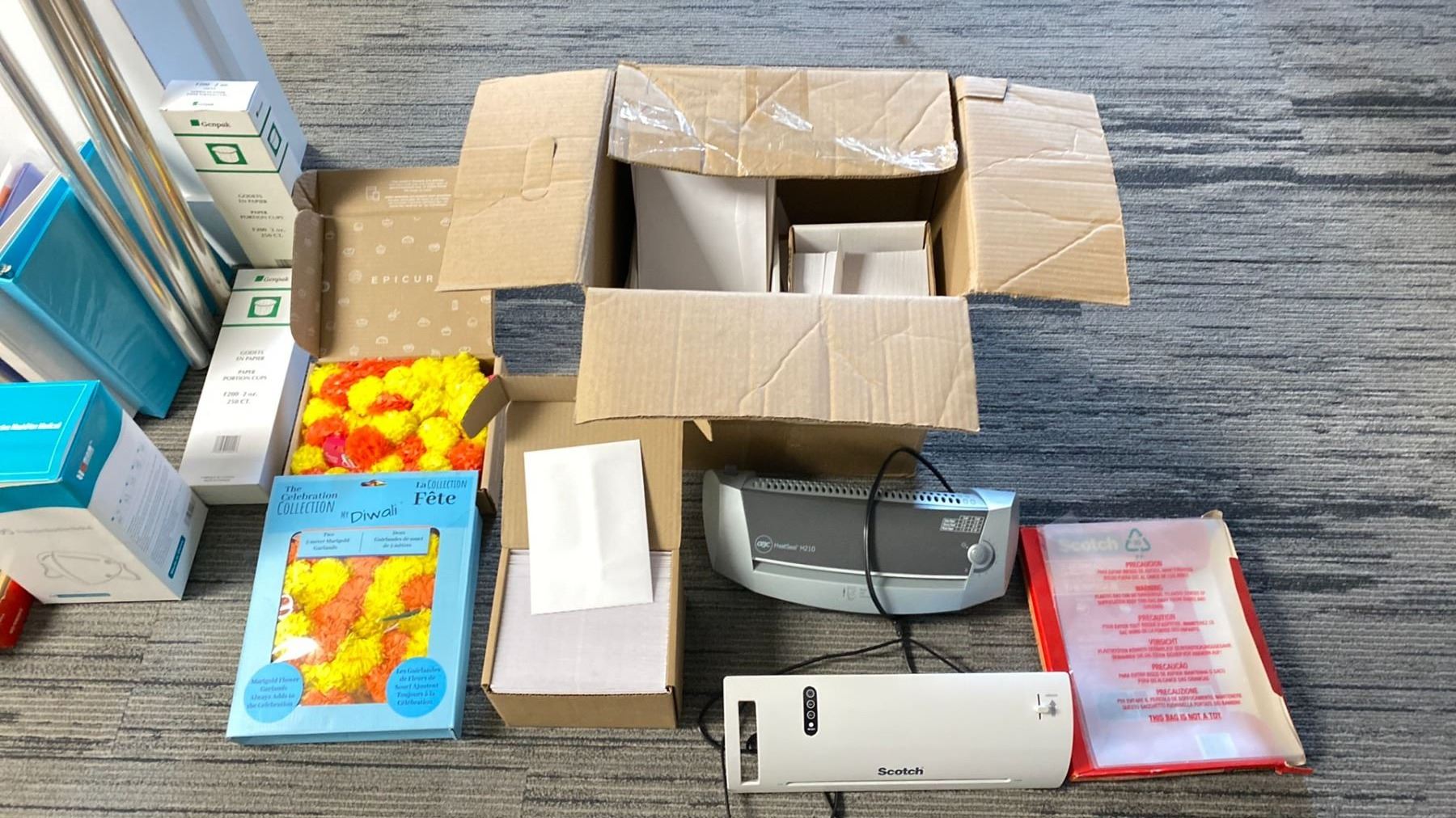 GROUP LOT OF OFFICE SUPPLIES. TAPE DISPENSERS, WRAP PAPER, FLOWER GARLANDS, MASKS, FOLDER, PAPER SORTER, JABRA PHONE SYSTEM, ENVELOPES, SCIENTIFIC CALCULATOR, PAPER, 2 LAMINATORS WITH SHEETS, BINDERS, PAPER PORTION CUPS, WRAPPING PAPER
