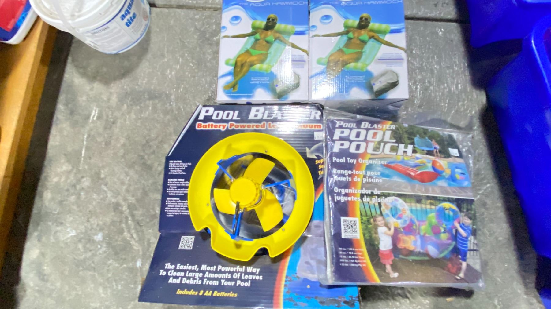GROUP LOT OF POOL BLASTER LEAF VACUUM, POOL BLASTER POOL TOY POUCH, 2 X AQUA HAMMOCKS