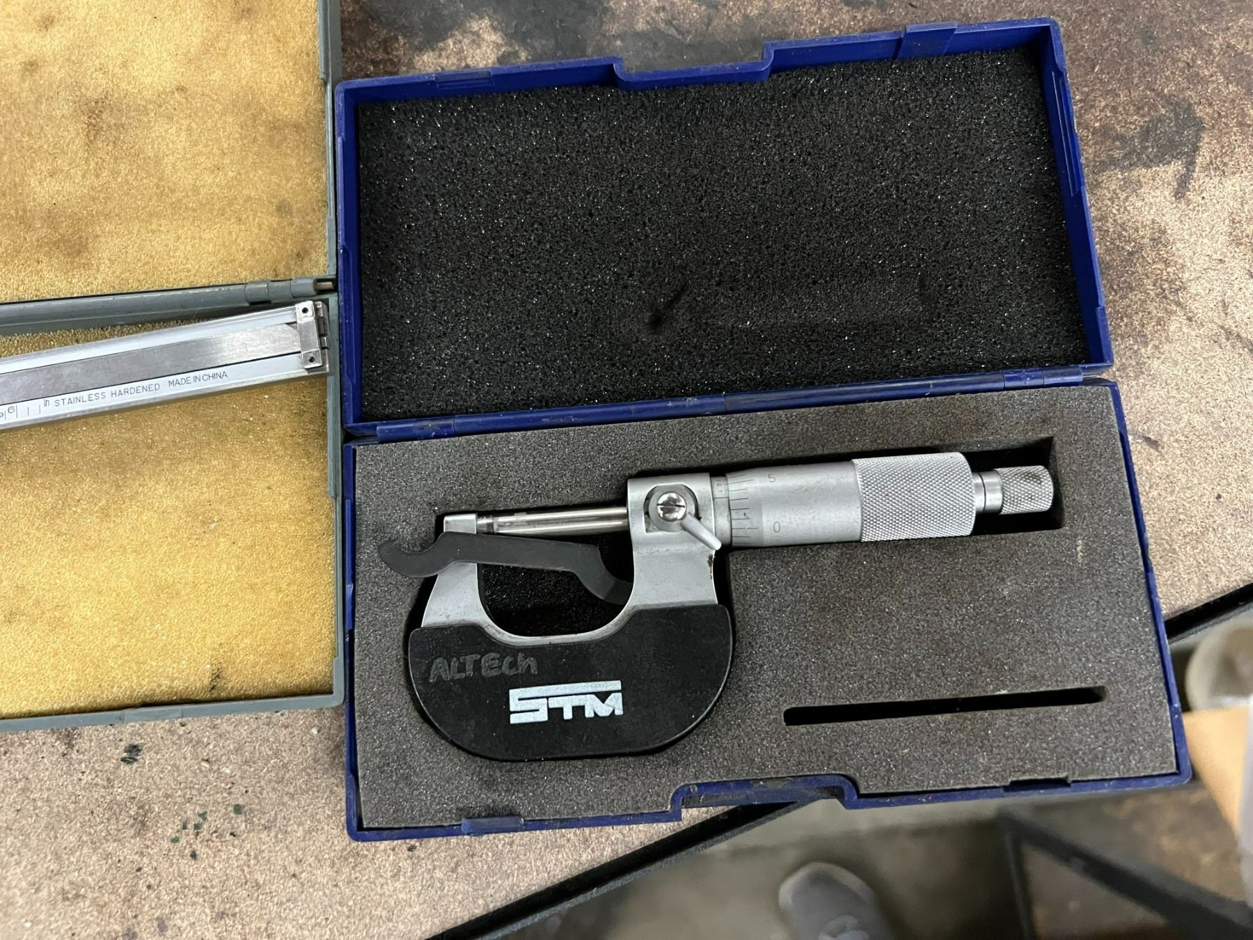 GROUP LOT OF PRECISION MEASURING TOOLS. 6" BERNIER CALIPER, 1" STN MICROMETER, 4"-8" DEPTH MICROMETER, LINER PROTUSION GAUGE, MITUTOYO DEPTH MICROMETER UP TO 9", MITUTOYO MICROMETER 0-6"