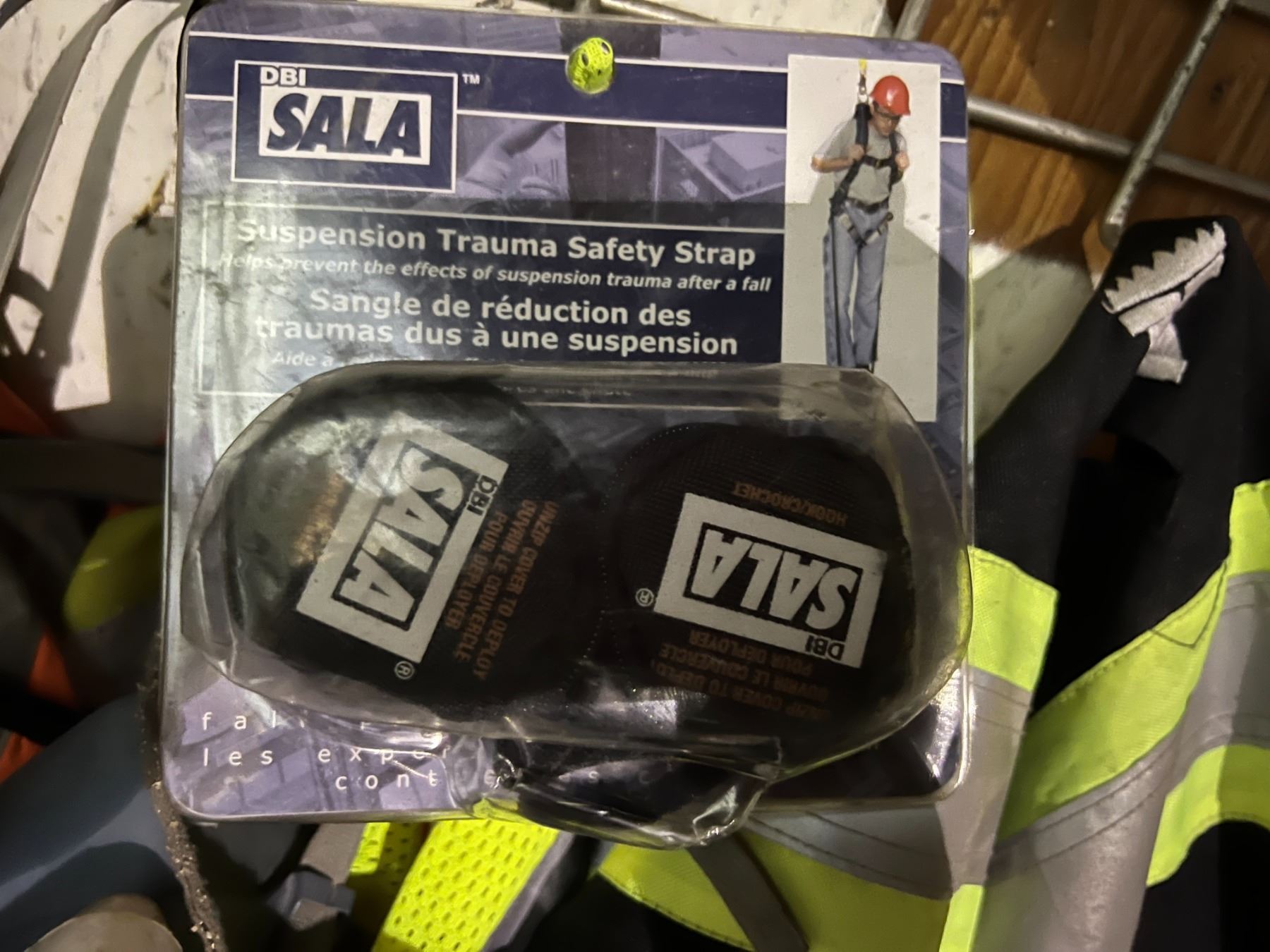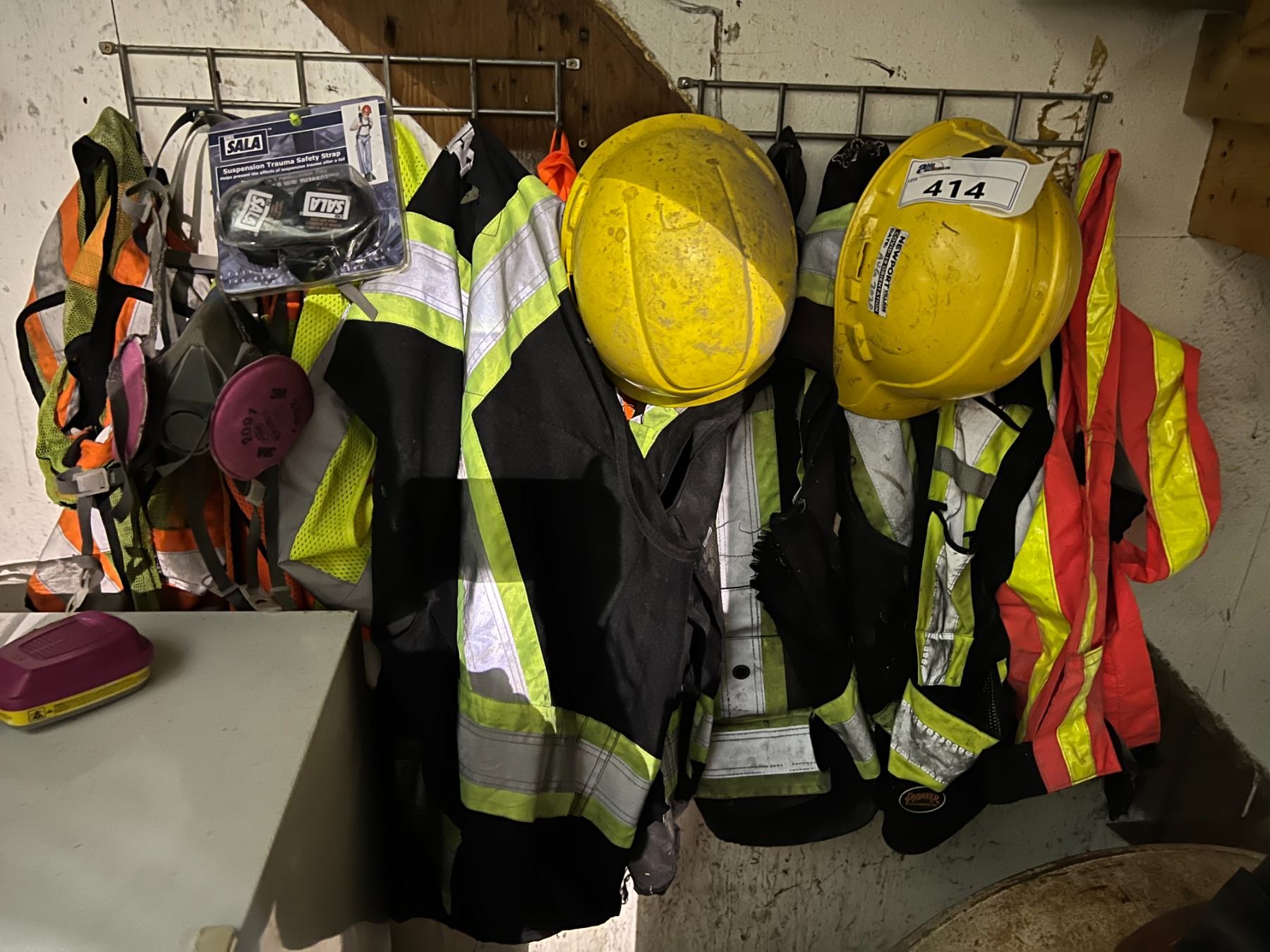 GROUP LOT OF SAFETY TYPE ITEMS - SUSPENSION TRAUMA SAFETY STRAP, HIGH-VIS VESTS, RESPIRATORS & HARD HATS