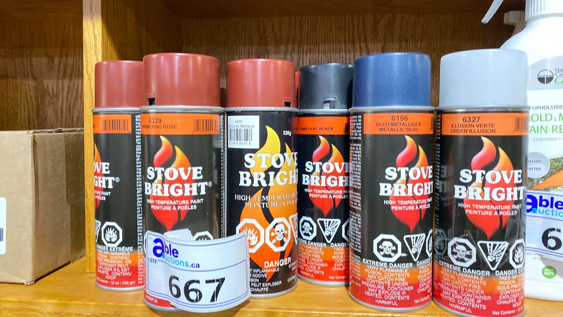 GROUP LOT OF STOVE BRIGHT HIGH TEMP PAINT TINS. 5X SHIMMERING ROSE, 2X MOJAVE RED, BLACK, METALLIC