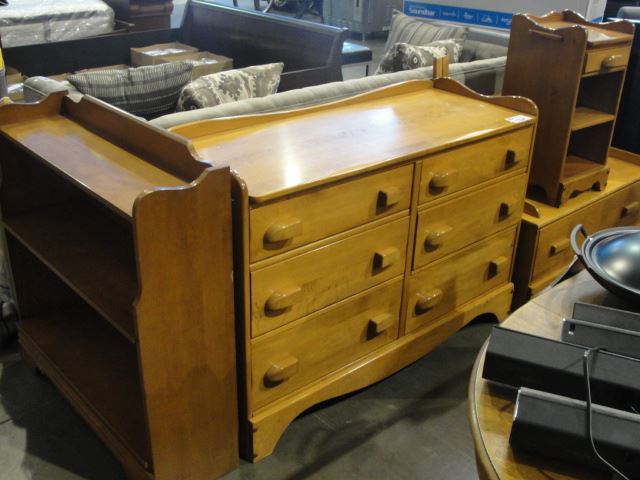 GROUP LOT OF VILAS SOLID MAPLE FURNITURE; 6 DRAWER DRESSER WITH MIRROR AND MATCHING NIGHT STAND WITH FOOT OF THE BED STORAGE BENCH AND SMALL BOOKSHELF