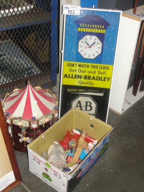 GROUP LOT OF VINTAGE A AND B QUALITY ADVERTISEMENT CLOCK, TOY CAROUSEL AND BOX OF ASSORTED VINTAGE TOYS